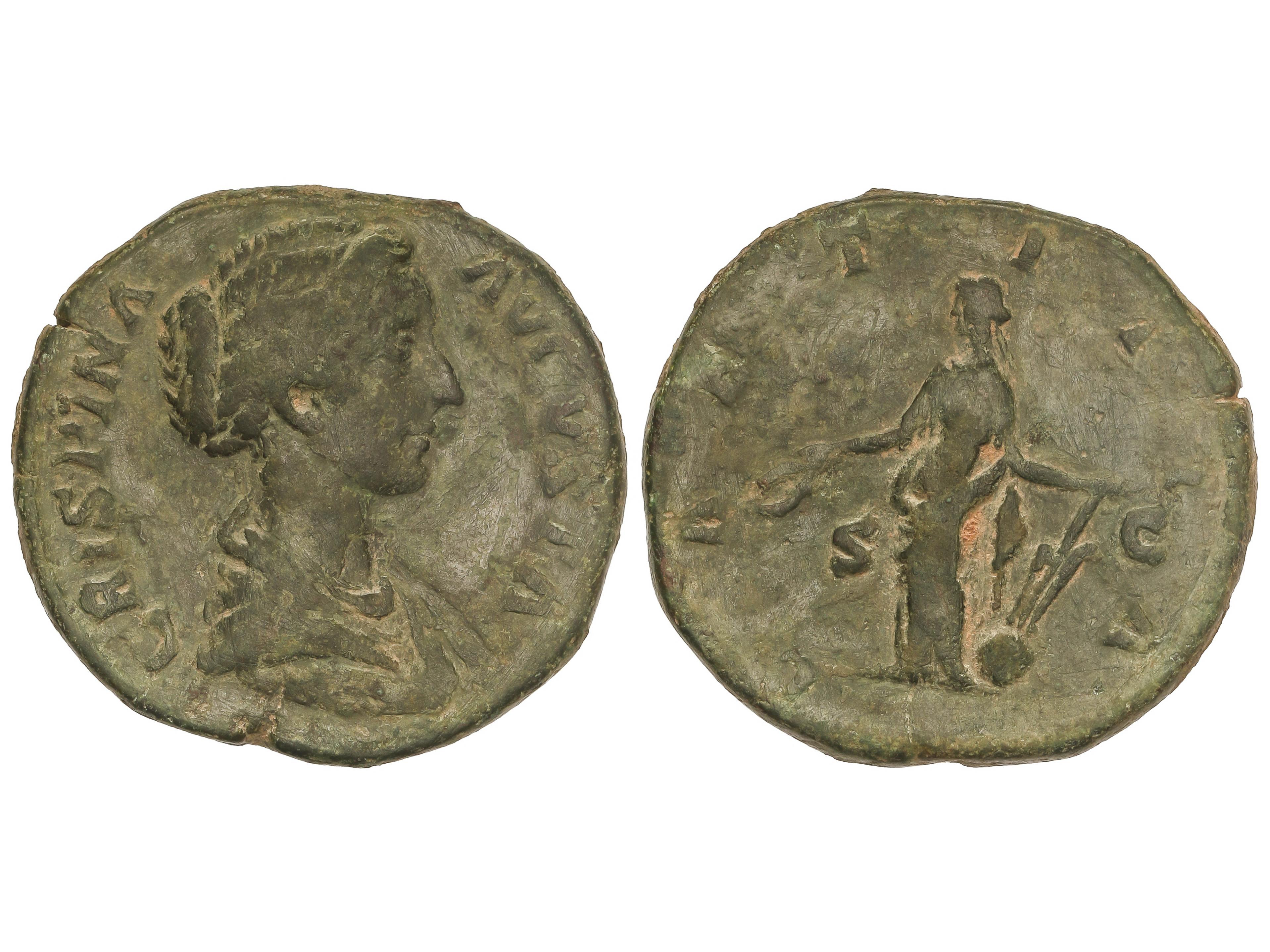 Sestercio. 183 d.C. CRISPINA. Anv.: CRISPINA AVGVSTA. Busto a derecha. Rev.: LAETITIA S. C. Alegría en pie a izquierda con guirnalda y timón sobre globo. 22,86 grs. AE. C-28. MBC-. (Image1)