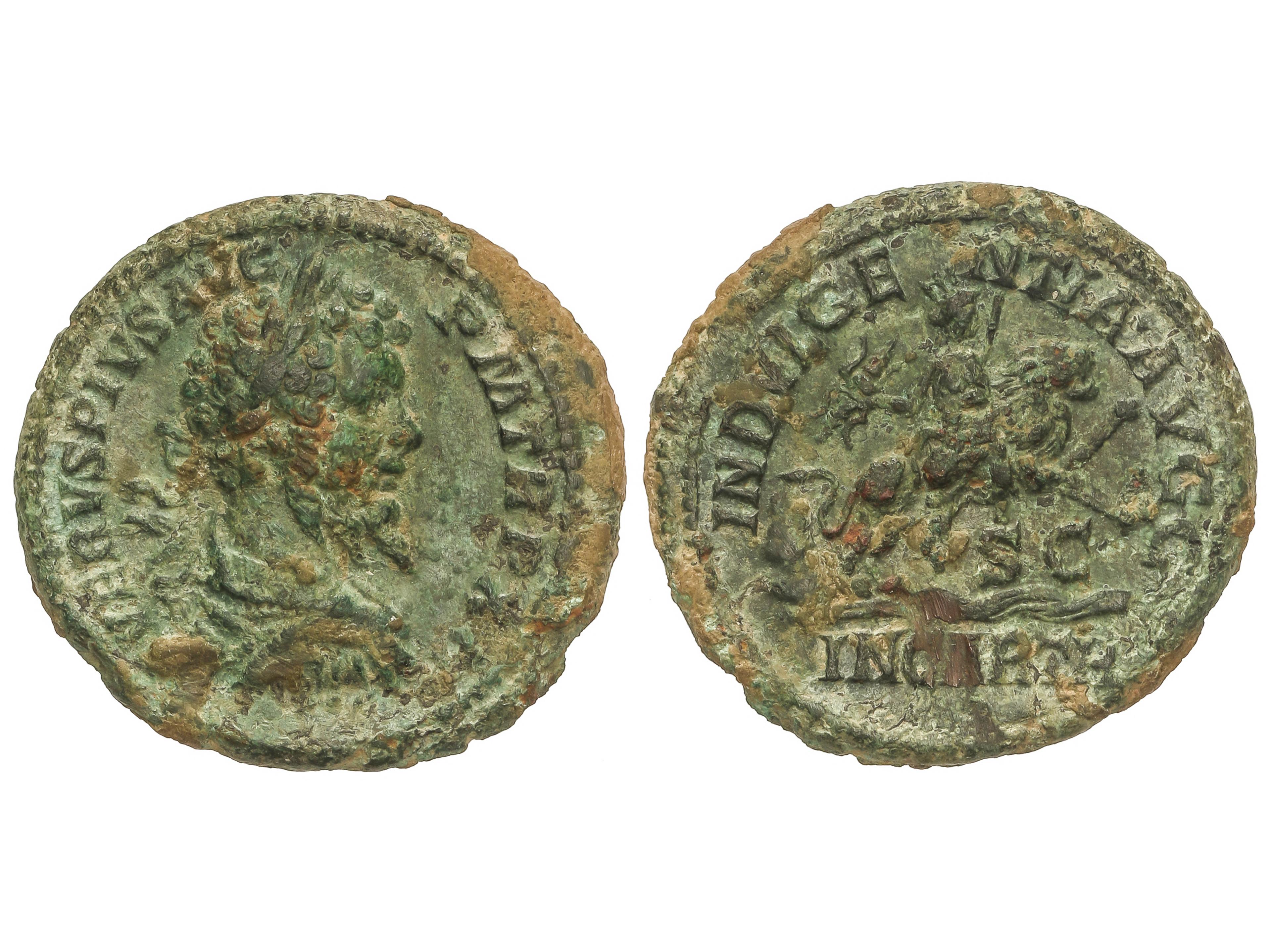As. 203 d.C. SEPTIMIO SEVERO. Anv.: SEVERVS PIVS AVG P. M. TR. P XI. Busto laureado a derecha. Rev.: INDVLGENTIA AVGG / IN CARTH. Celestis sobre león a derecha. 11,56 grs. AE. (Oxidaciones). Pátina verde. ESCASA.