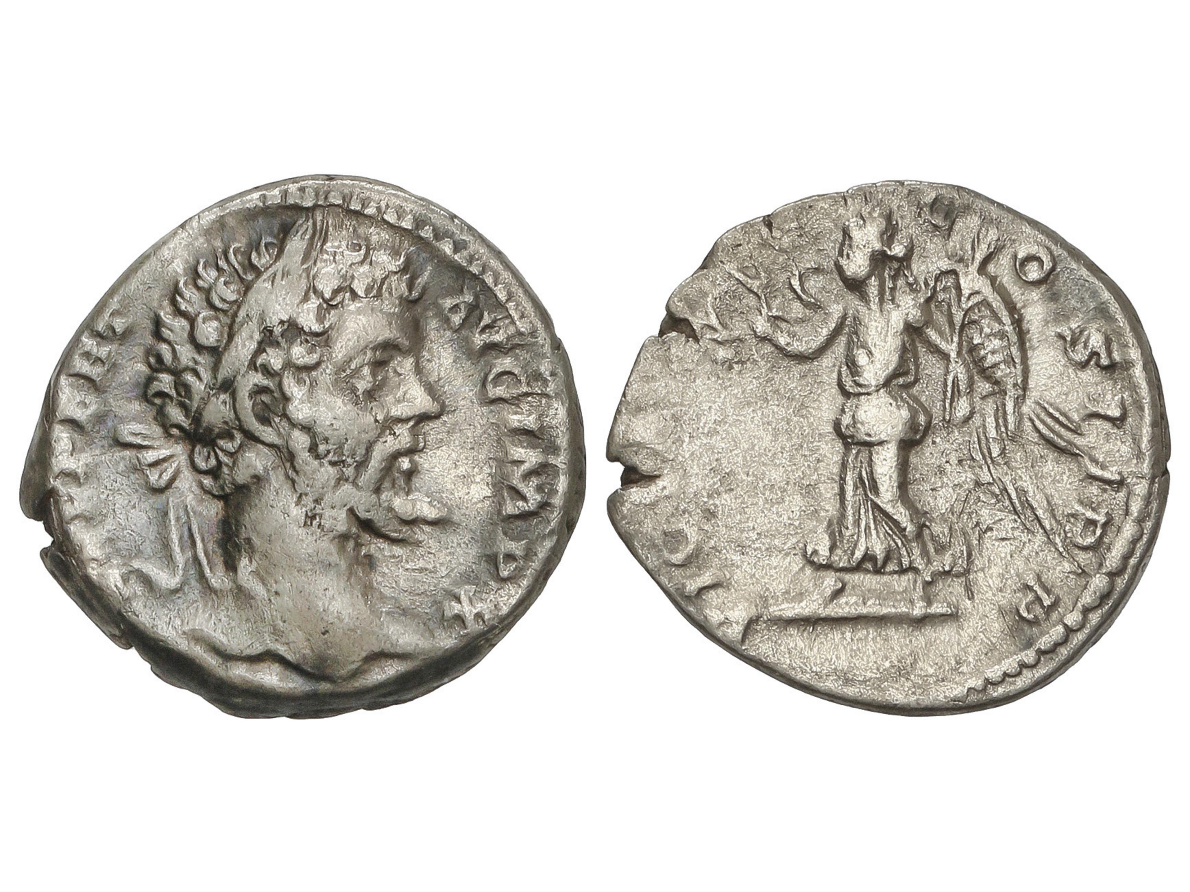 Denario. 197-198 d.C. SEPTIMIO SEVERO. Anv.: L. SEPT. SEV. PERT. AVG. IMP. X. Cabeza laureada a derecha. Rev.: VICT. AVGG. COS. II P. P. Victoria a izquierda. 2,52 grs. AR. (Oxidaciones). C-694; RIC-120.
