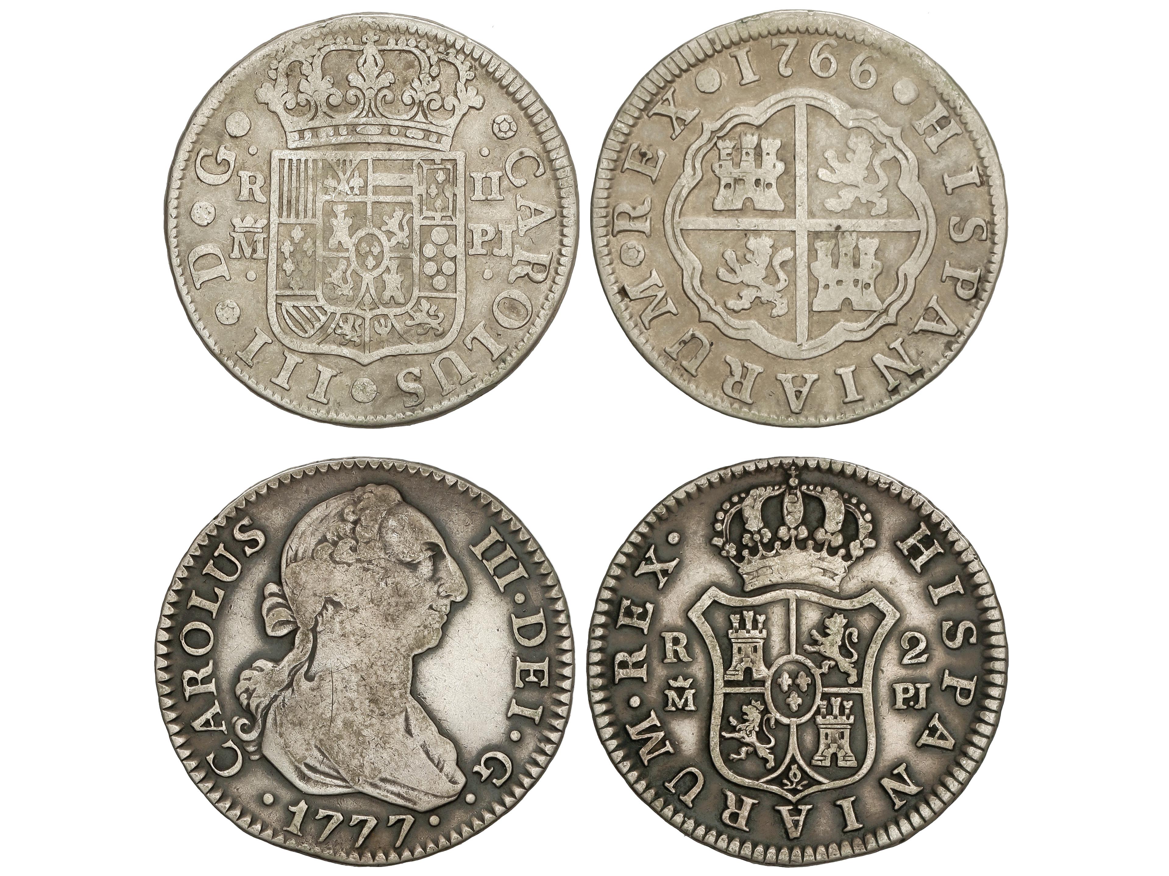 Lote 2 monedas 2 Reales. 1766 y 1777. MADRID. P. J. 5,54 y 5,77 grs. AC-614, 626. MBC-. (Image1)