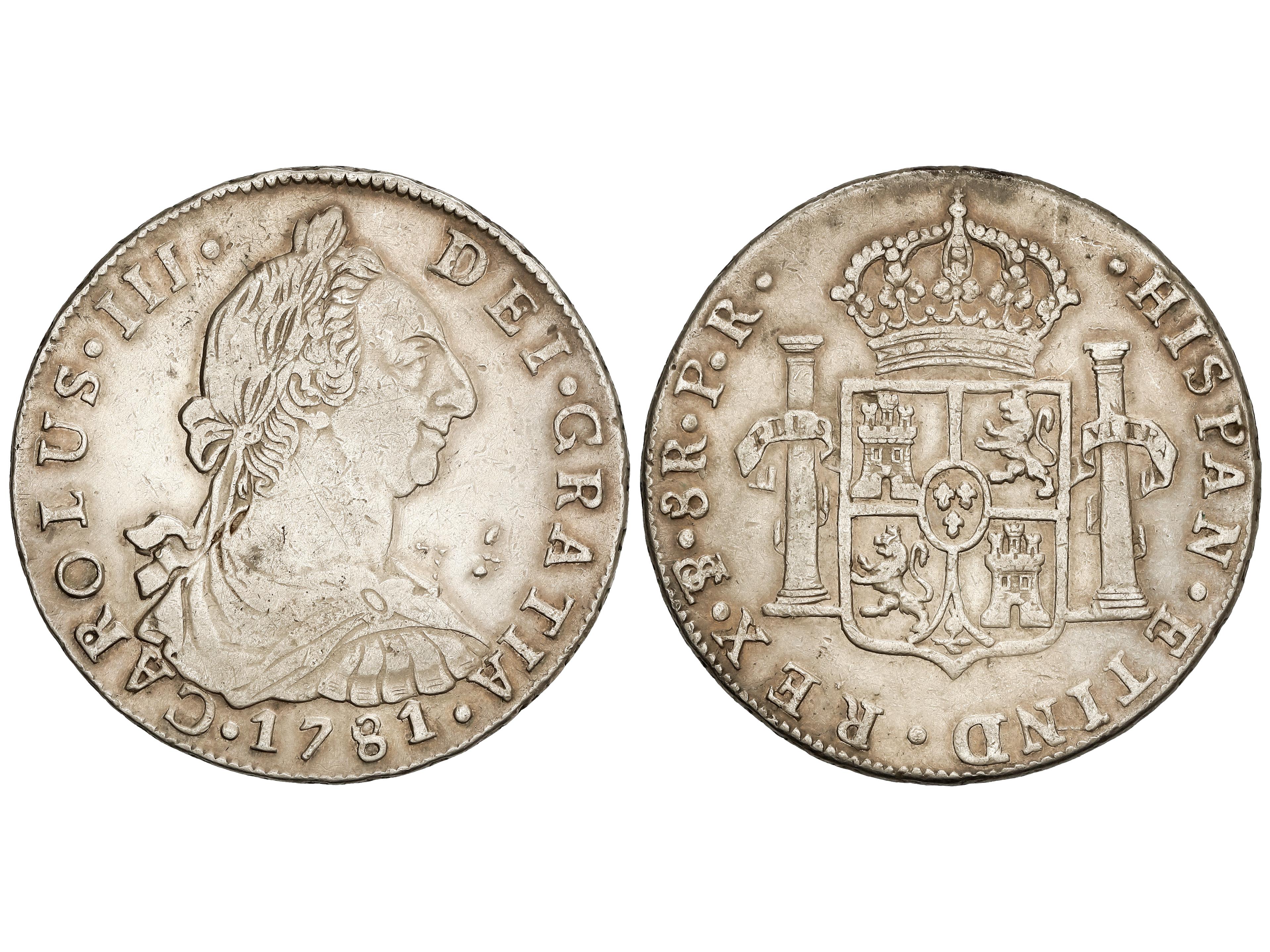 8 Reales. 1781. POTOSÍ. P. R. 26,58 grs. (Sobrantes de metal en anverso). AC- 1180. MBC. (Image1)