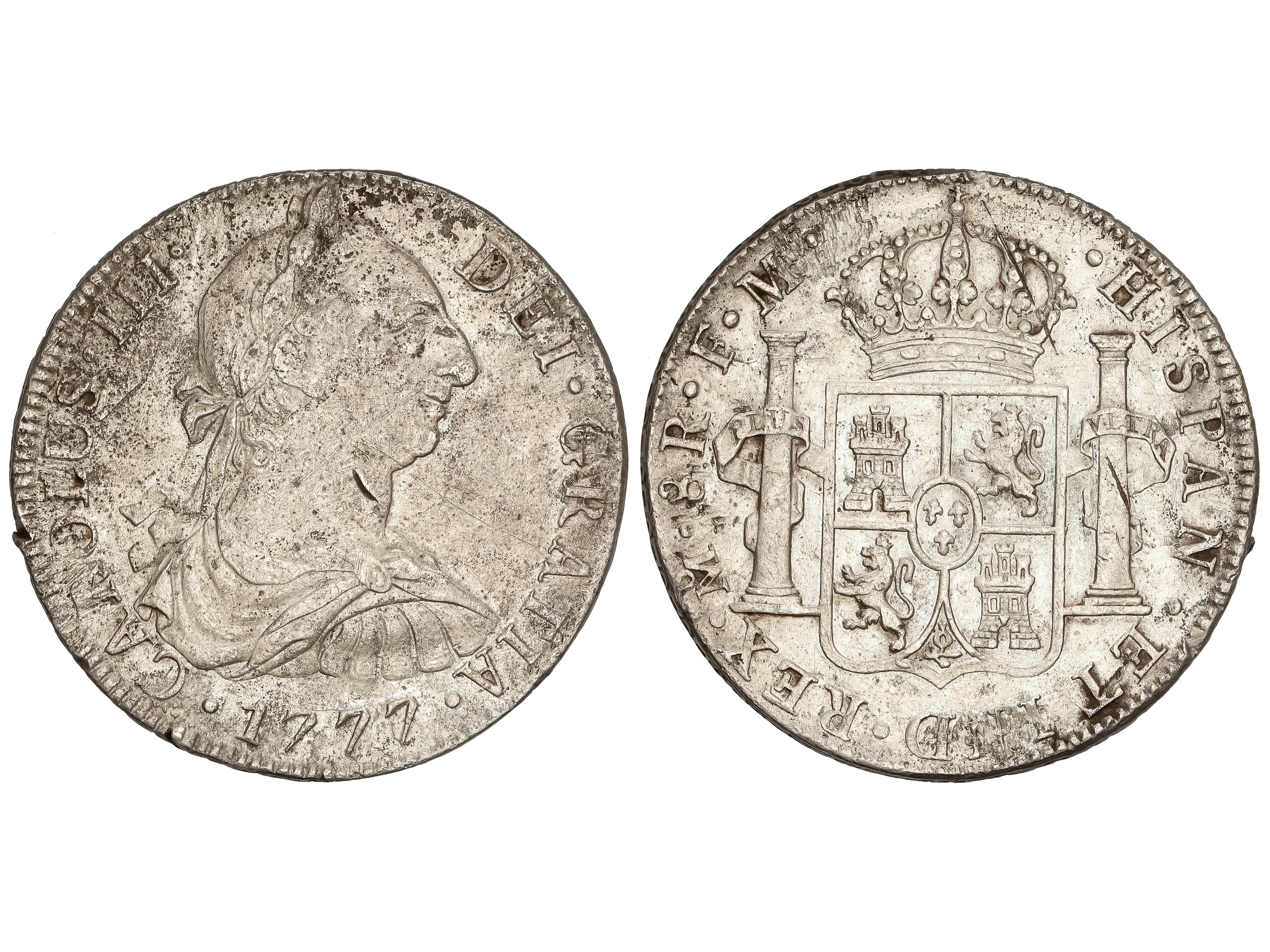8 Reales. 1777. MÉXICO. F.M. 26,45 grs. (Rayitas, prueba de metal en canto y leves oxidaciones). AC-1112. (MBC/MBC+).