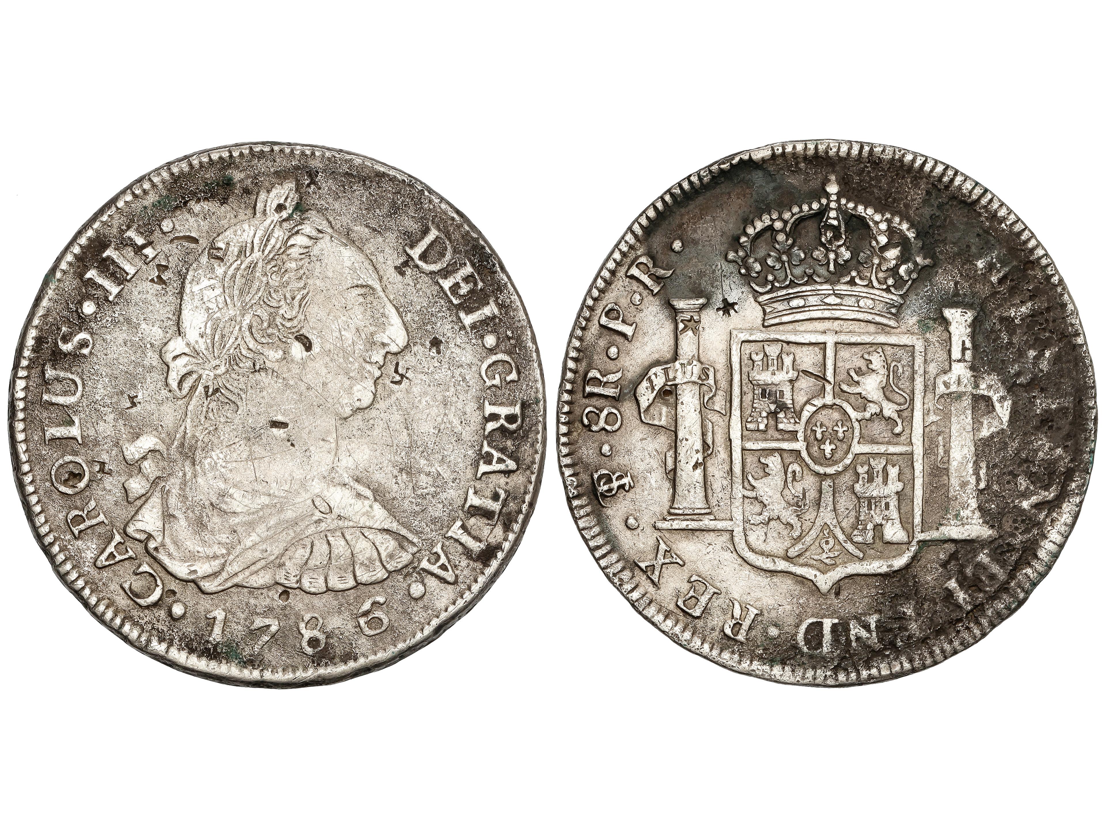 8 Reales. 1786. POTOSÍ. P.R. 26,48 grs. (Resellos y oxidaciones, algunas limpiadas). AC-1192. MBC. (Image1)