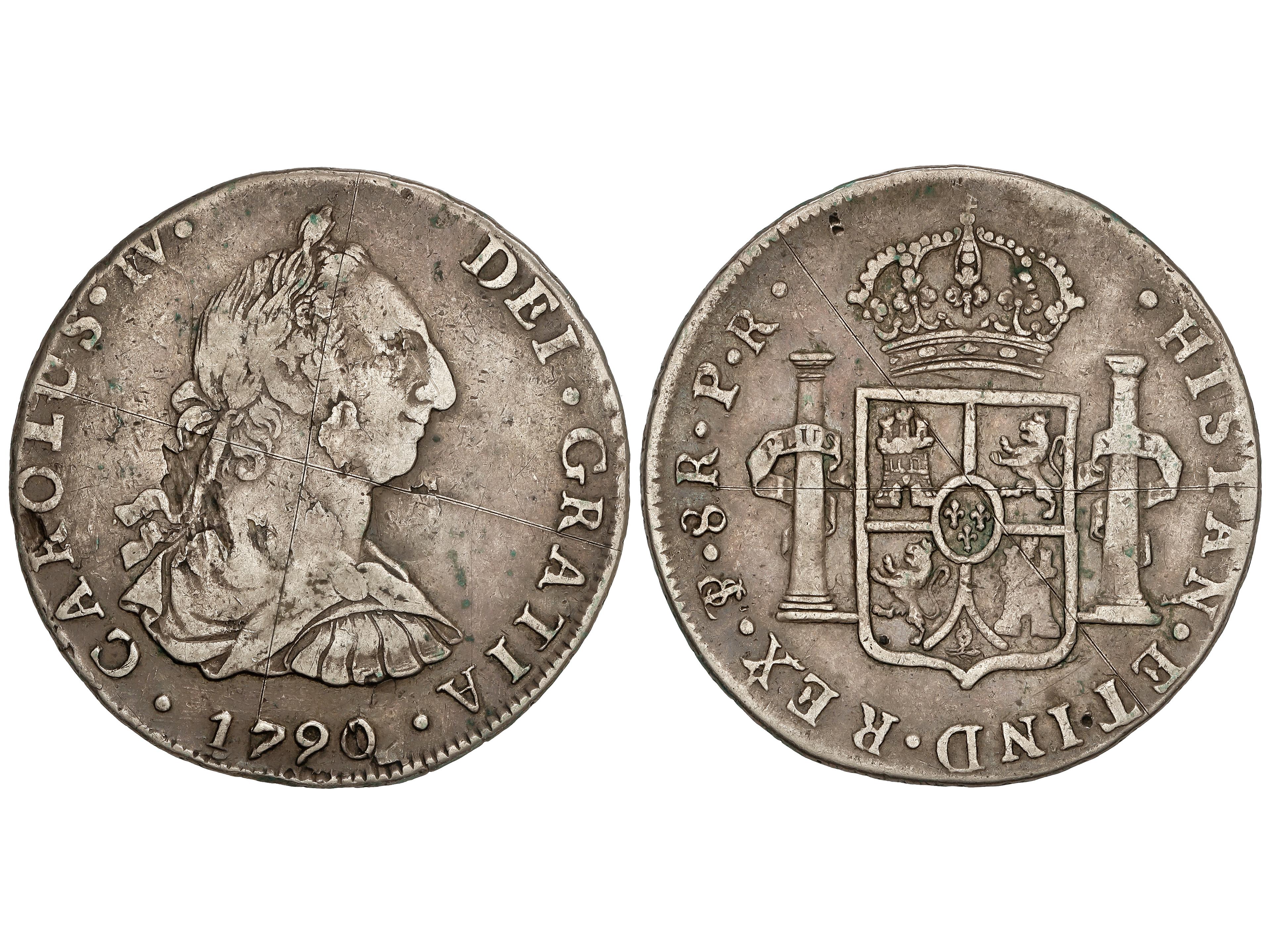 8 Reales. 1790. POTOSÍ. P.R. 26,73 grs. Busto de Carlos III, ordinal IV. (Rayas en cruz en anverso y reverso). Pátina. AC-990. MBC-. (Image1)