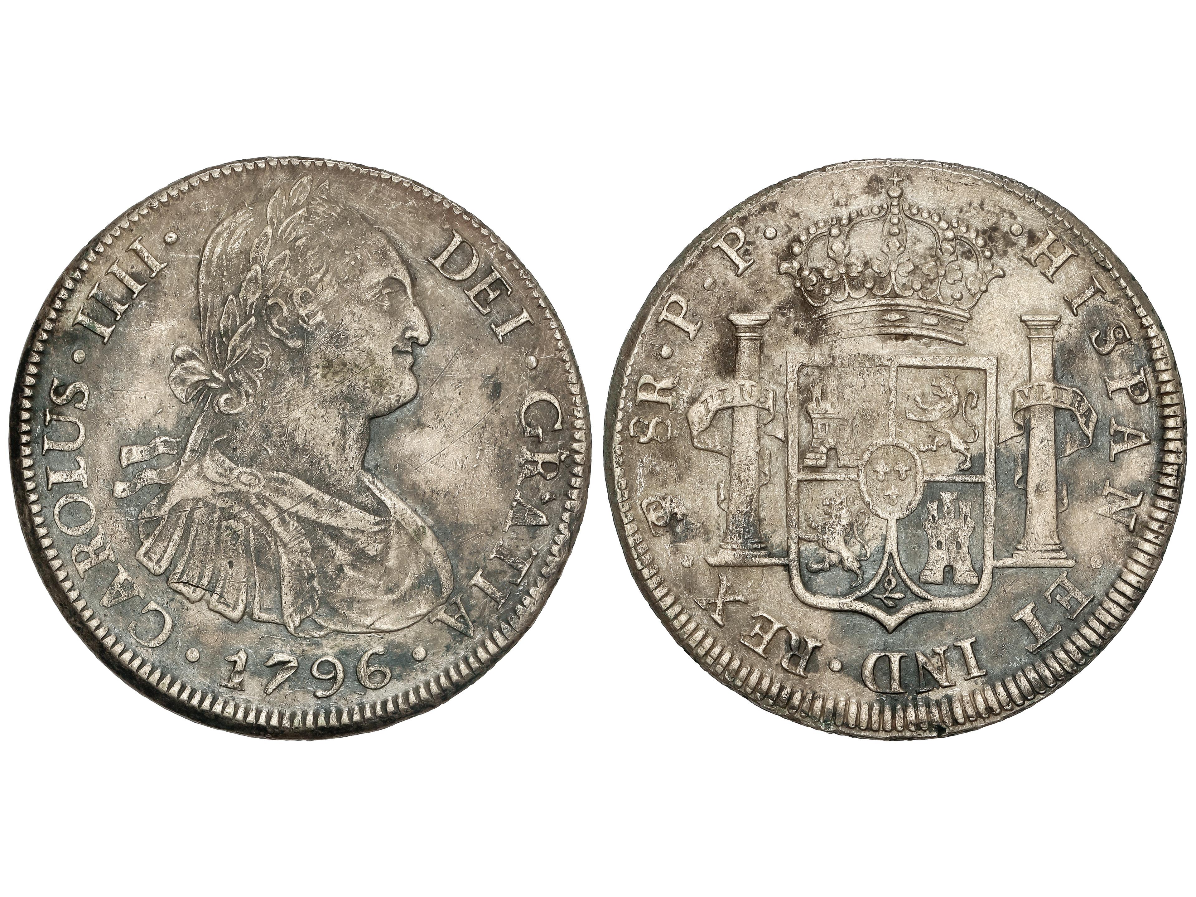 8 Reales. 1796. POTOSÍ. P.P. 26,64 grs. (Pequeñas rayitas). Pátina negra irregular. AC-1000. MBC. (Image1)