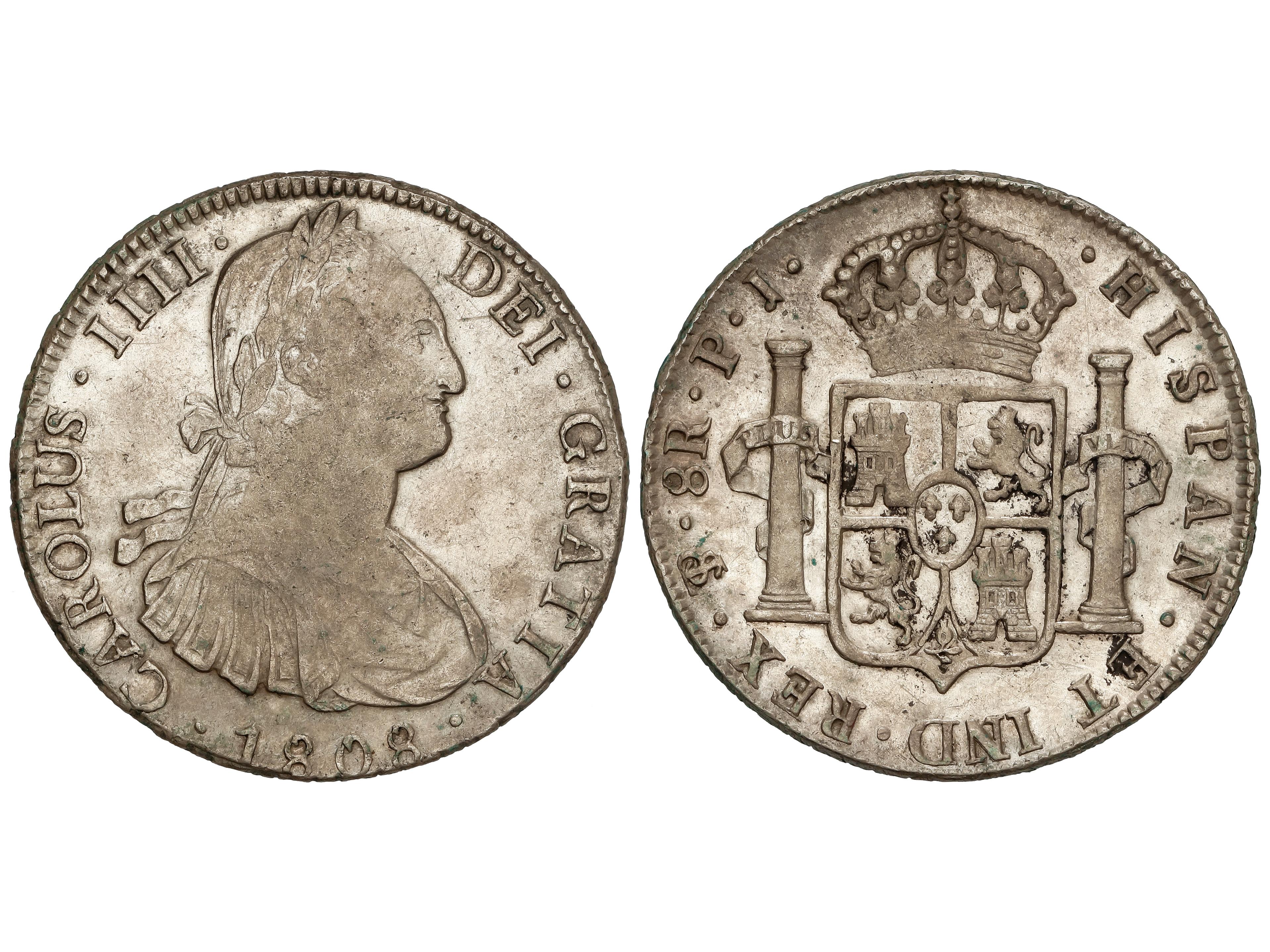8 Reales. 1808. POTOSÍ. P.J. 26,49 grs. Acuñación algo floja en parte. Ligera pátina irregular. AC-1014. MBC+.