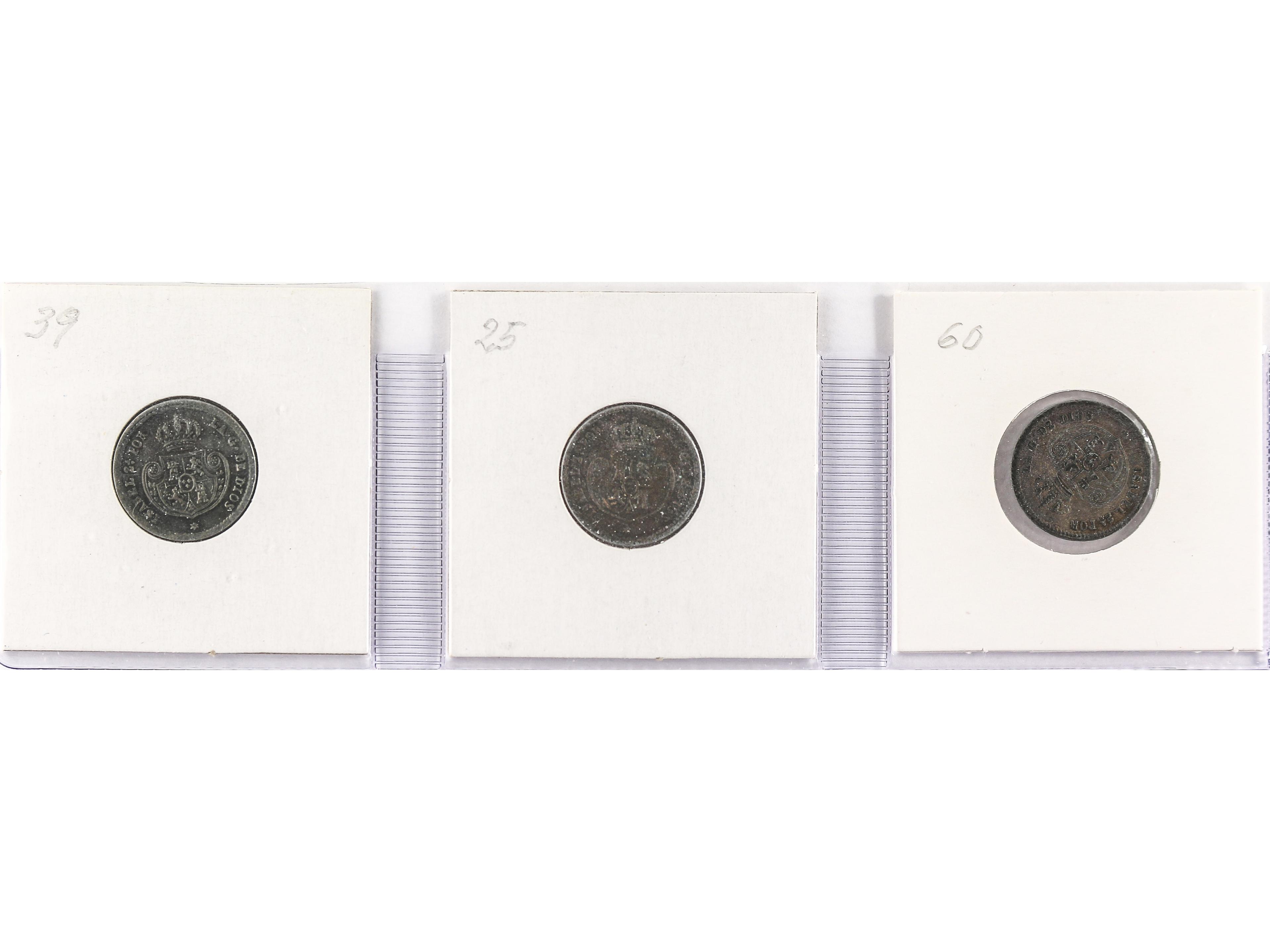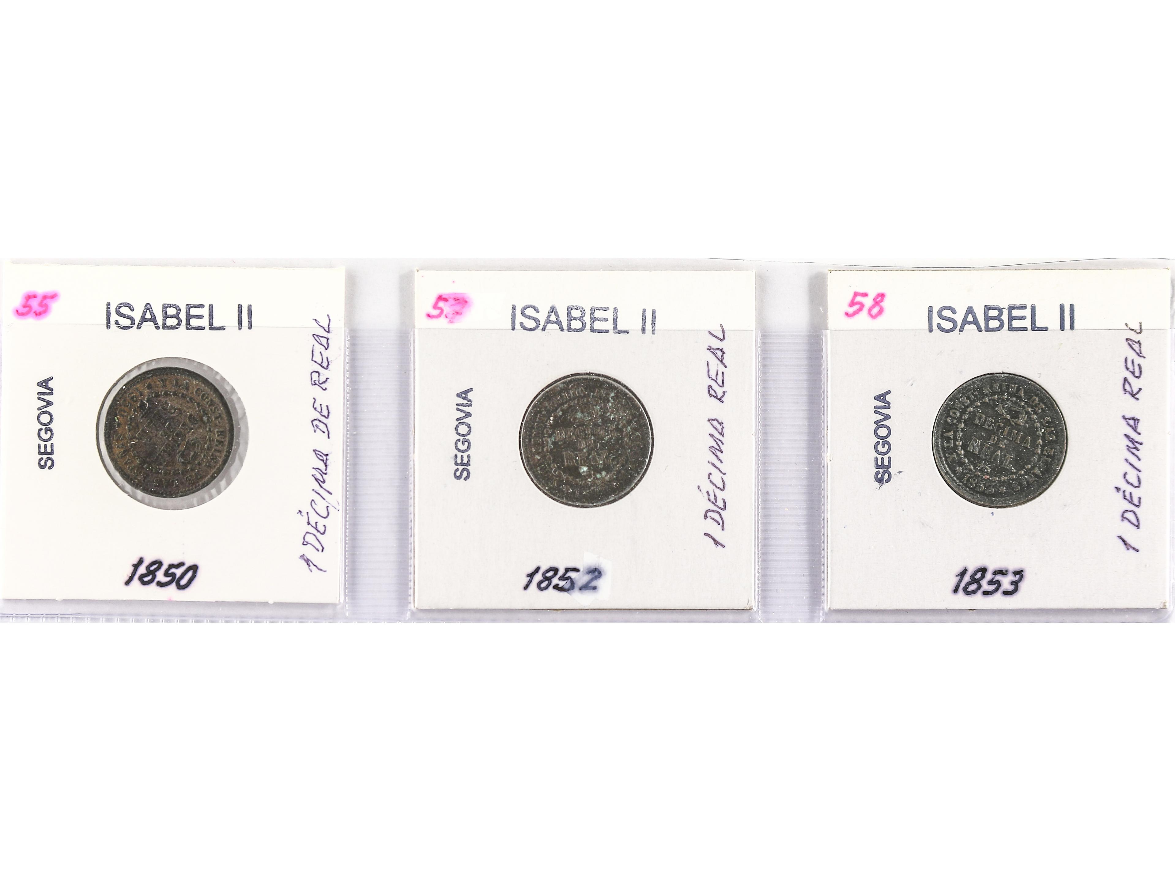 Lote 3 monedas 1 Décima de Real. 1850, 52 y 53. SEGOVIA. (La de 52 con oxidaciones). AC- 141, 144, 146. MBC+ a MBC- .