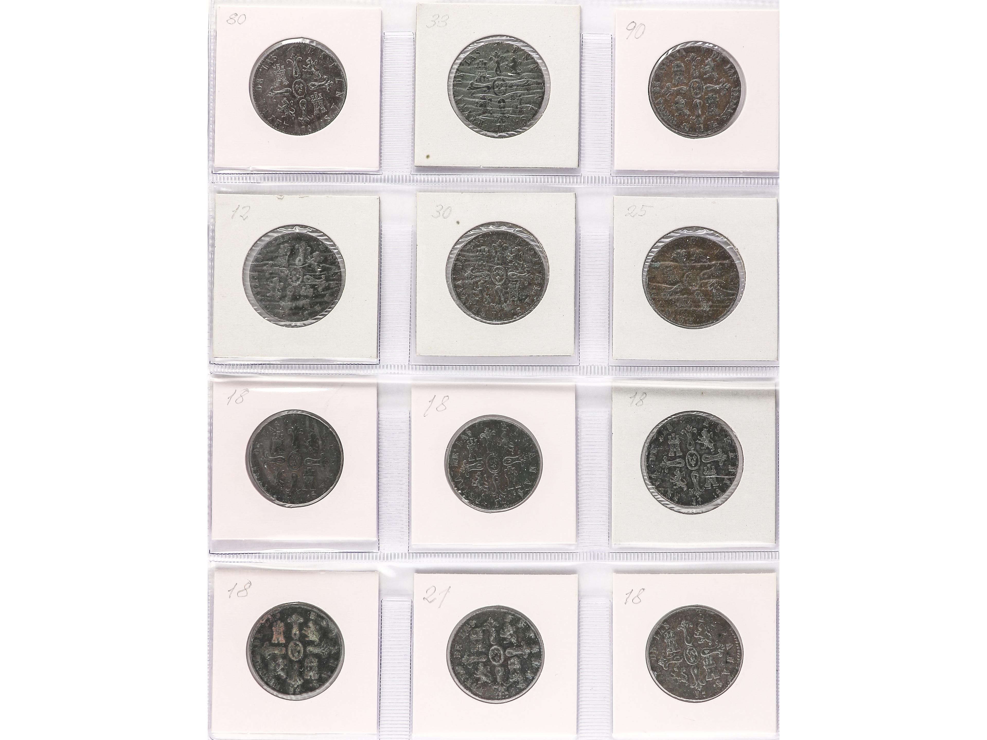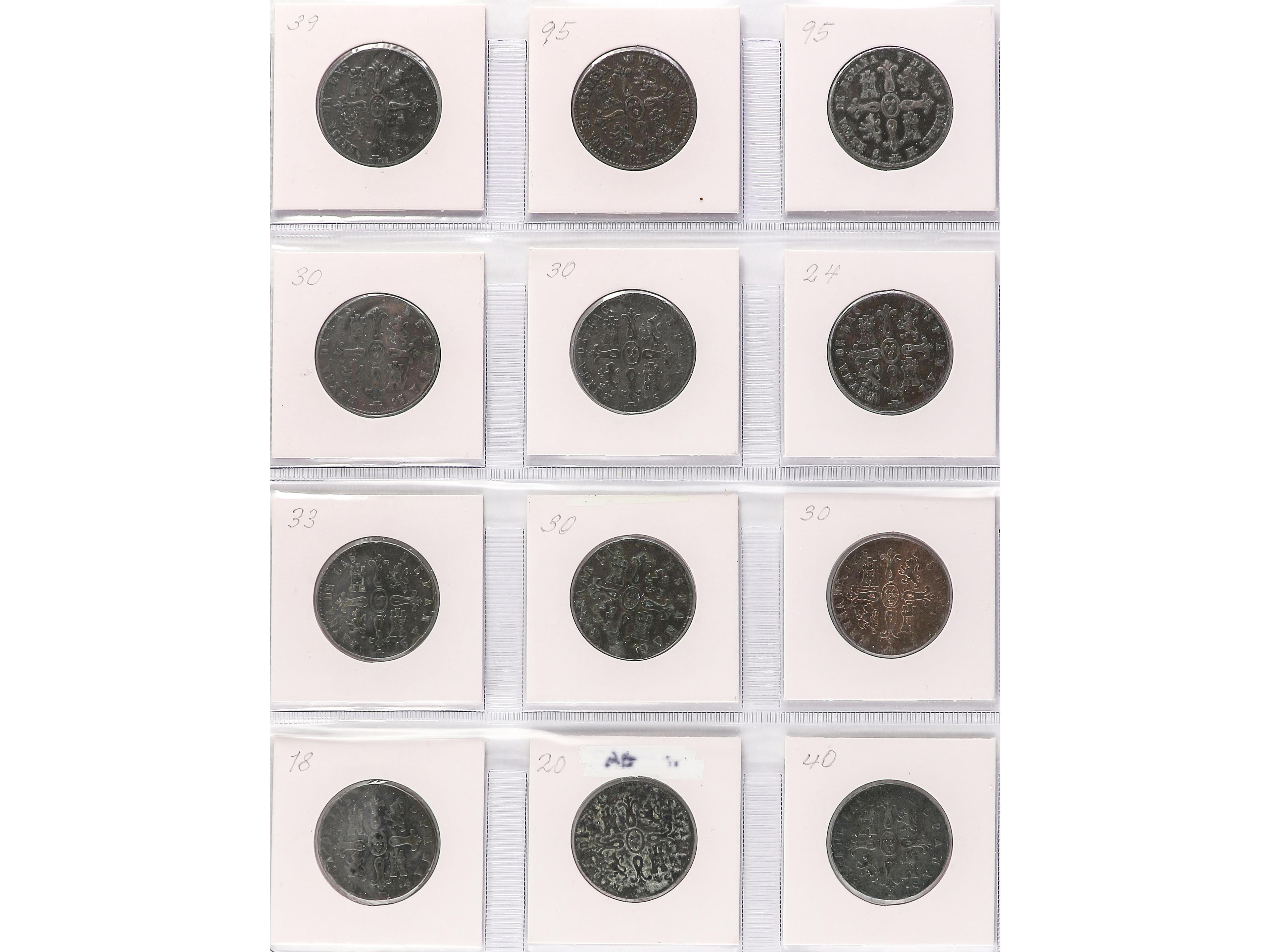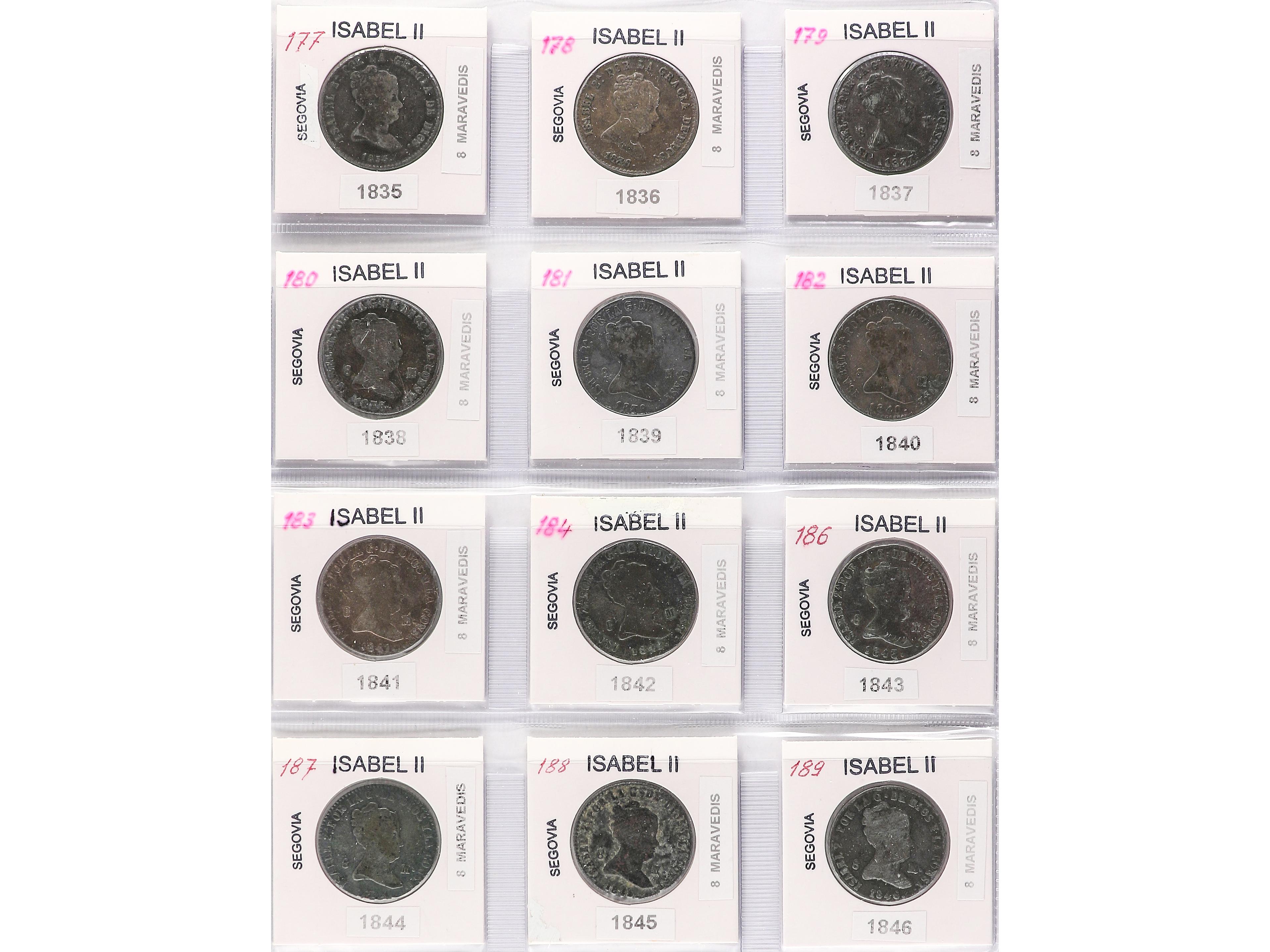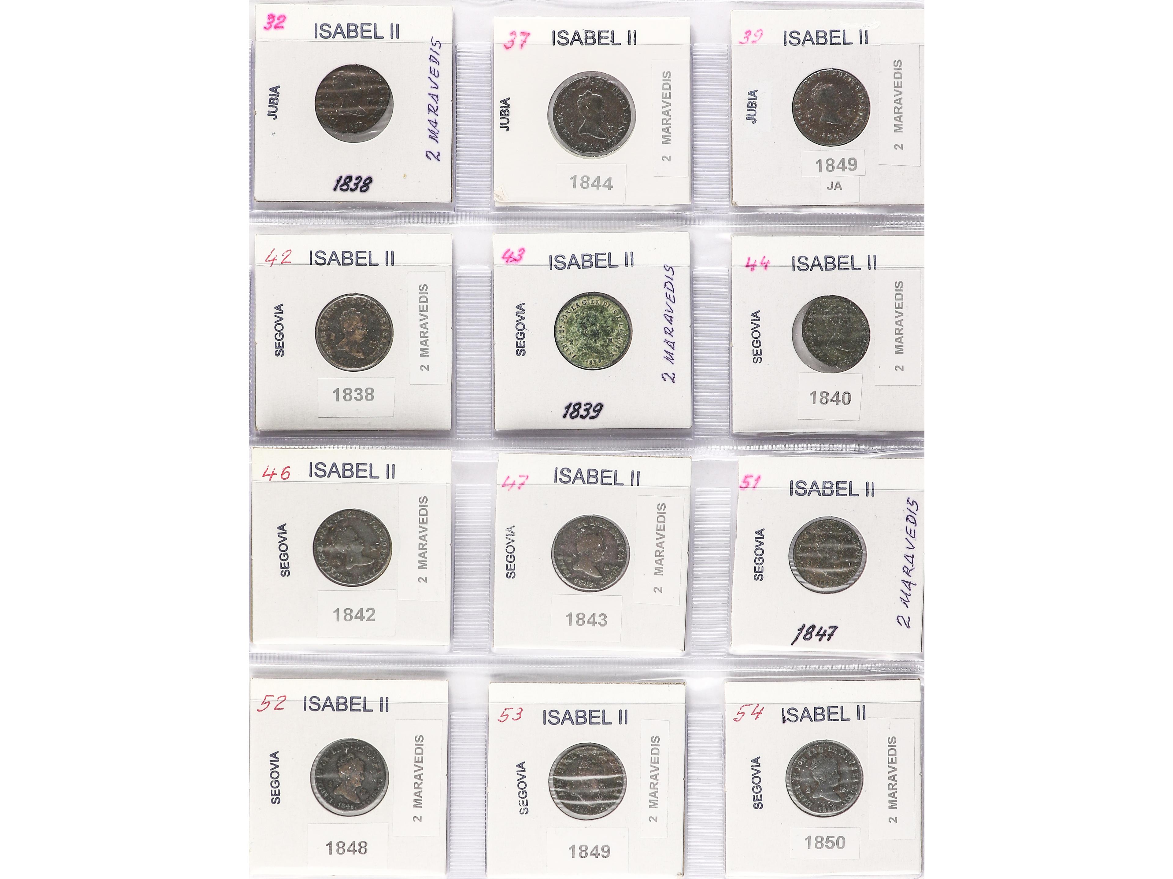 Lote 12 monedas 2 Maravedís. 1838 a 1850. JUBIA (3) y SEGOVIA (9). Todas diferentes. A EXAMINAR. BC a MBC-. (Image1) (Image2)