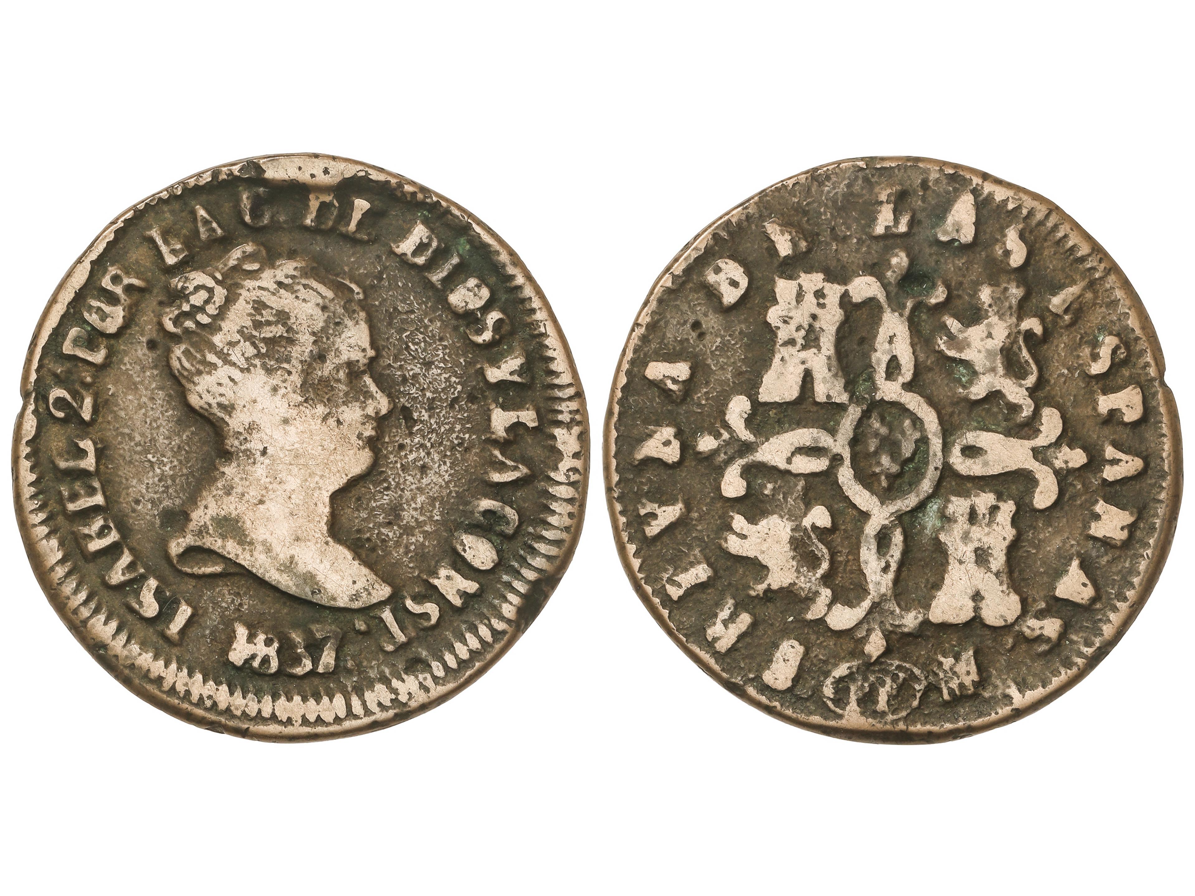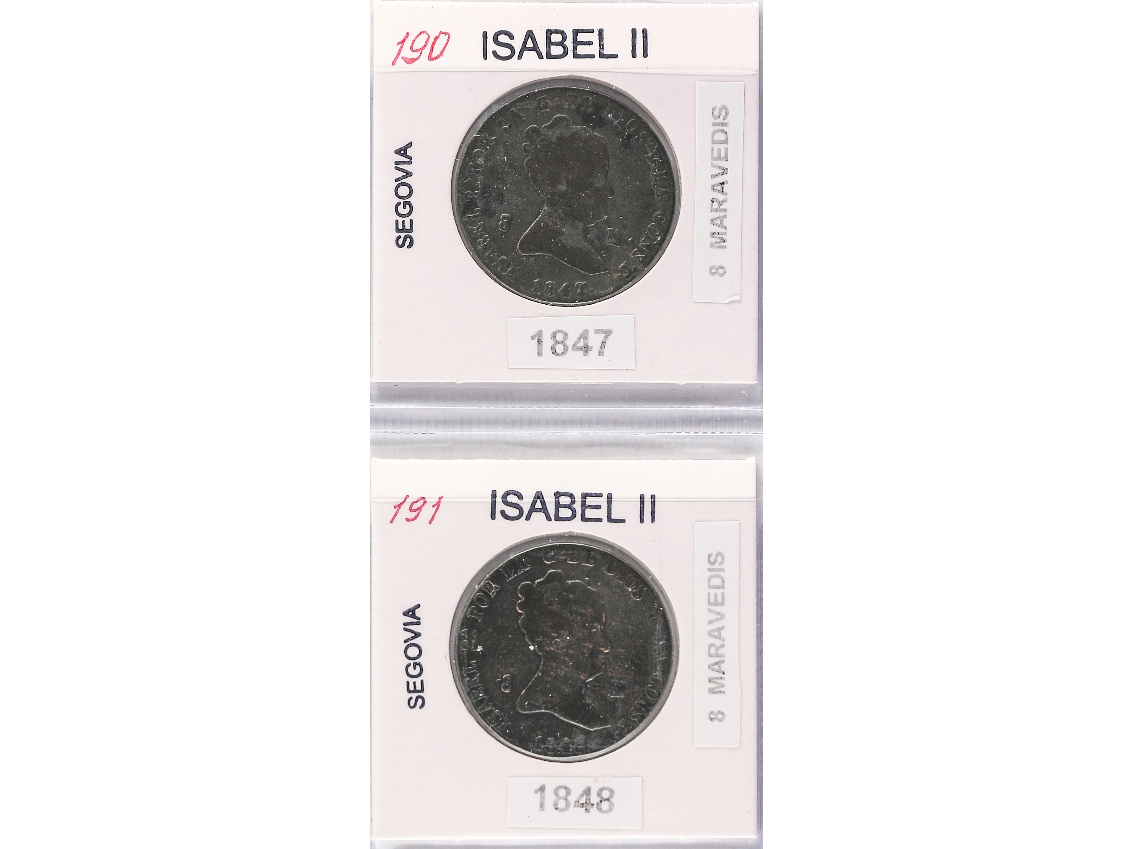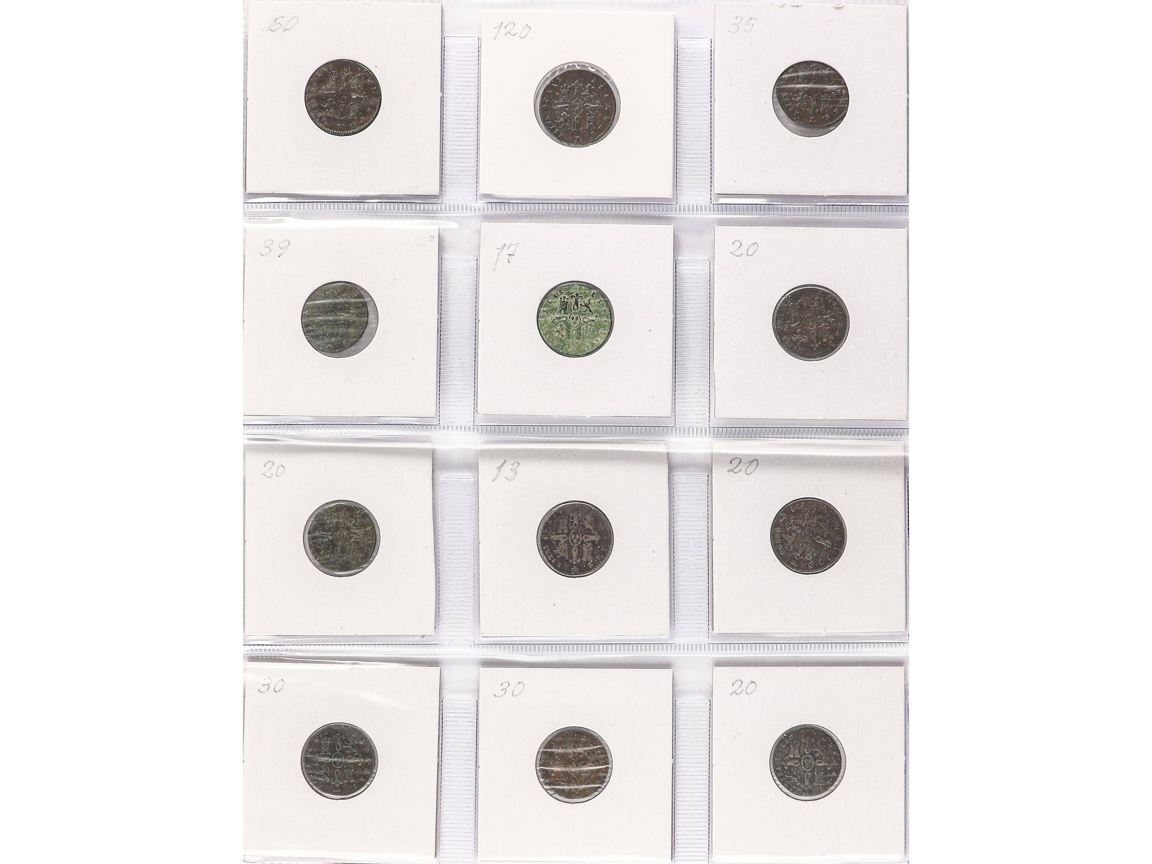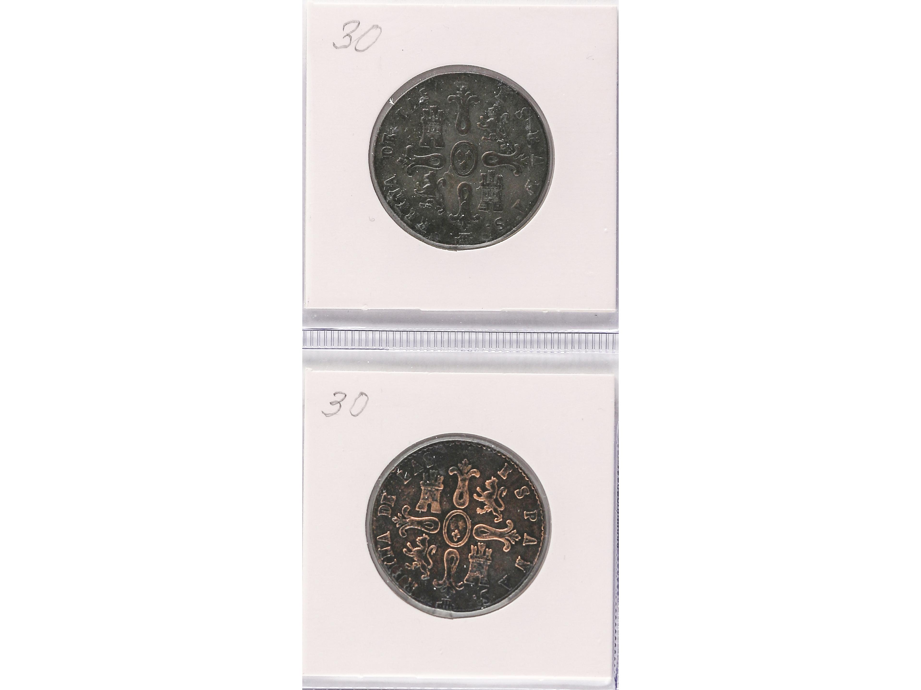 Lote 12 monedas 2 Maravedís. 1838 a 1850. JUBIA (3) y SEGOVIA (9). Todas diferentes. A EXAMINAR. BC a MBC-. (Image1) (Image2)
