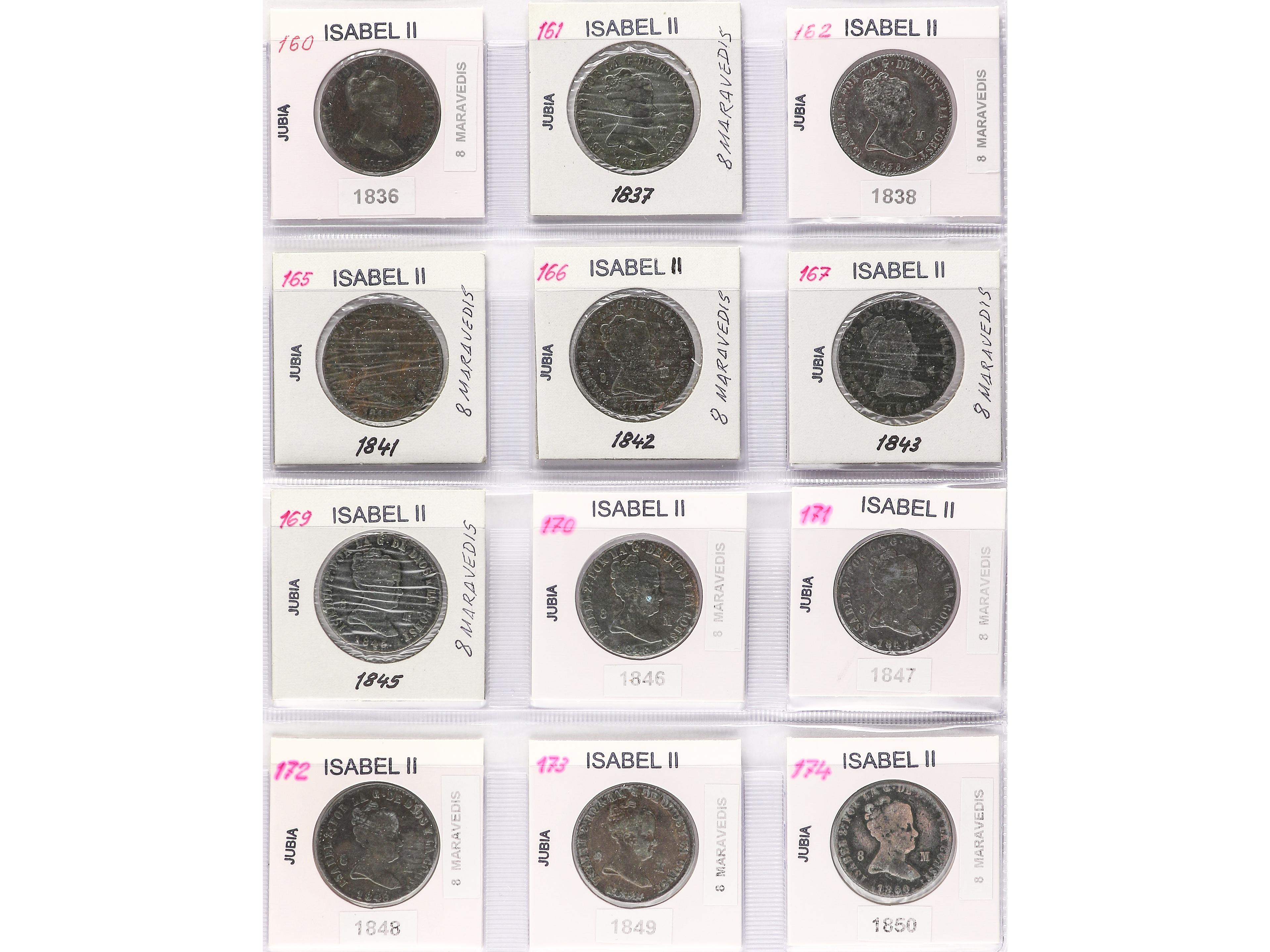 Lote 12 monedas 8 Maravedís. 1836 a 1850. JUBIA. AC-103/105, 108/110, 112/117. BC+ a BC-. (Image1) (Image2)