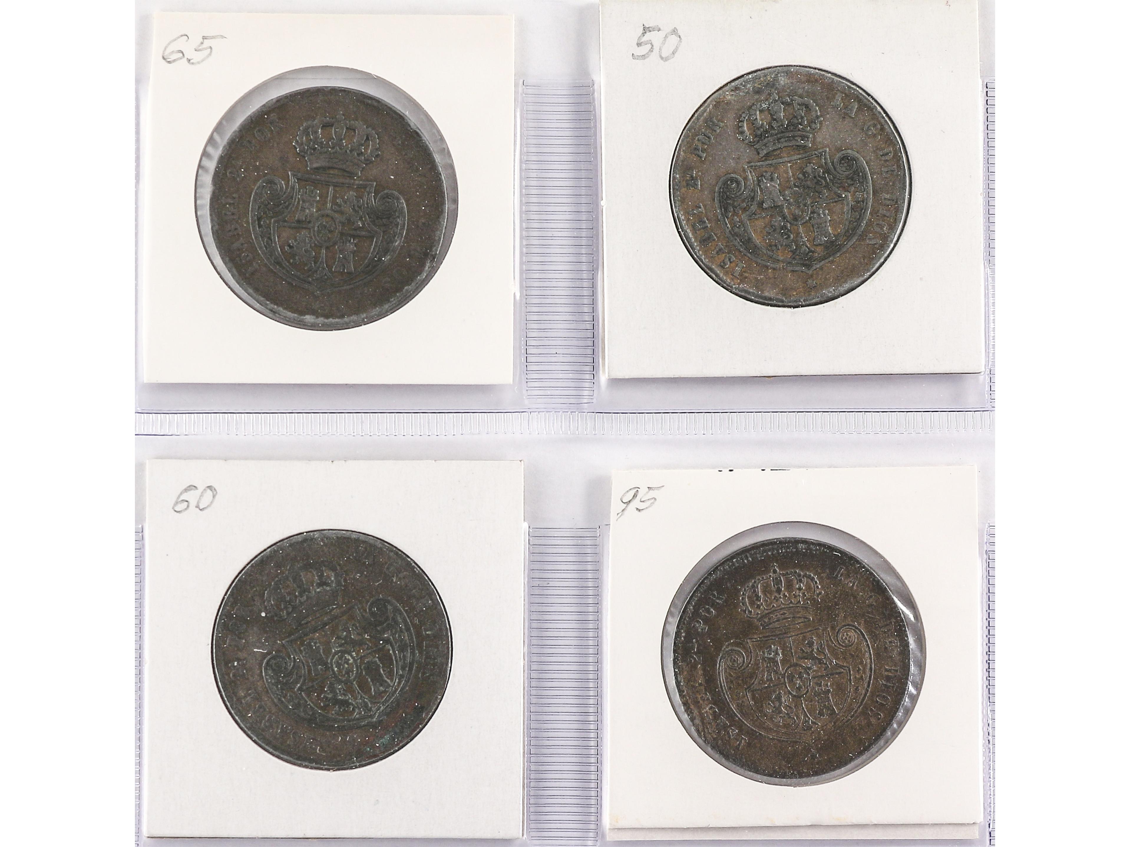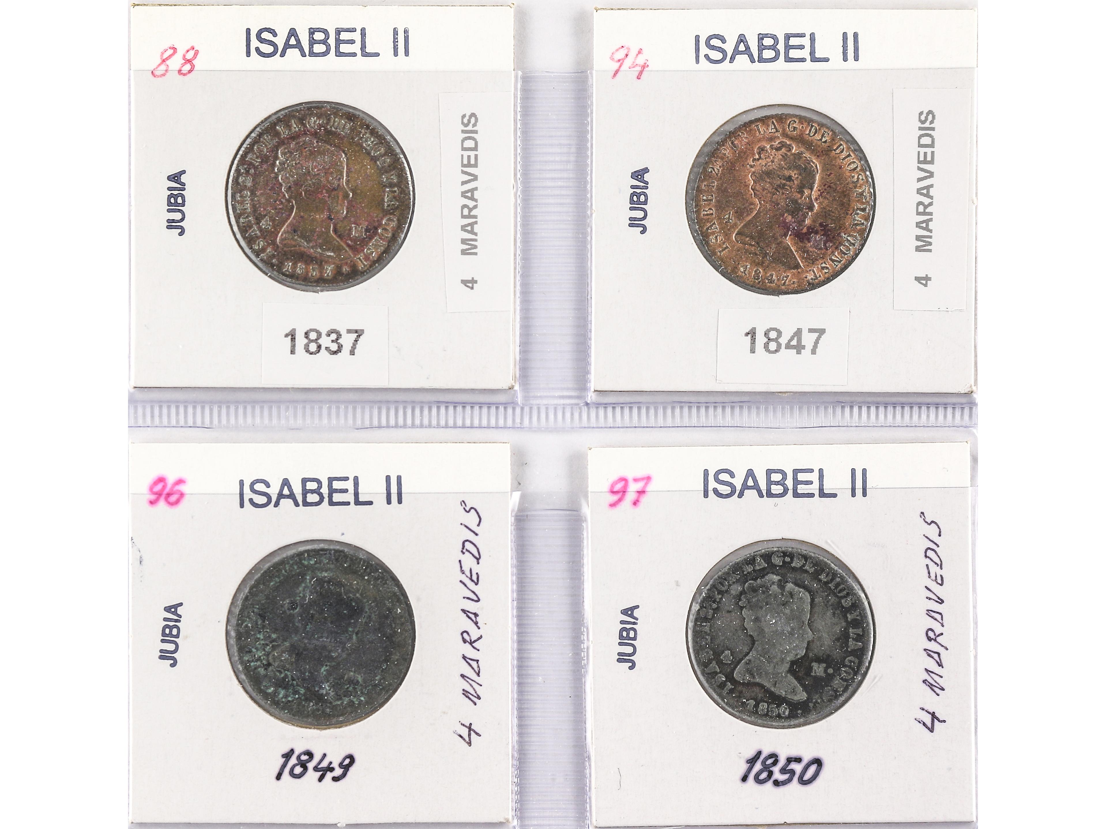 Lote 4 monedas 4 Maravedís. 1837 a 1850. JUBIA. Todas diferentes. A EXAMINAR. AC-67, 73, 75, 76. BC- a EBC. (Image1) (Image2)