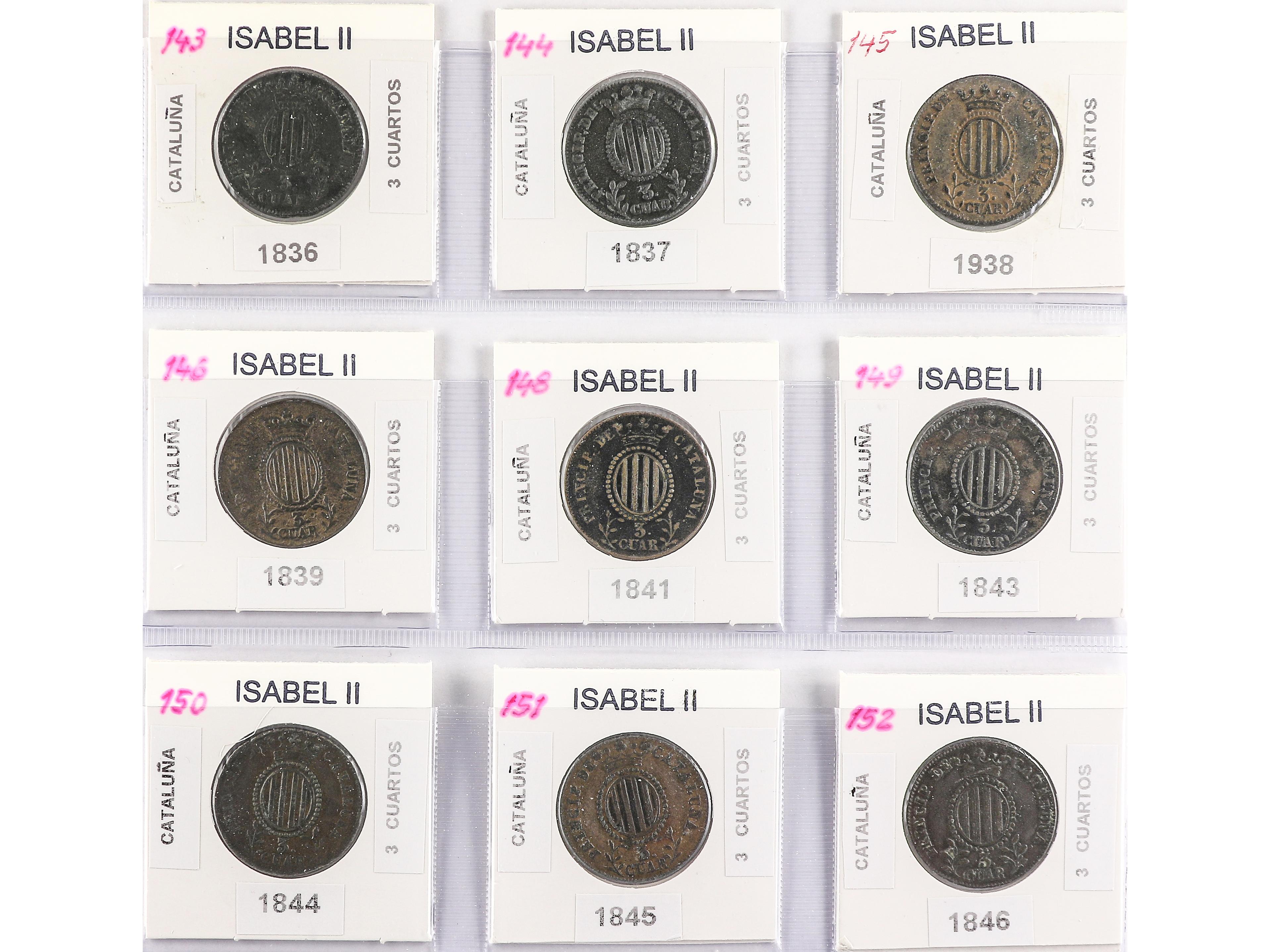 Lote 9 monedas 3 Cuartos. 1836 a 1846. BARCELONA. Todas diferentes. A EXAMINAR. MBC- a MBC+. (Image1) (Image2)