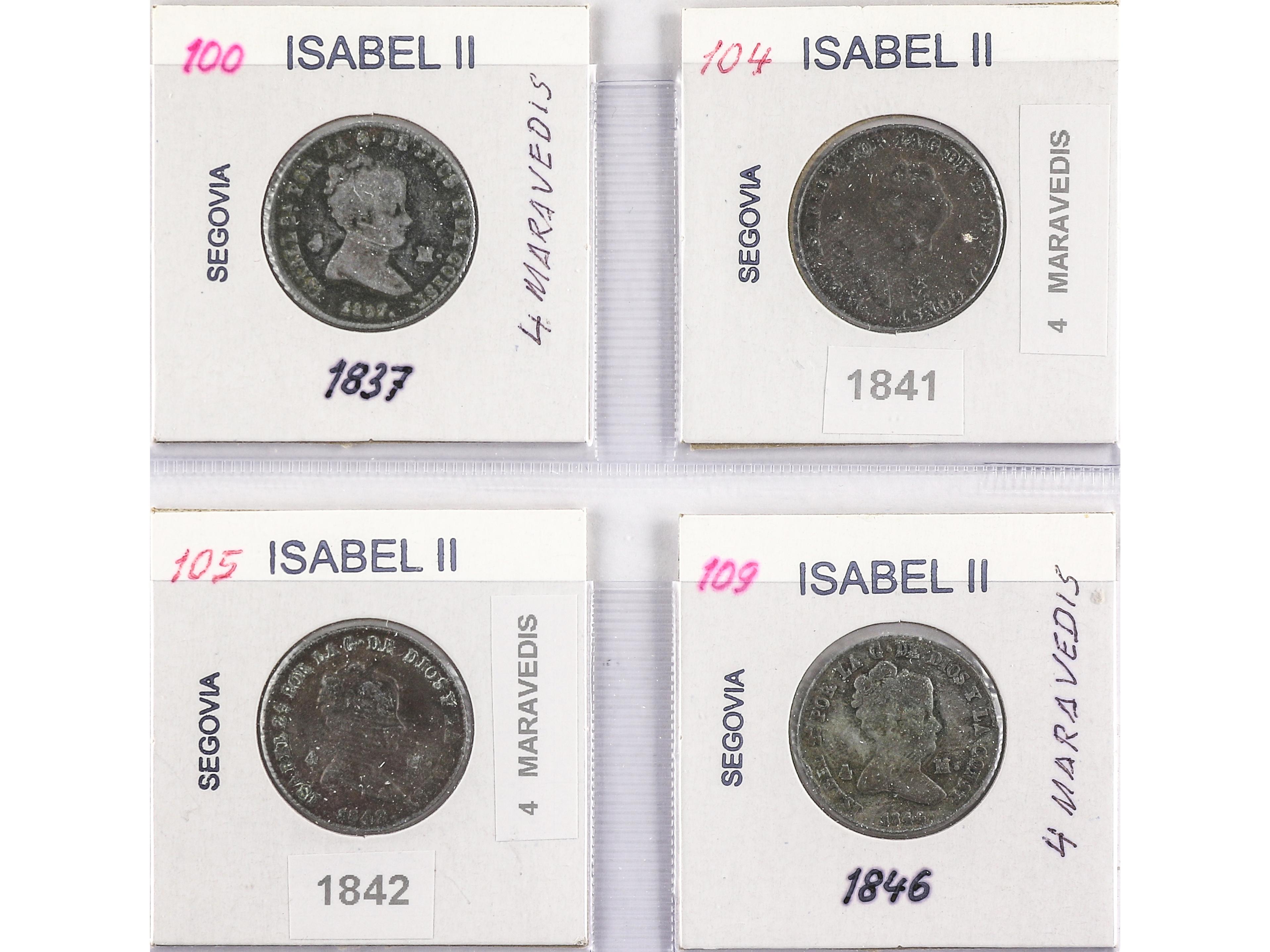 Lote 4 monedas 4 Maravedís. 1837 a 1846. SEGOVIA. Todas diferentes. A EXAMINAR. AC- 80, 84, 85, 89. BC a MBC-. (Image1) (Image2)