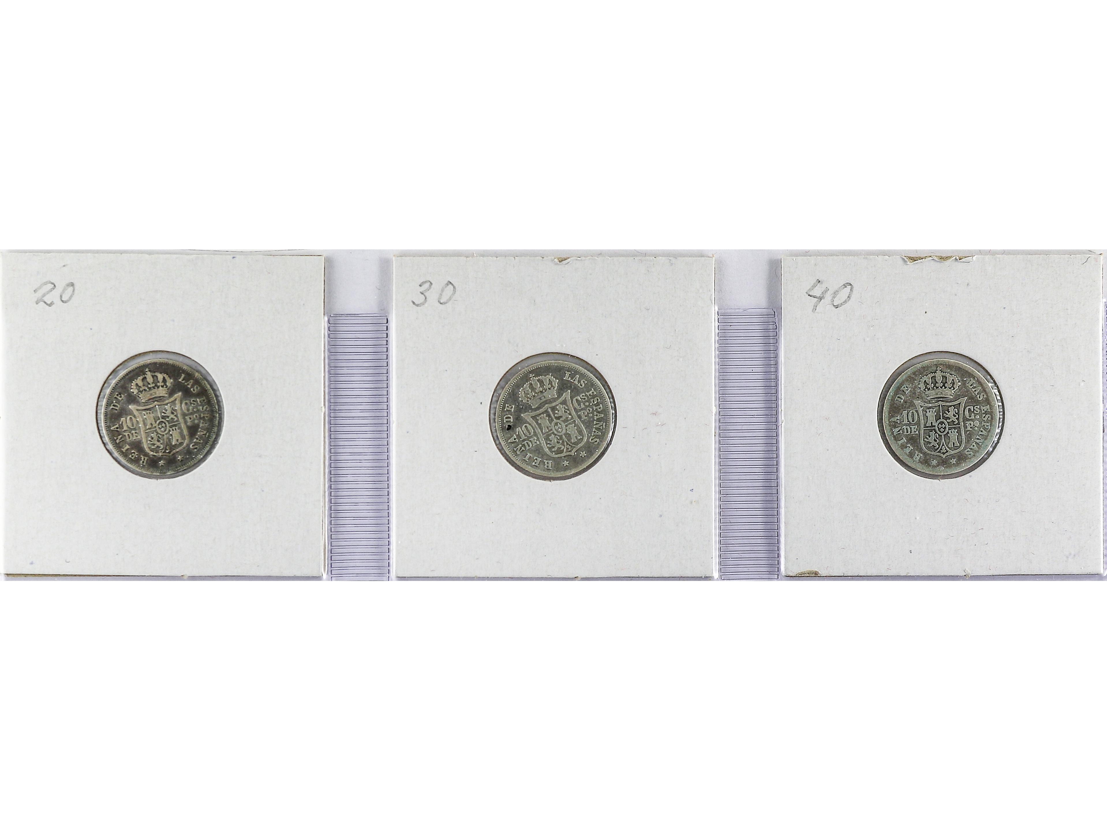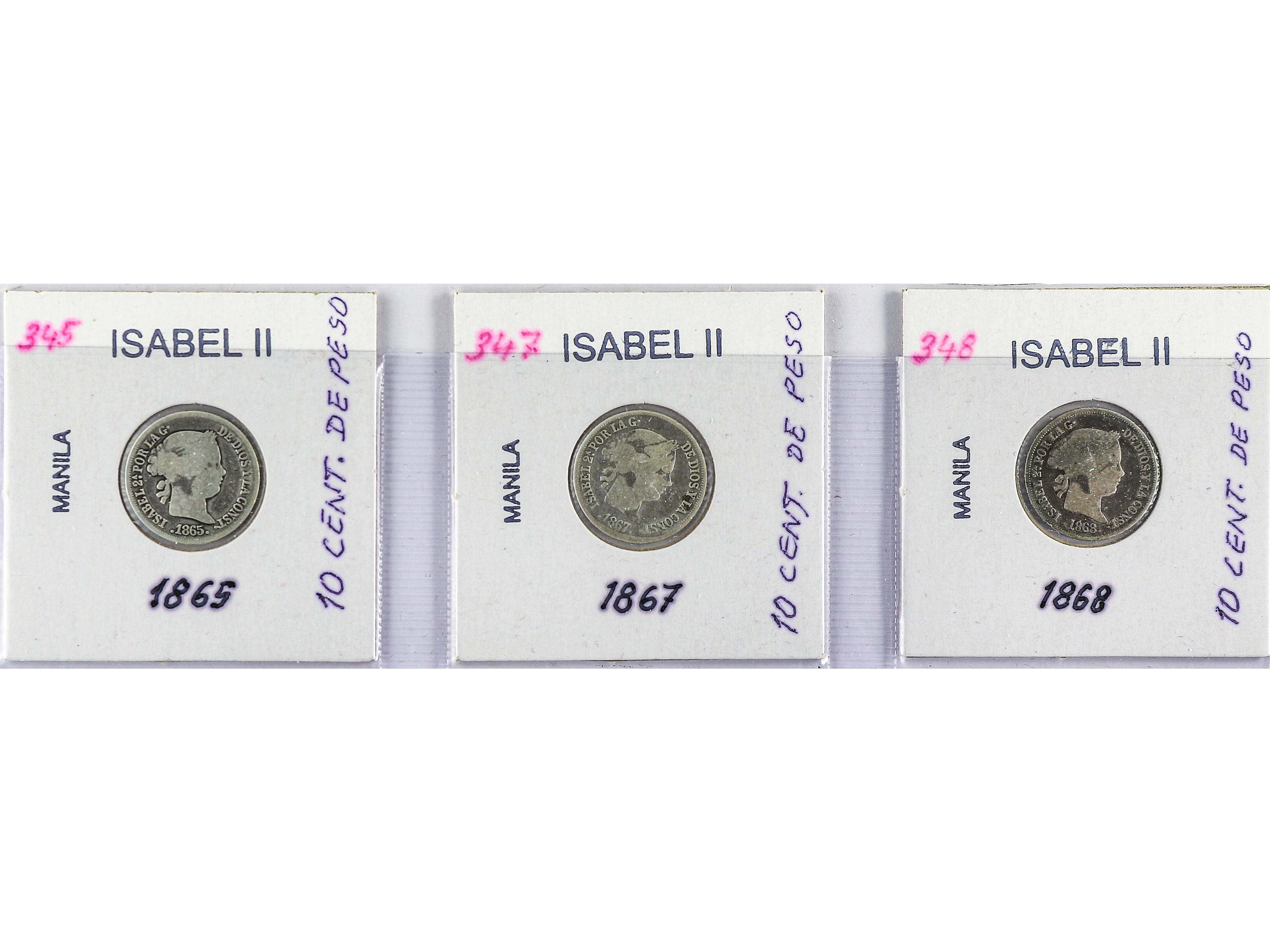 Lote 3 monedas 10 Centavos de Peso. 1865 a 1868. MANILA. Todas diferentes. A EXAMINAR. AC-650, 654 y 656. BC a BC+.
