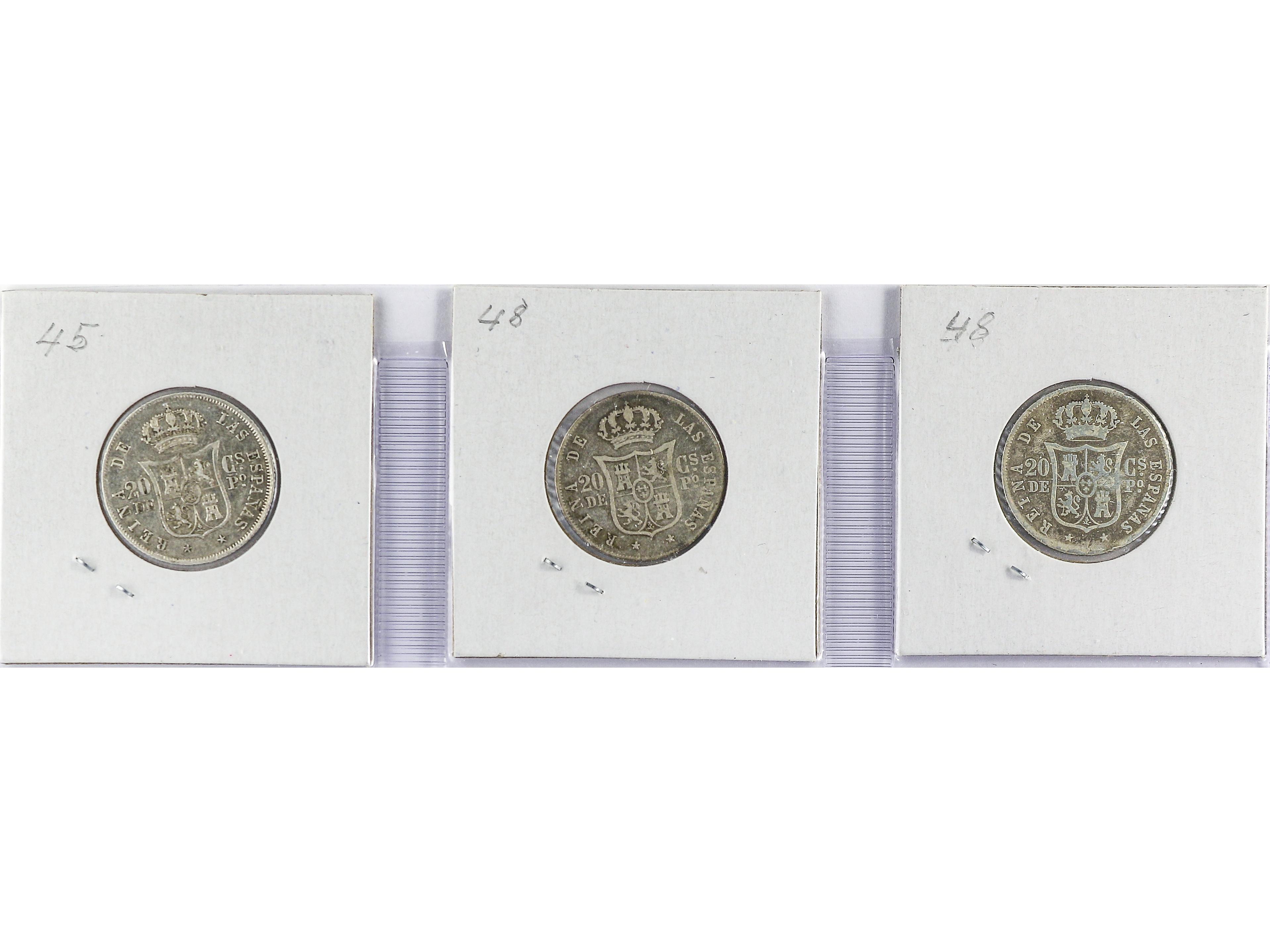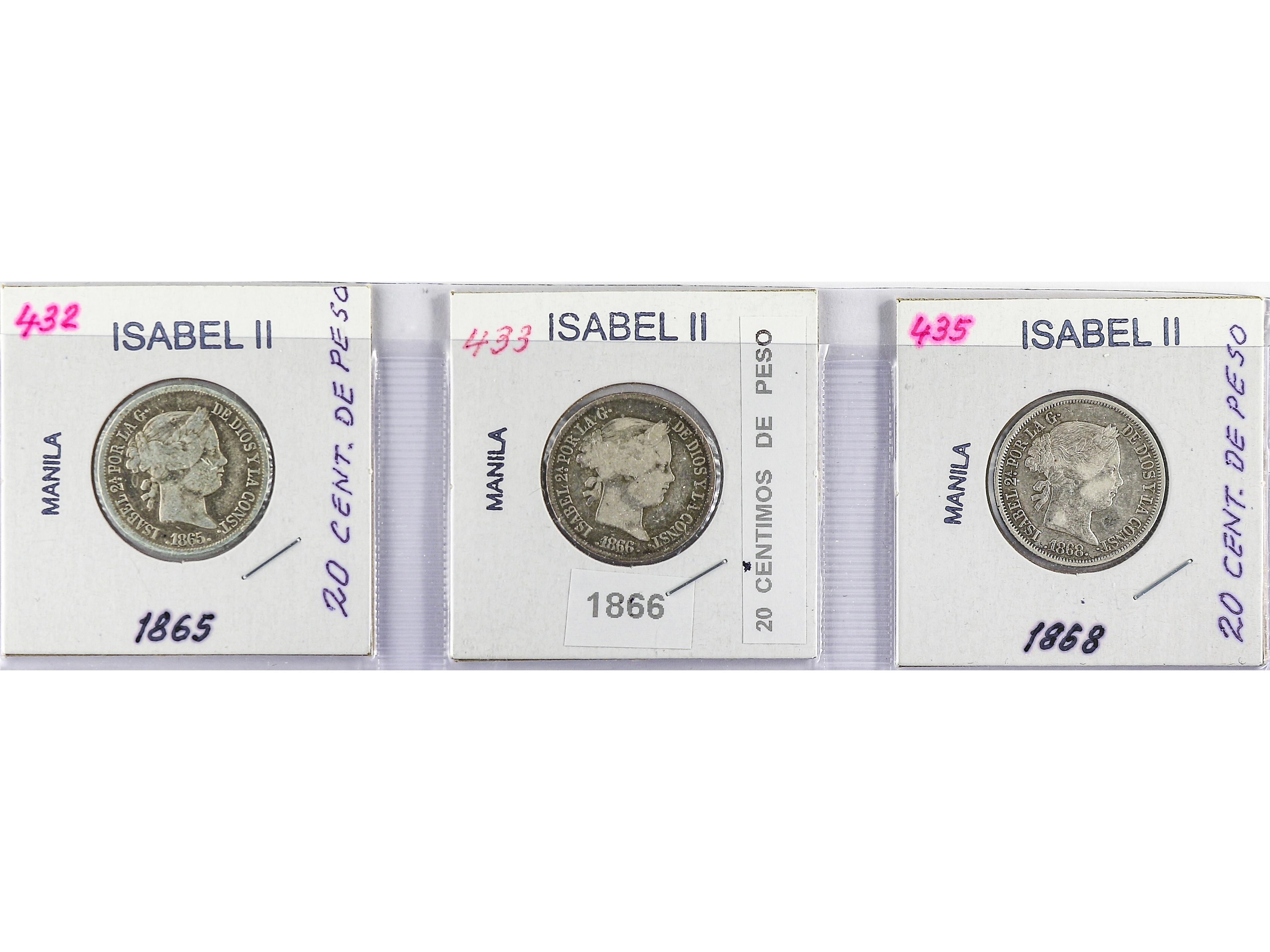 Lote 3 monedas 20 Centavos de Peso. 1865, 1866 y 1868. MANILA. A EXAMINAR. ESCASAS. AC-658/9 y 661. BC a MBC. (Image1) (Image2)