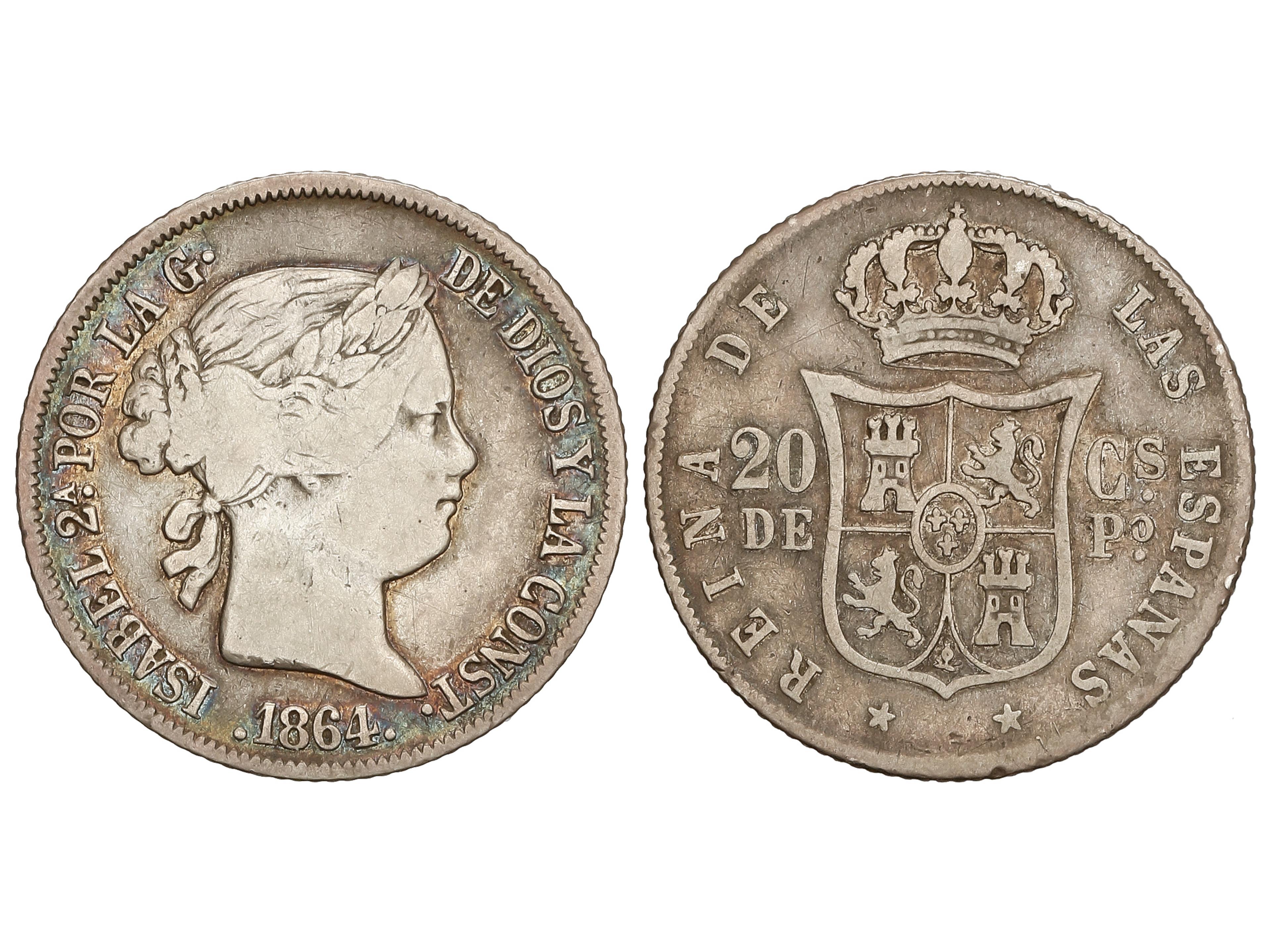 20 Centavos de Peso. 1864. MANILA. 4,98 grs. MUY ESCASA. AC-657. MBC-. (Image1)