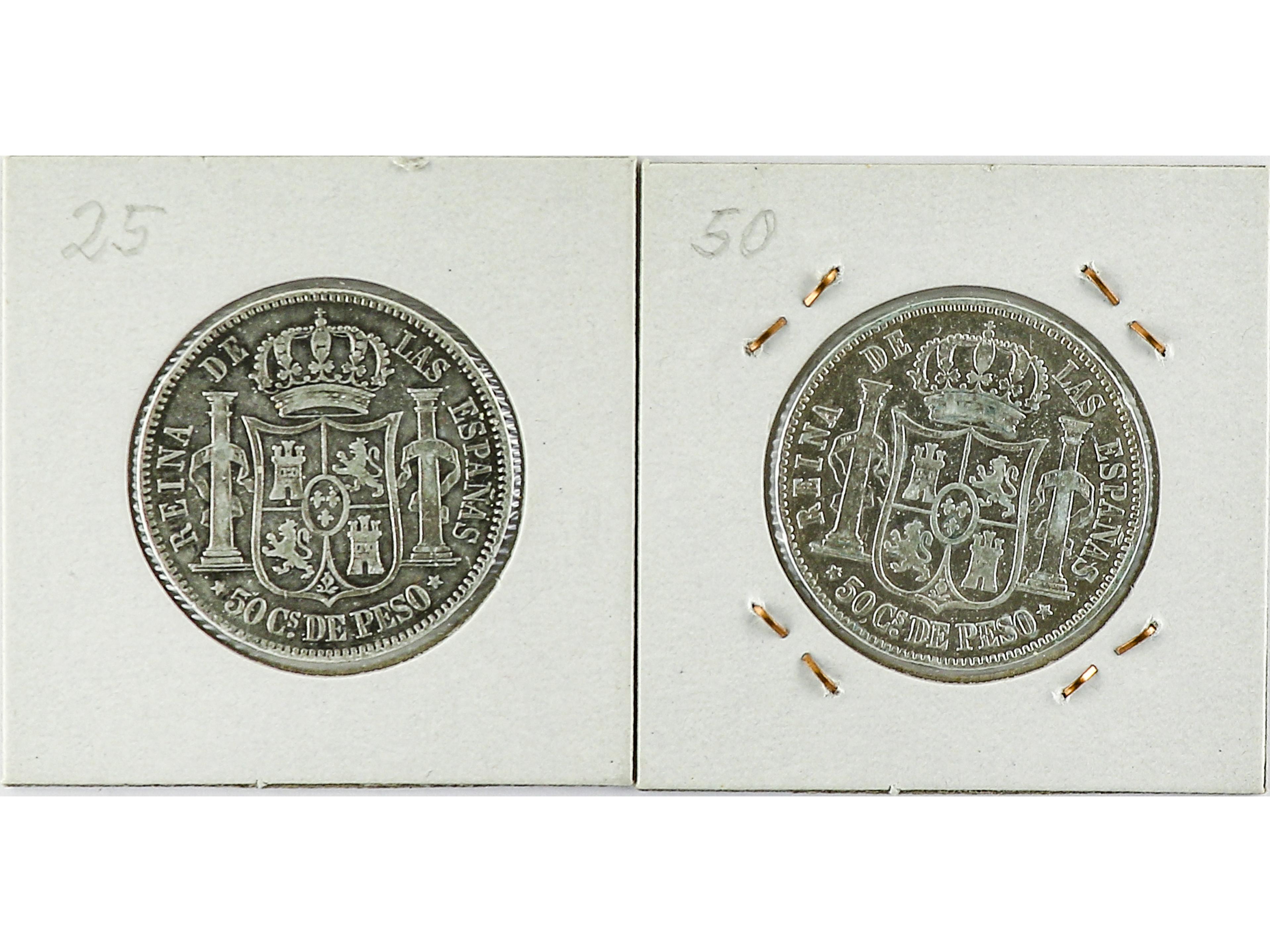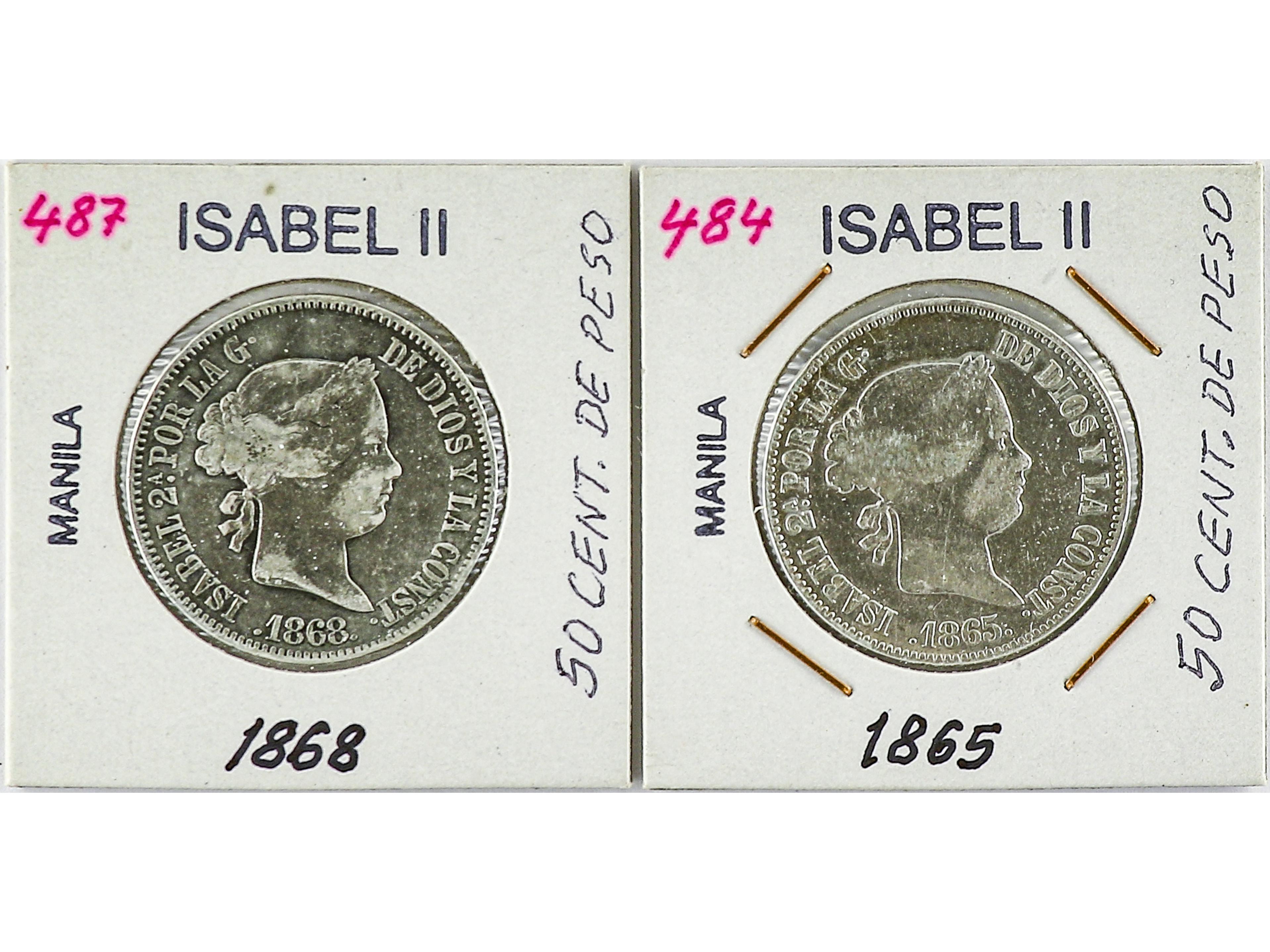 Lote 2 monedas 50 Centavos de Peso. 1865 y 1868. MANILA. AC-662 y 667. MBC-. (Image1) (Image2)