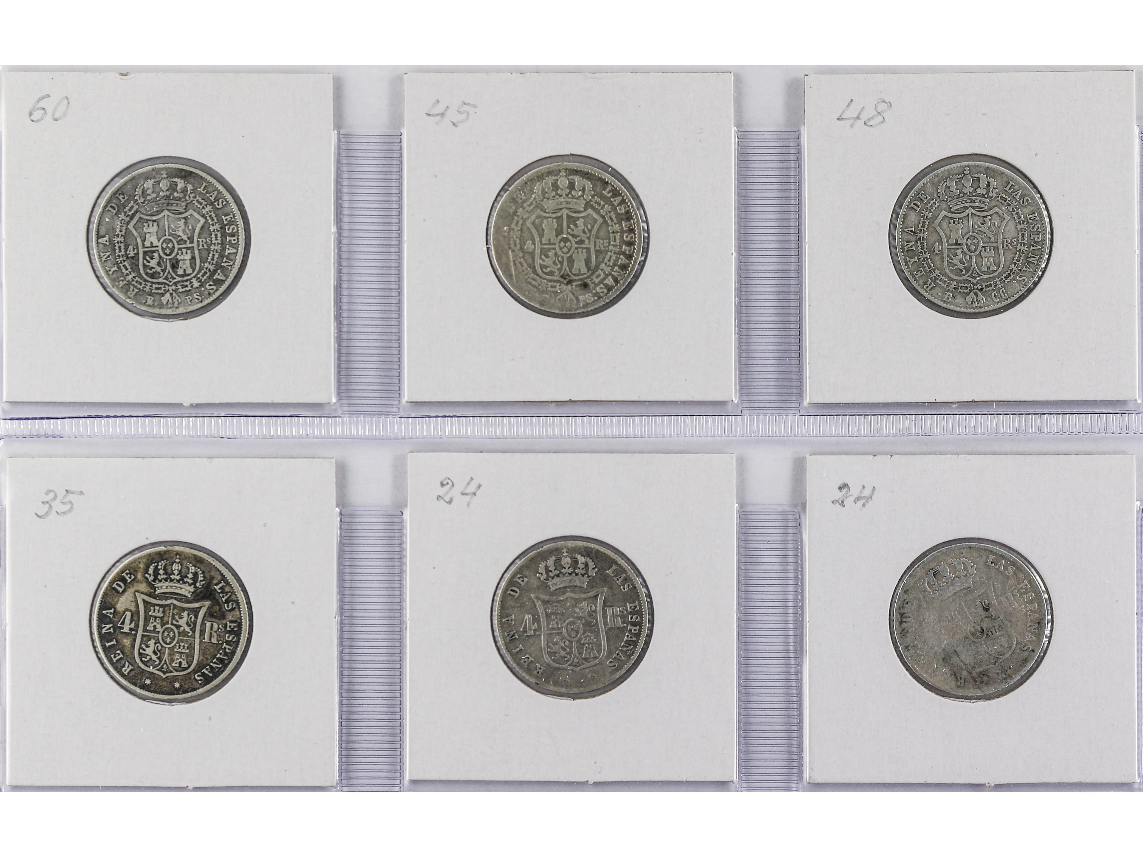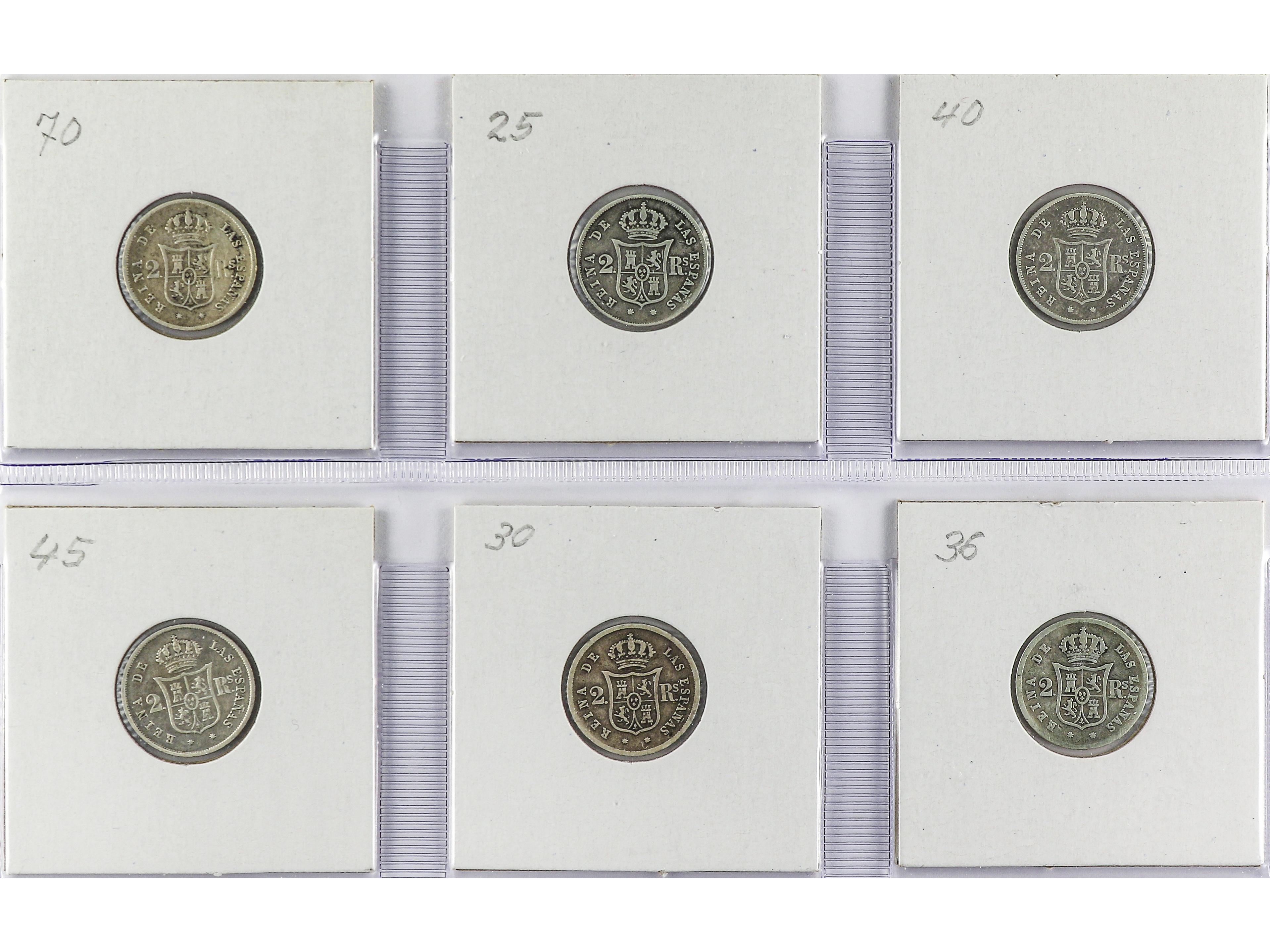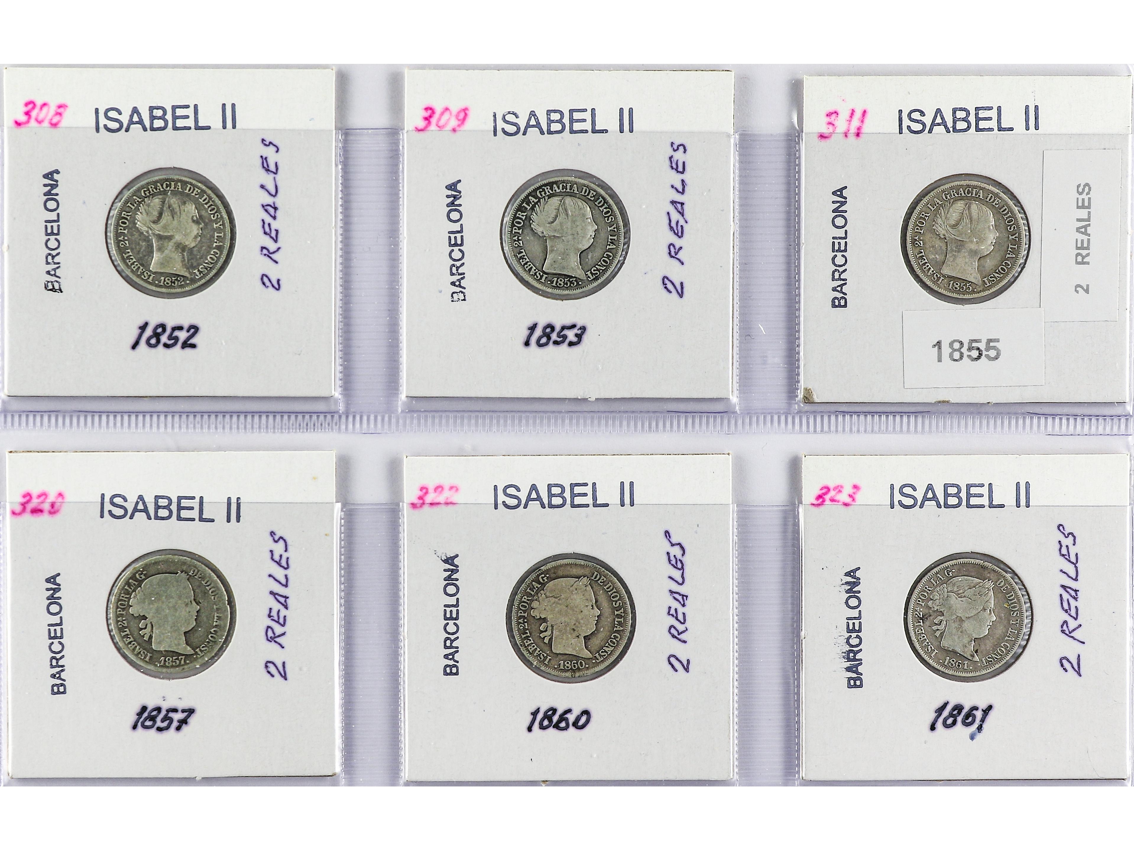 Lote 6 monedas 2 Reales. 1852 a 1861. BARCELONA. Todas diferentes. A EXAMINAR. AC-344/5, 347/8 y 351/2. BC a MBC-.