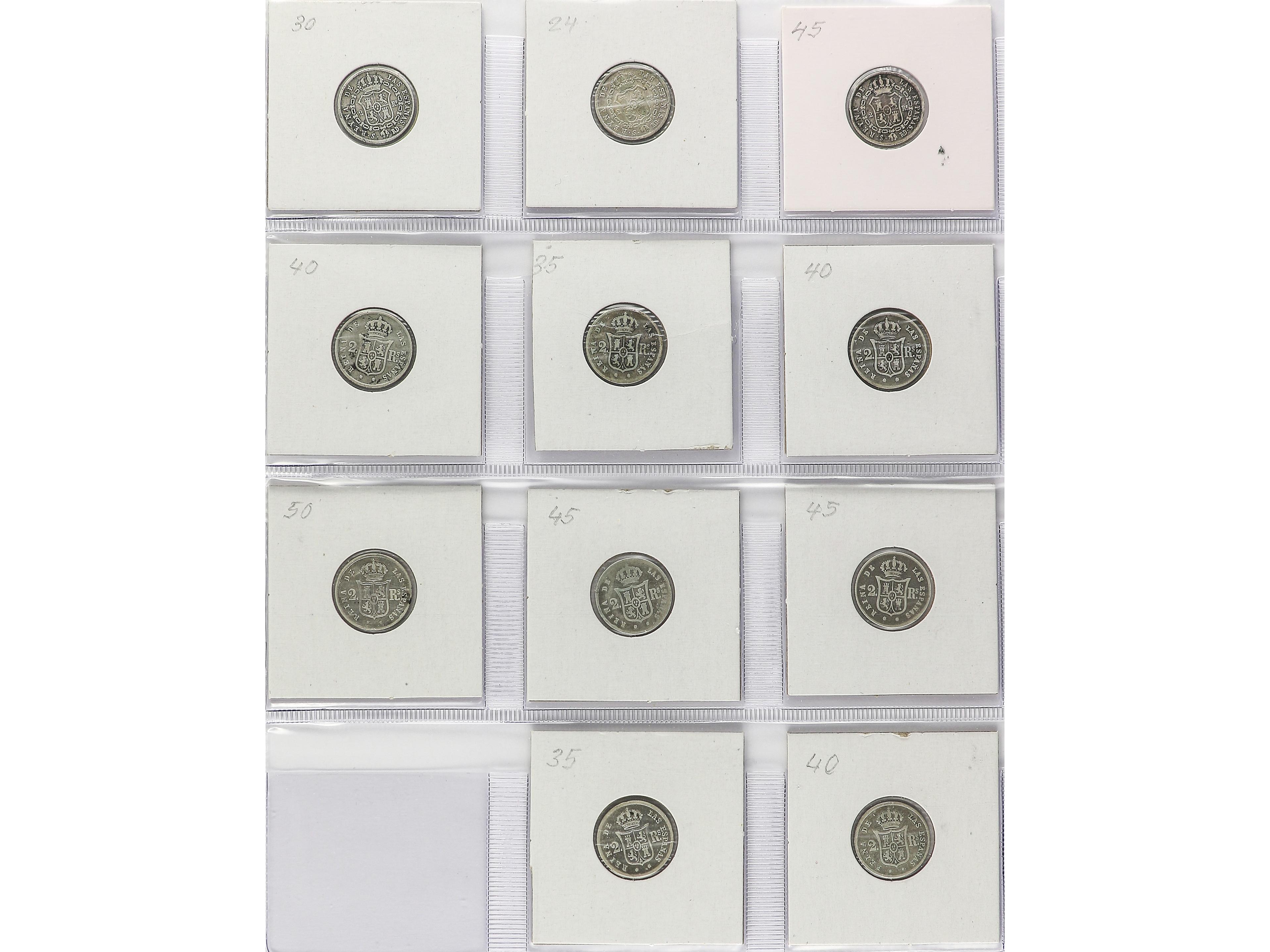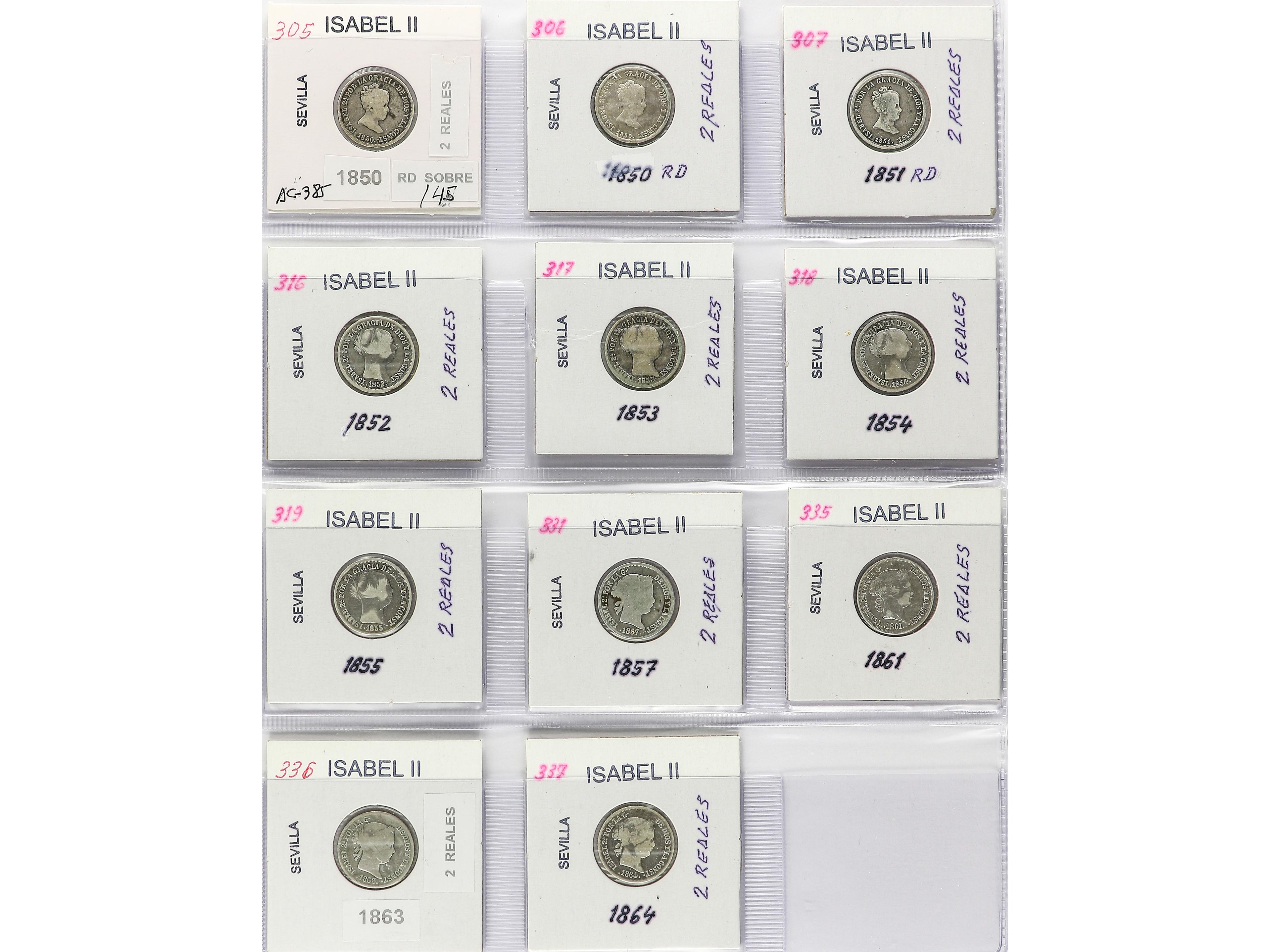 Lote 11 monedas 2 Reales. 1850 a 1864. SEVILLA. Todas diferentes. A EXAMINAR. AC-385, 387/8, 390/2, 394/5 y 400/2. BC a MBC-.