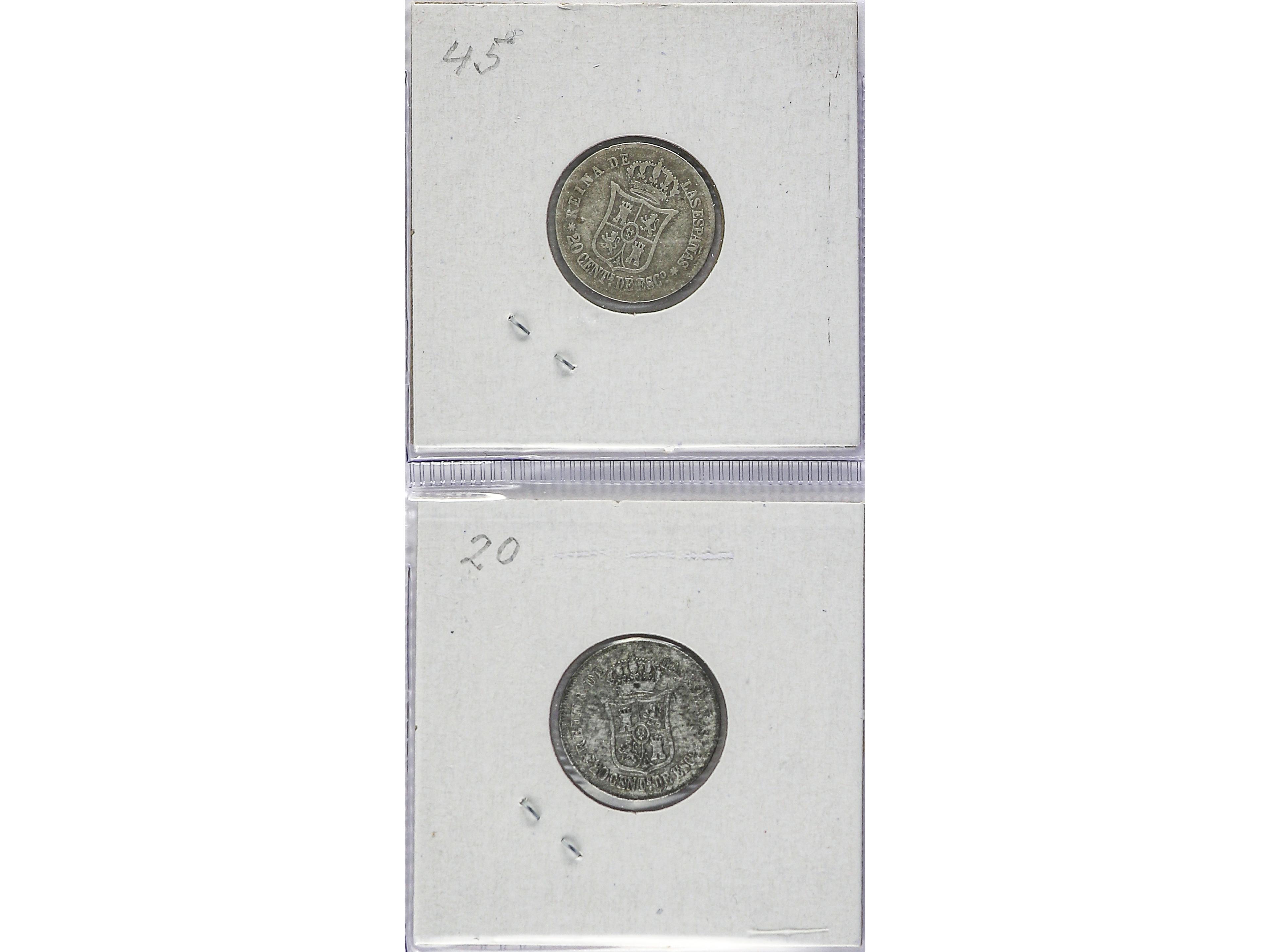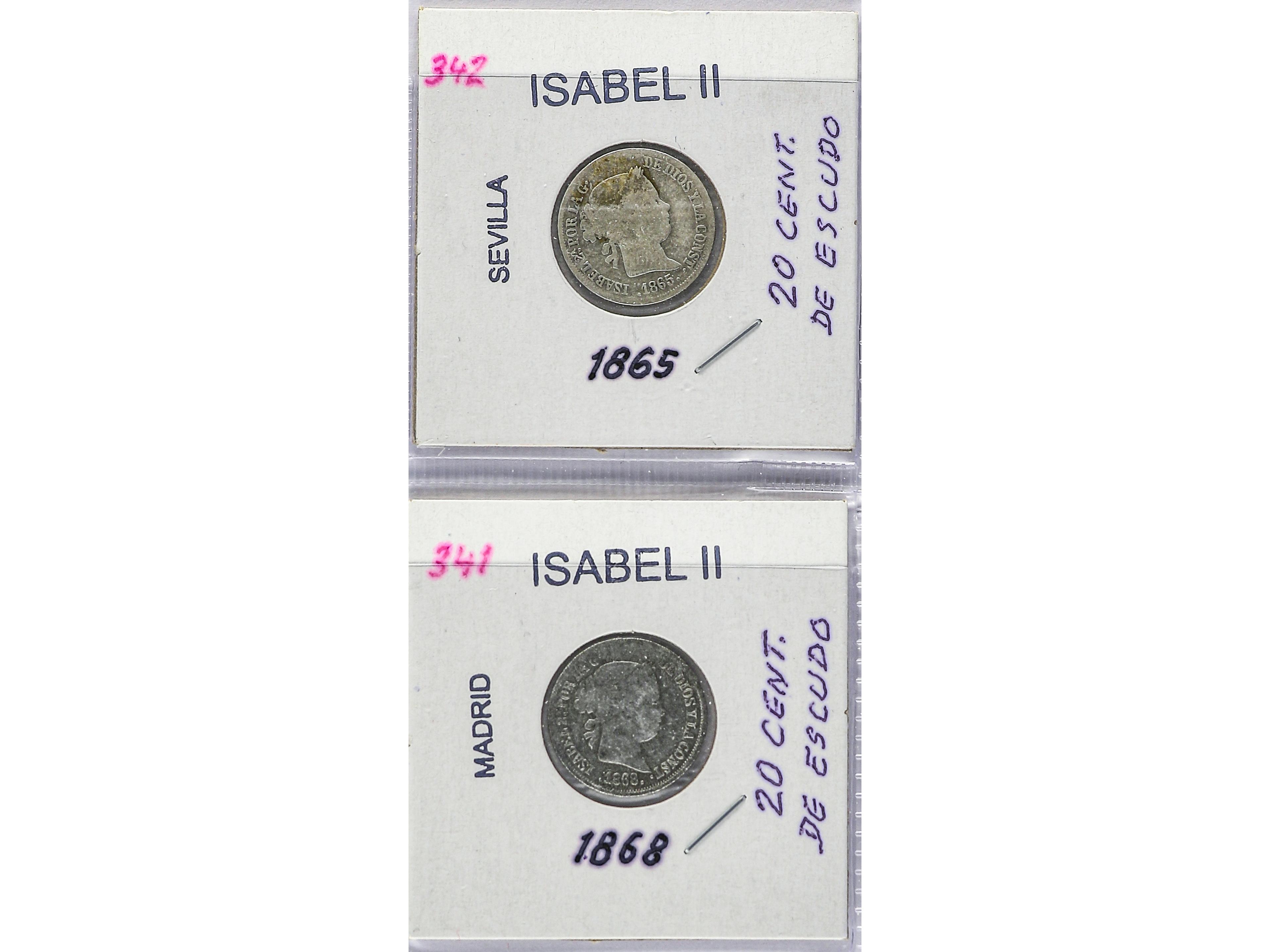 Lote 2 monedas 20 Céntimos de Escudo. 1865 y 1868. SEVILLA y MADRID. La de 1868 Madrid FALSA DE ÉPOCA en calamina. AC-408 y Barrera 715 var. de fecha. BC y MBC-. (Image1) (Image2)