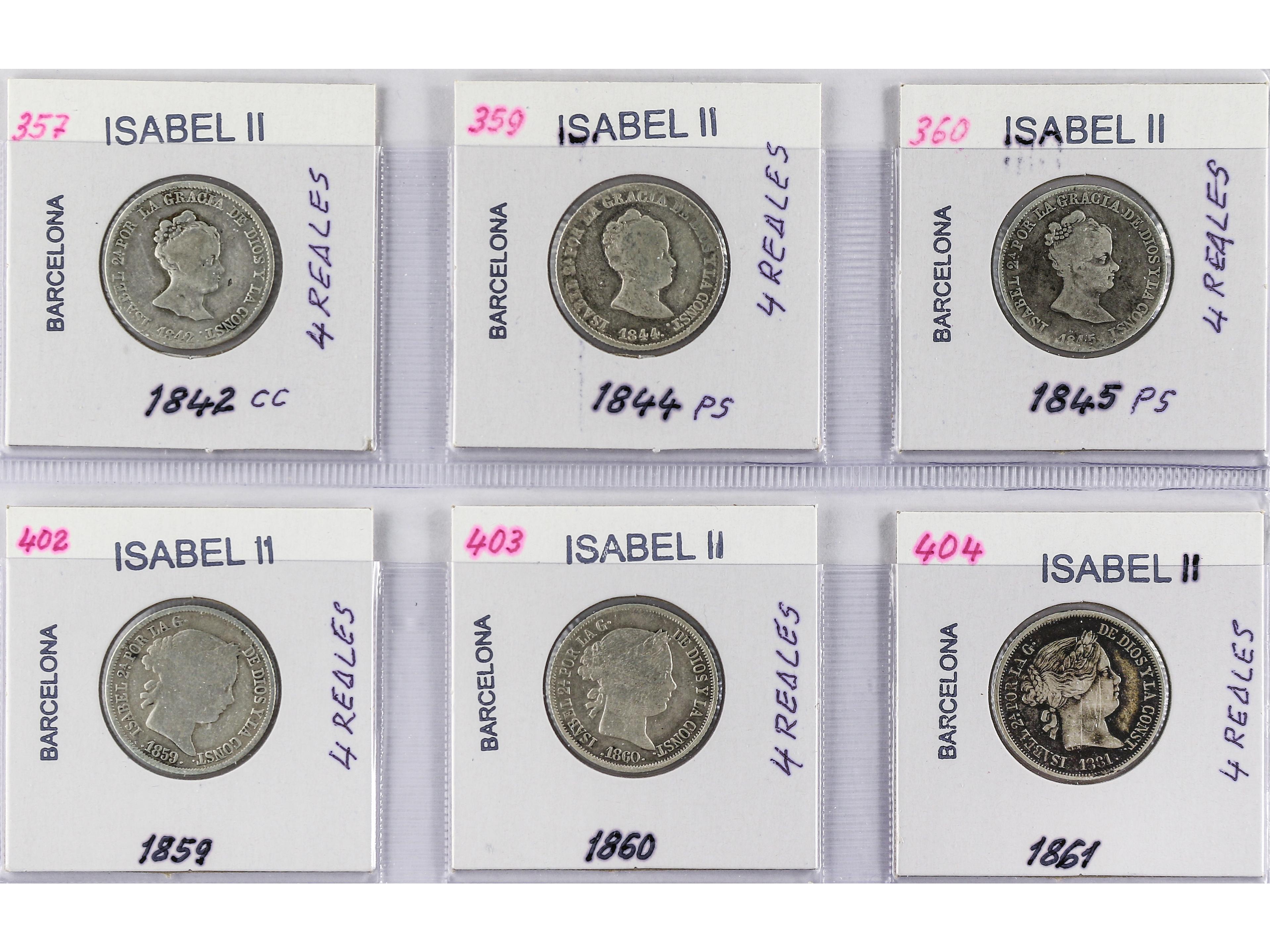 Lote 6 monedas 4 Reales. 1842 a 1861. BARCELONA. Todas diferentes. A EXAMINAR. AC-416, AC-418/419, AC-431. AC-434/435. BC/BC-.