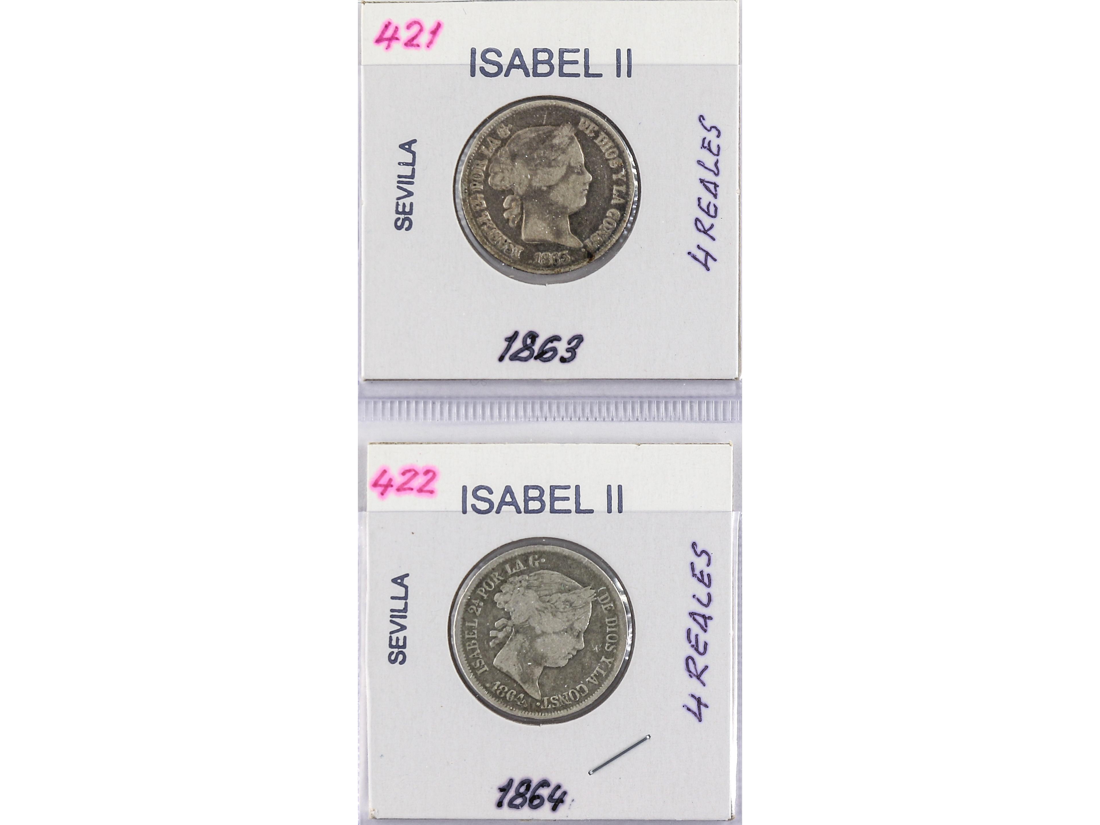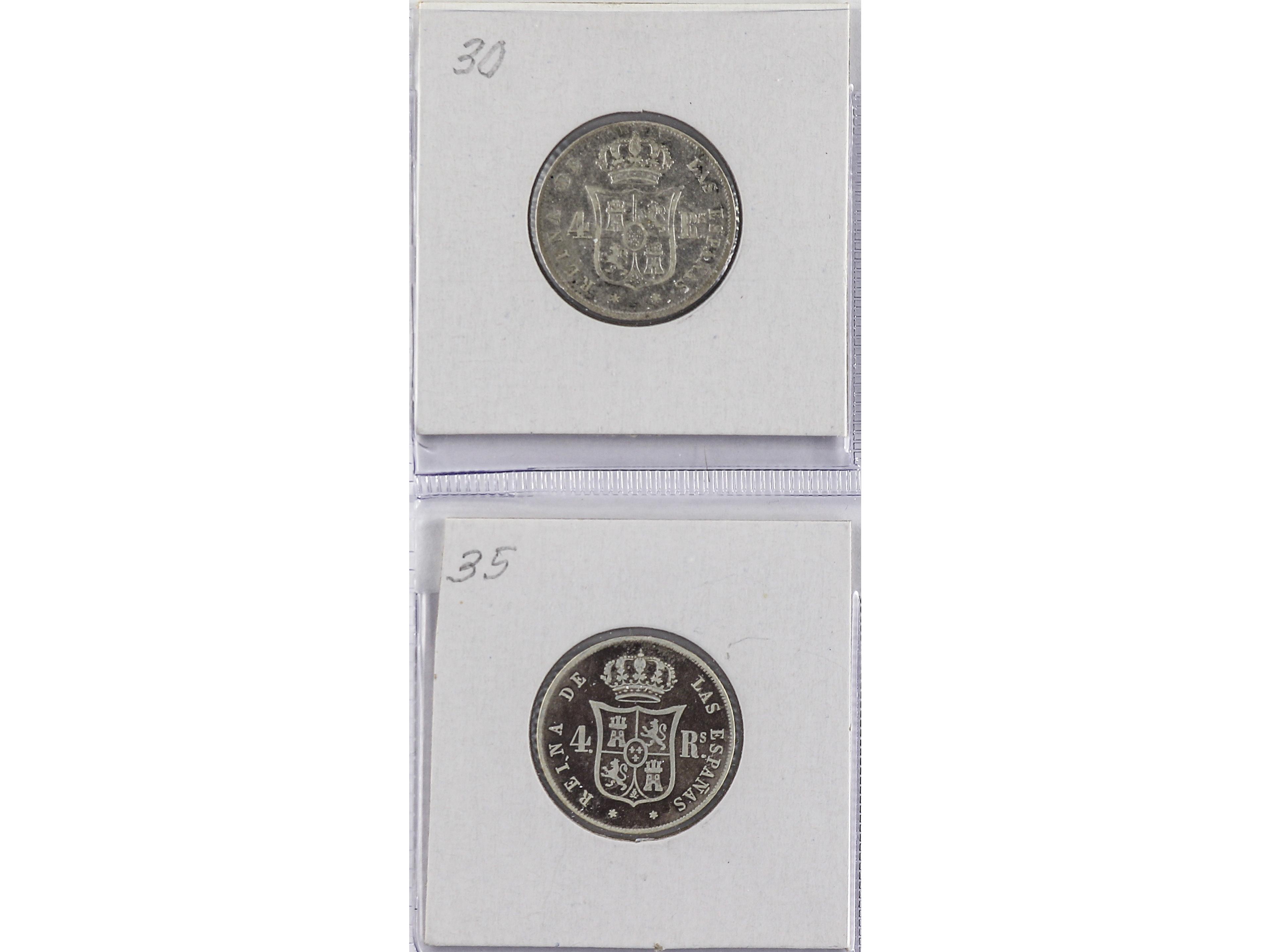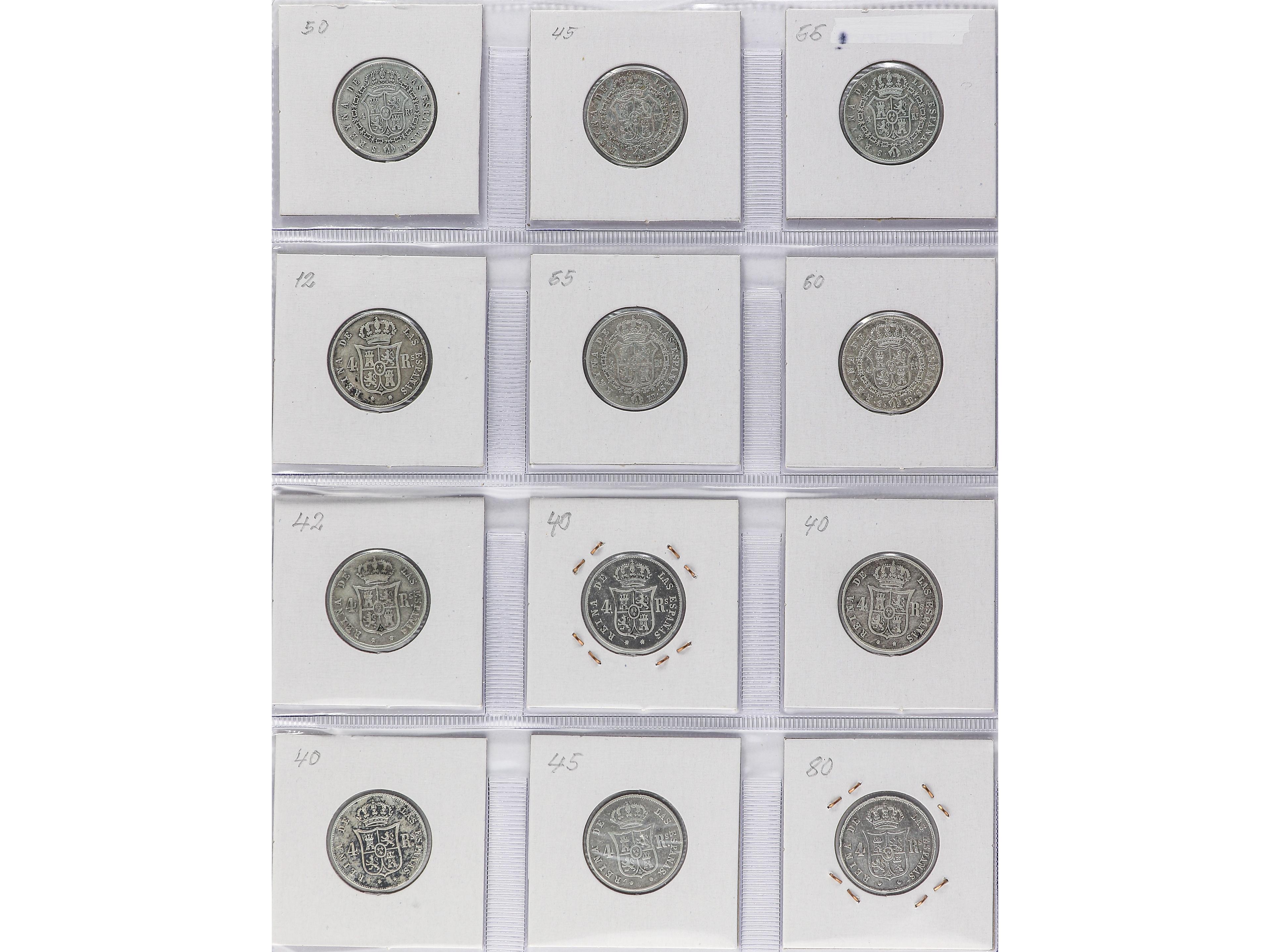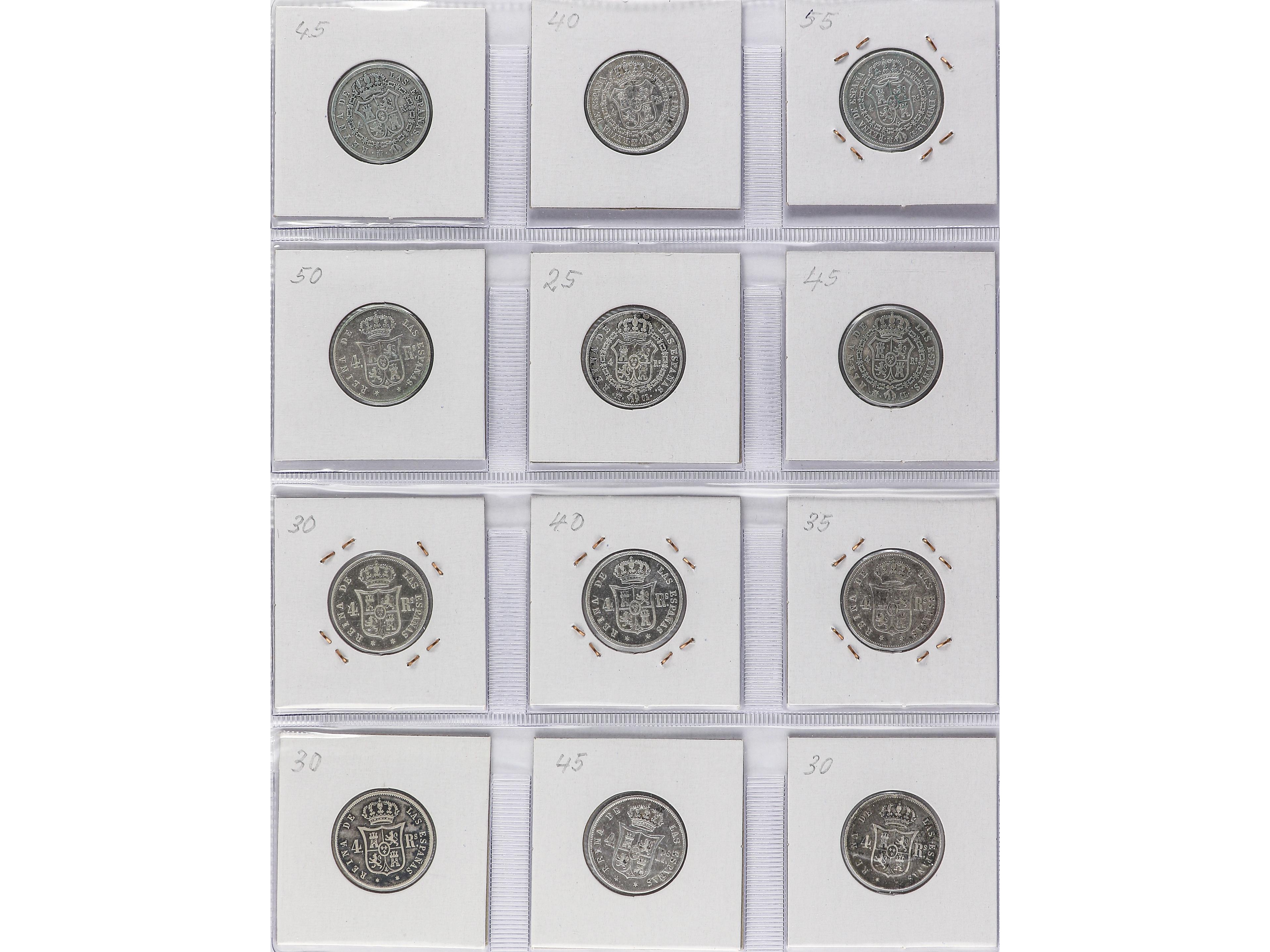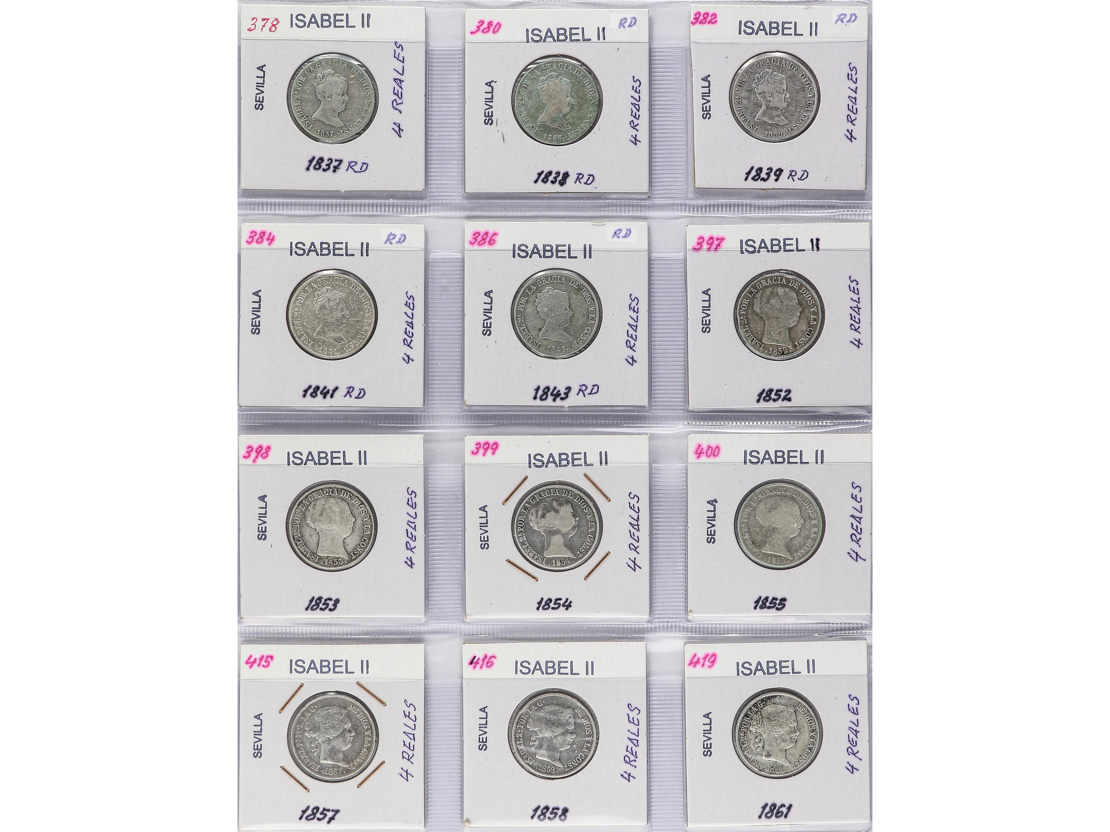 Lote 14 monedas 4 Reales. 1837 a 1868. SEVILLA. Todas diferentes. A EXAMINAR. AC-472, 475, 477, 479, 482, 485, 487/489, 490, 491, 494, 496, 497. BC a MBC. (Image1) (Image2)