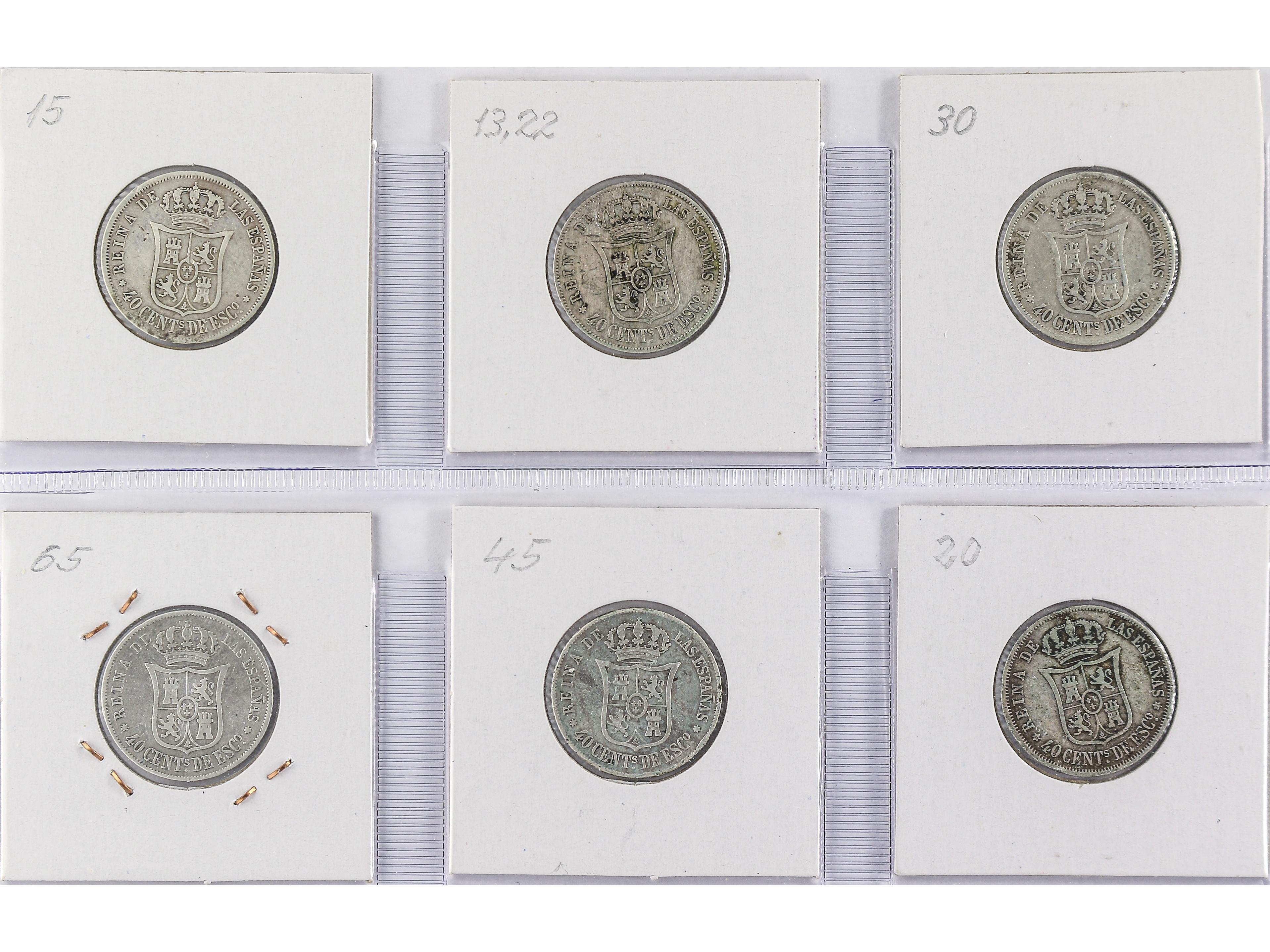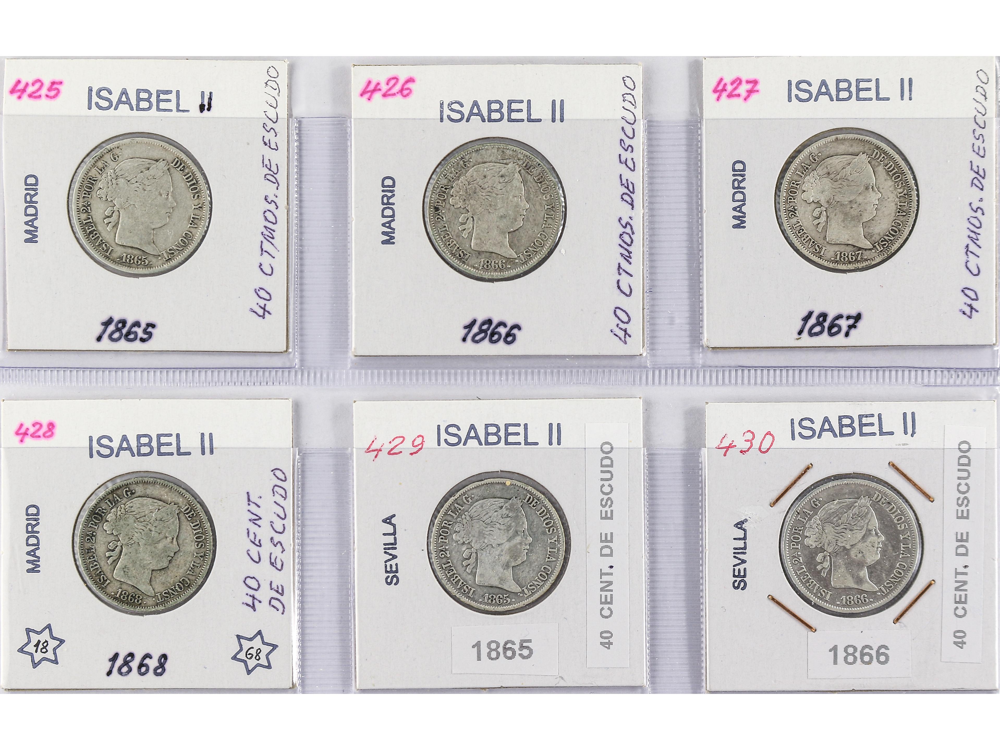 Lote 6 monedas 40 Céntimos de Escudo. 1865 a 1868. MADRID (4) y SEVILLA (2). Todas diferentes. A EXAMINAR. AC-500/505. MBC- a MBC.