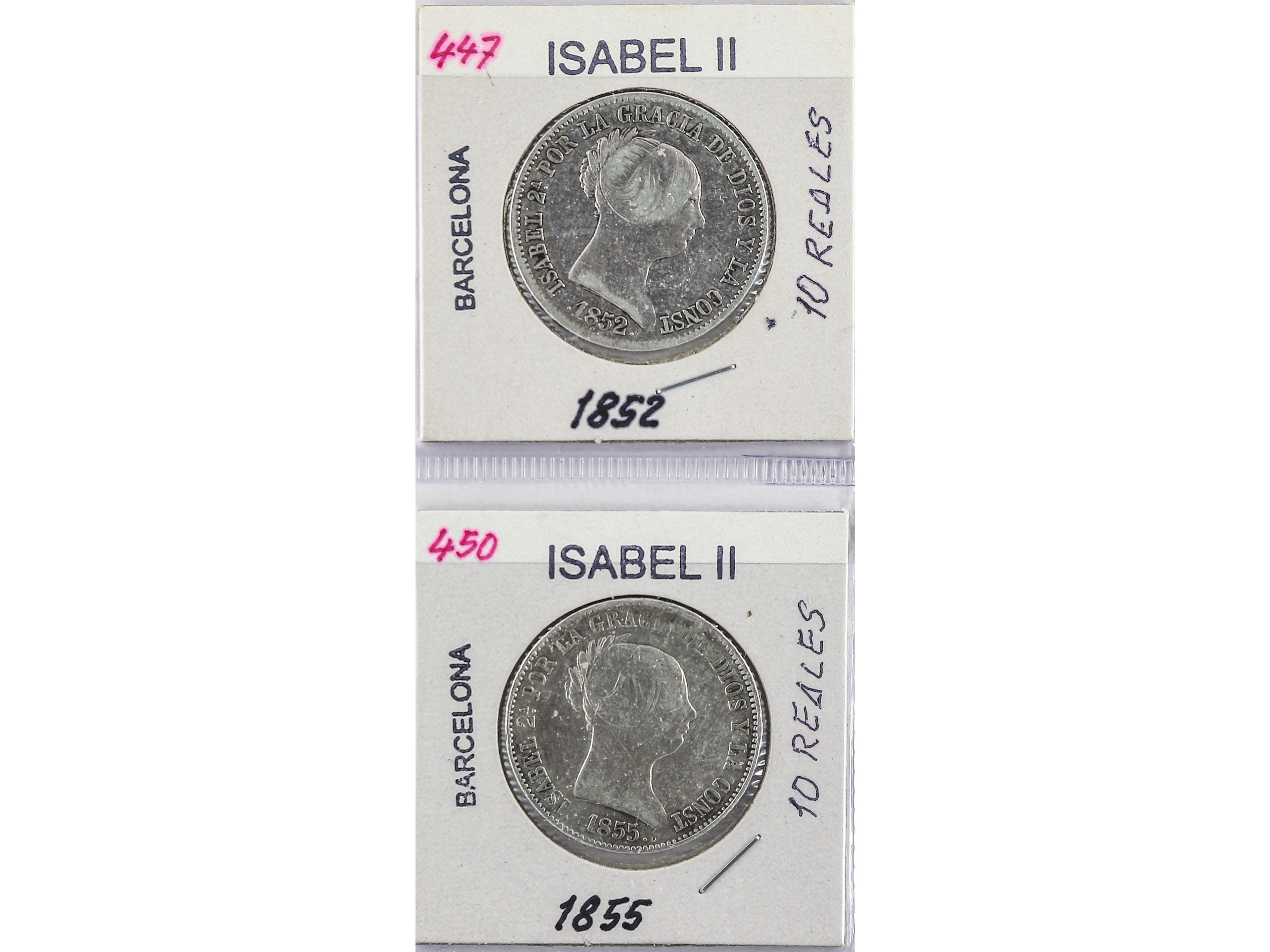 Lote 2 monedas 10 Reales. 1852 y 1855. BARCELONA. 13,07 y 12,56 grs. AC- 507, 510. MBC- a MBC. (Image1) (Image2)