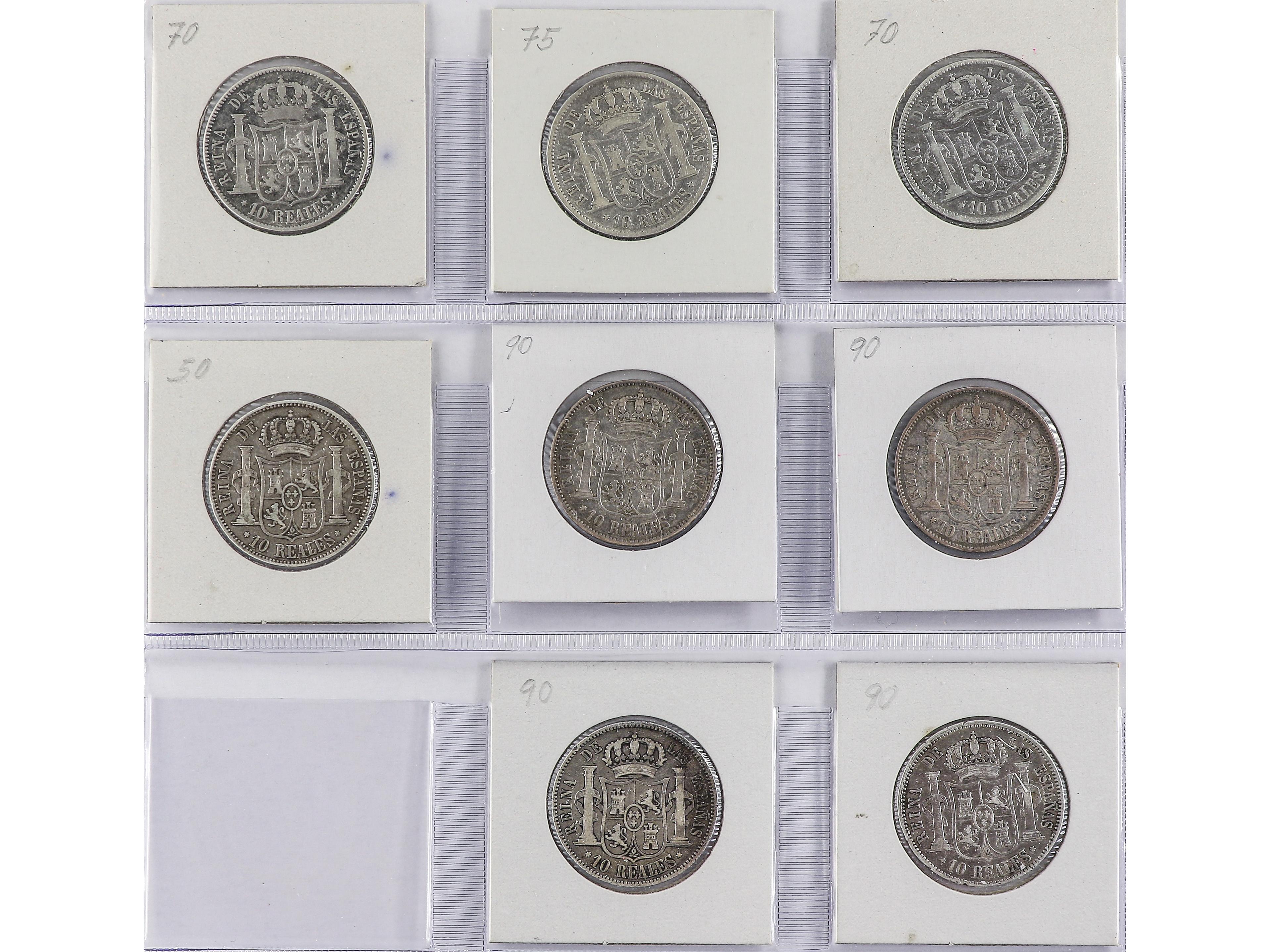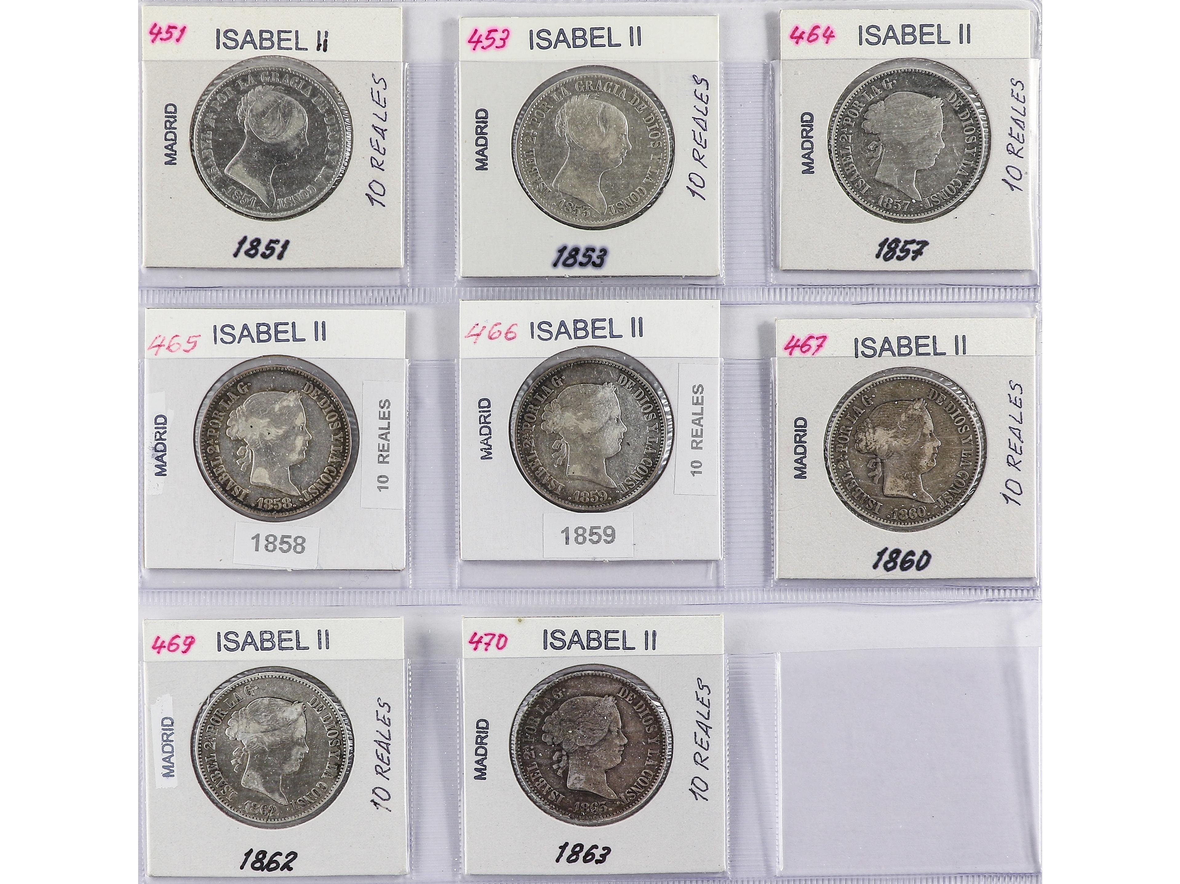 Lote 8 monedas 10 Reales. 1851 a 1863. MADRID. Todas diferentes. A EXAMINAR. AC- 525, 528, 534/537, 539, 540. BC + a MBC-.