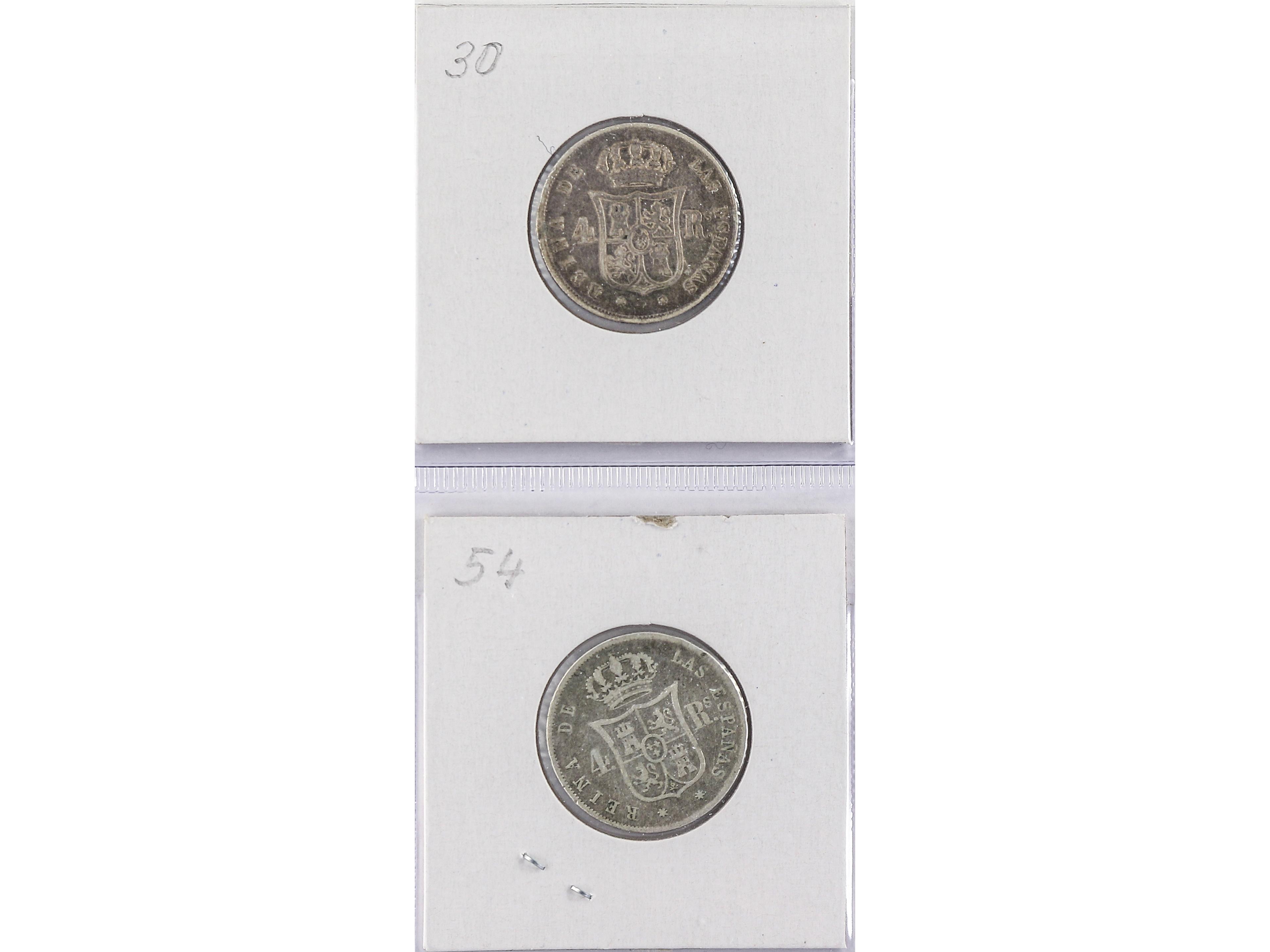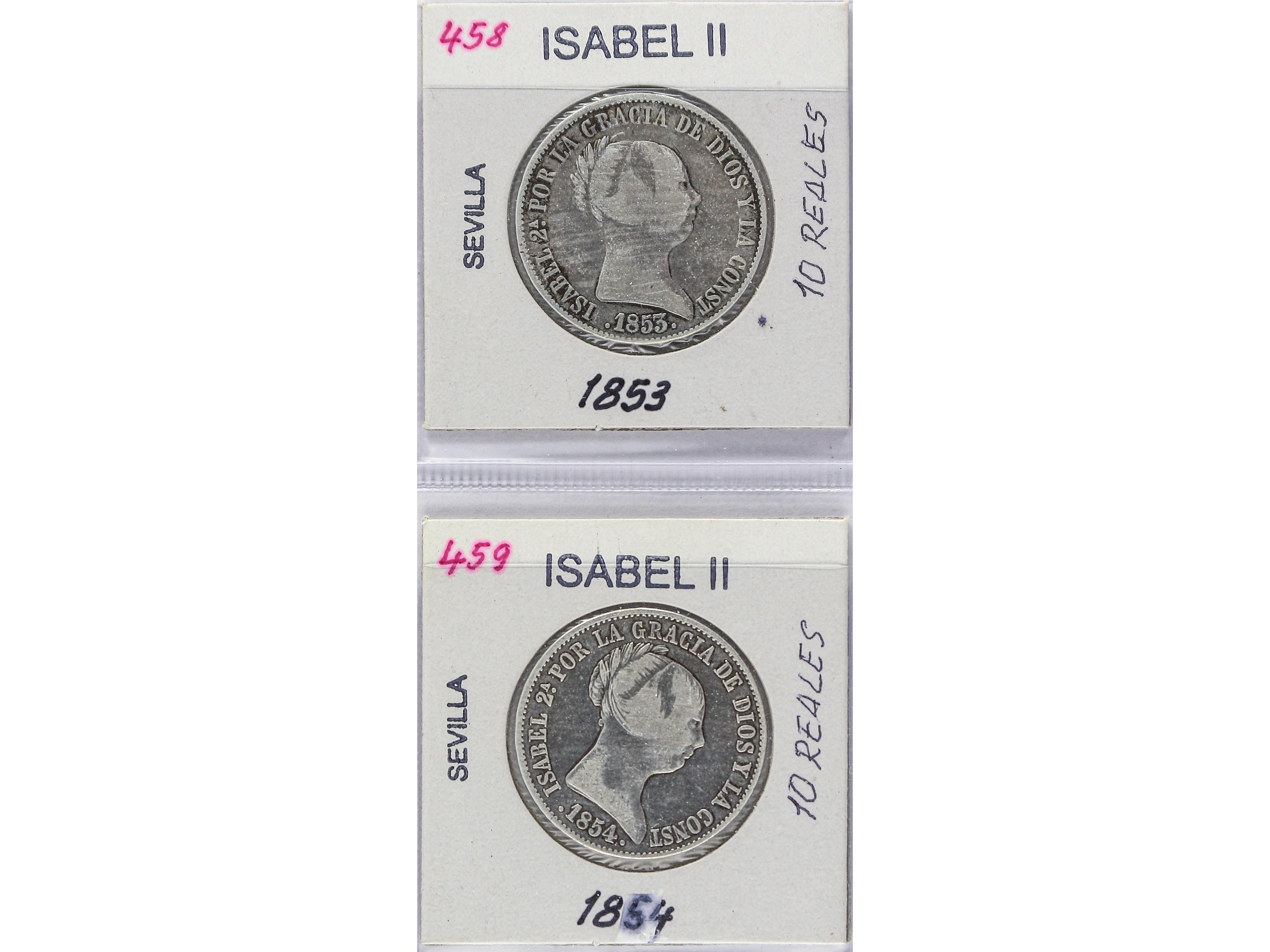 Lote 2 monedas 10 Reales. 1853 y 1854. SEVILLA. 12,36 y 12,59 grs. AC-549, 551. MBC-. (Image1) (Image2)