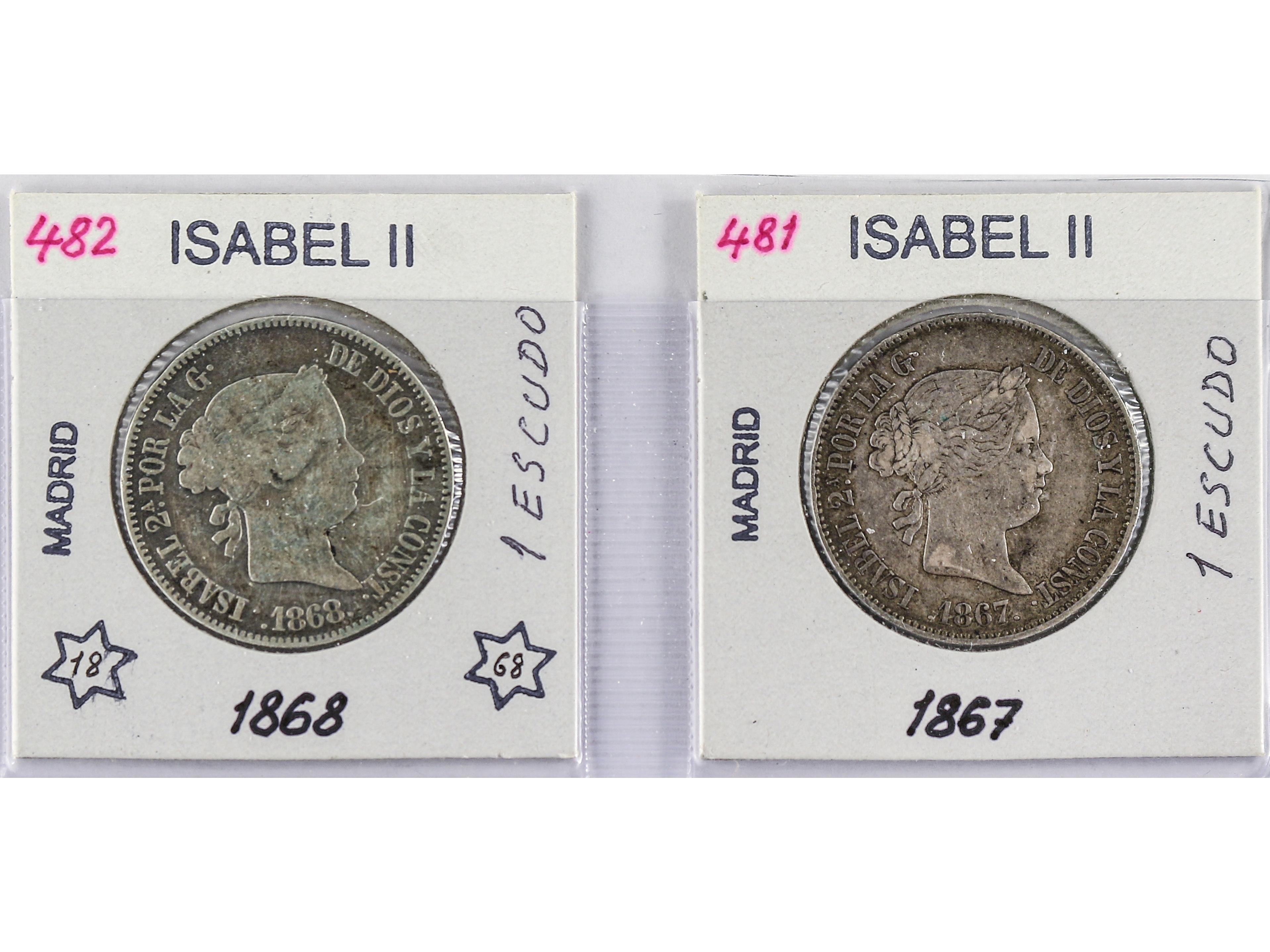 Lote 2 monedas 1 Escudo. 1867 y 1868. MADRID. 12,69 y 12,82 grs. AC-565, 566. MBC y MBC-. (Image1) (Image2)