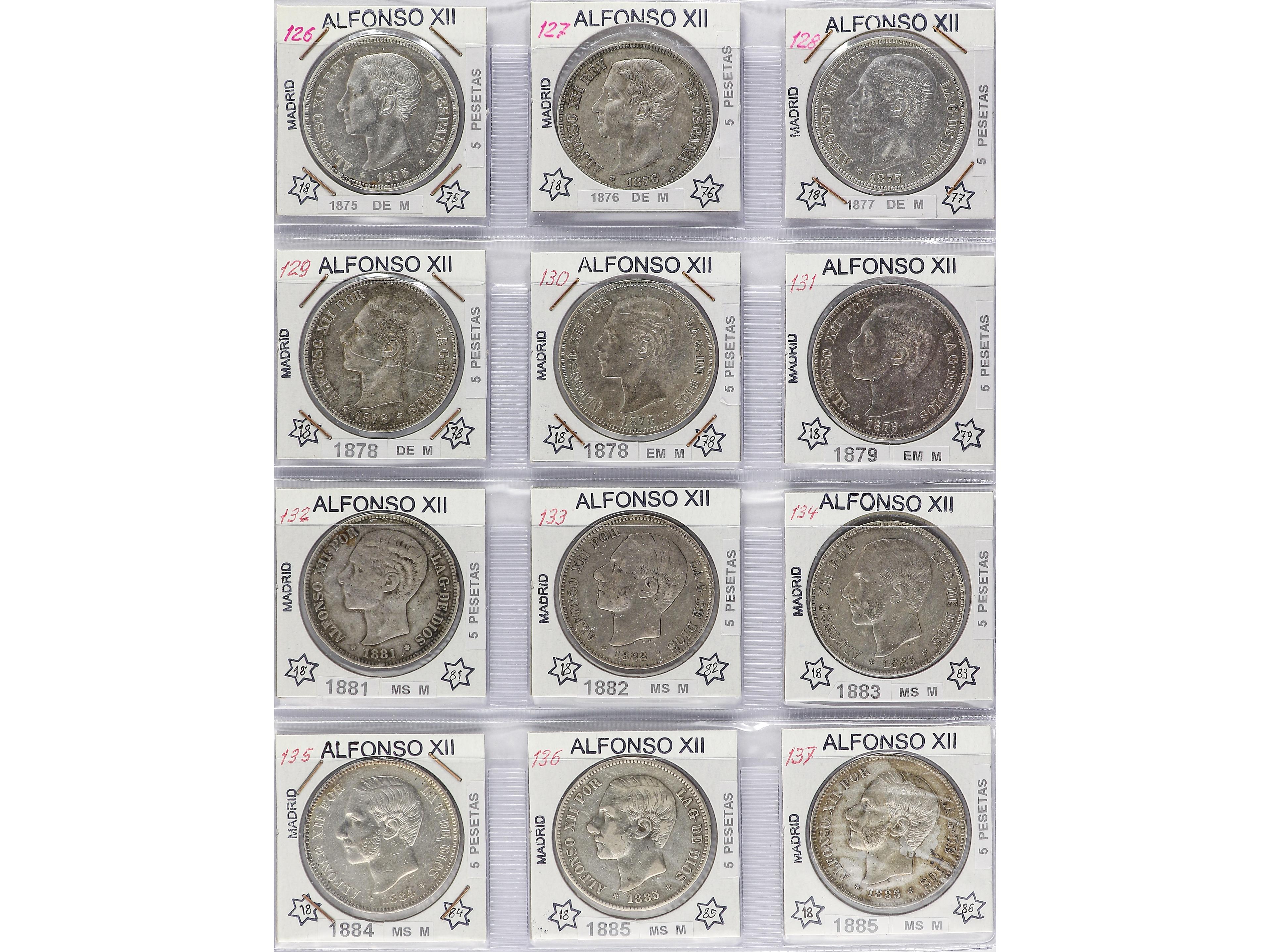 1882 imageLote 12 monedas 5 Pesetas. 1875 a 1885. Todas diferentes. La mayoría con cifras en las estrellas visibles. A EXAMINAR. MBC- a MBC+. (Image1) (Image2)