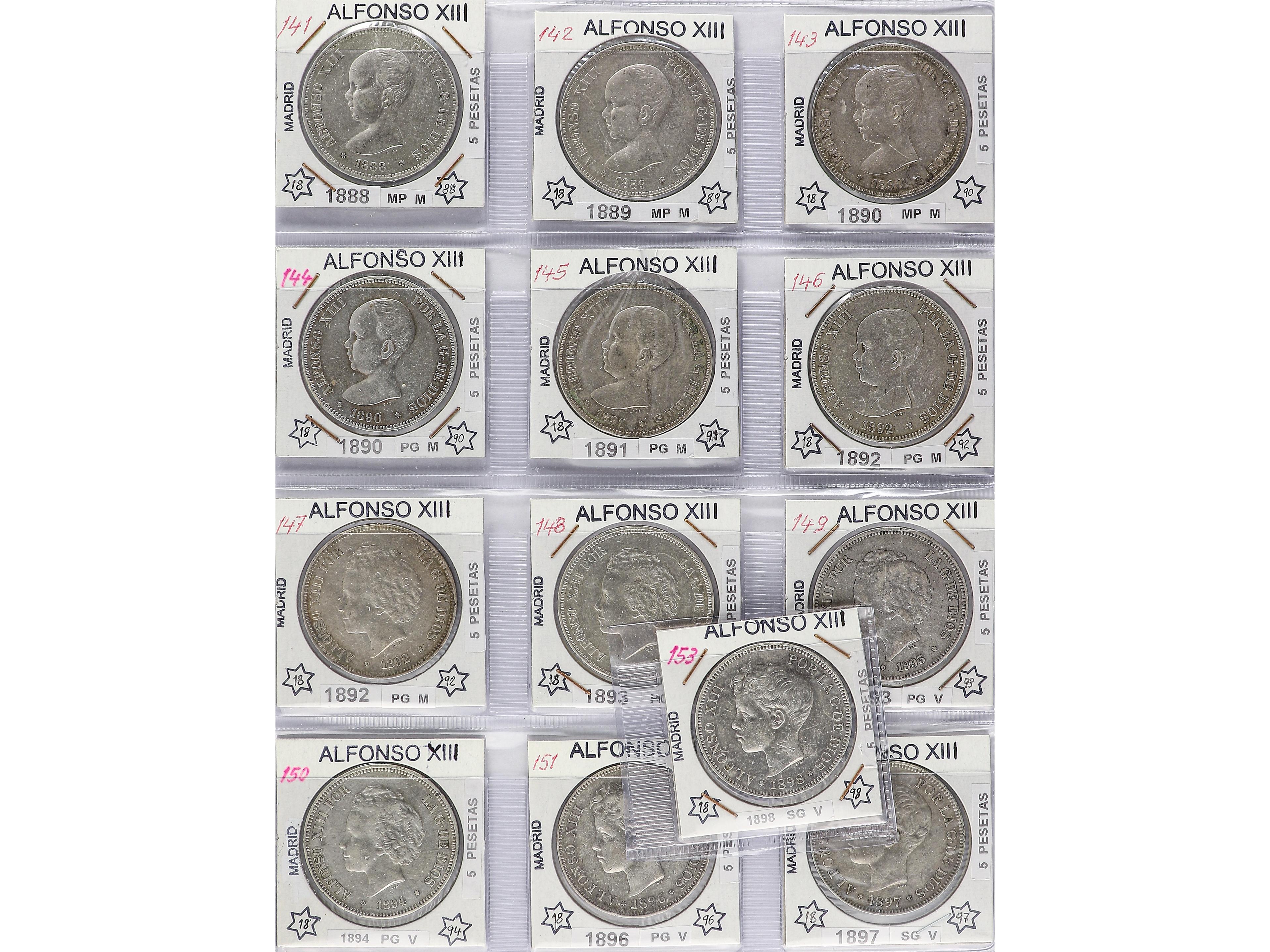 1899 imageLote 13 monedas 5 Pesetas. 1888 a 1898. Todas diferentes, la mayoría con cifras en las estrellas visibles. A EXAMINAR. MBC/MBC+. (Image1) (Image2)