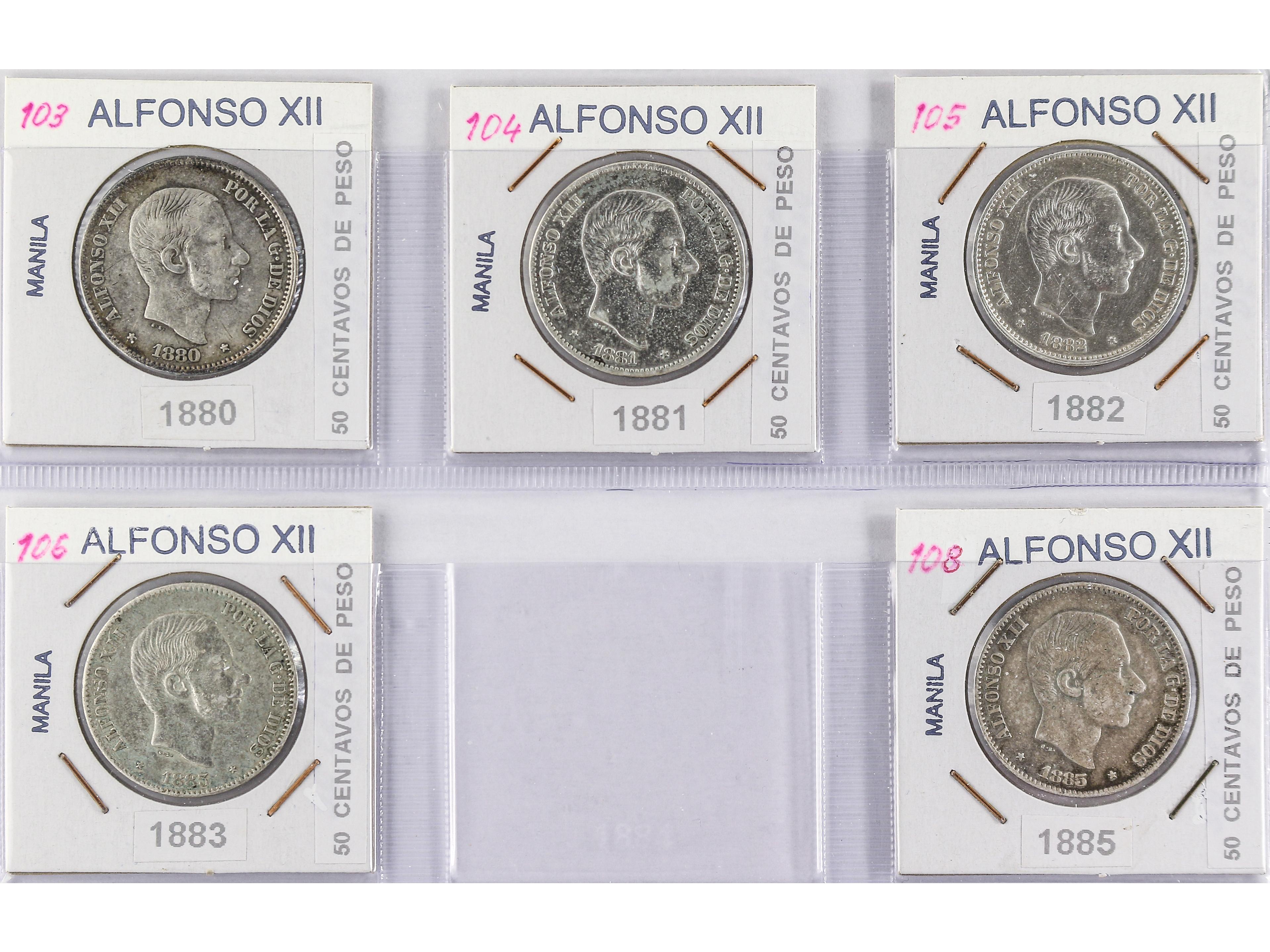 1880 imageLote 5 monedas 50 Centavos de Peso. 18880 a 1885. MANILA. Todas diferentes. A EXAMINAR. MBC- a MBC+. (Image1) (Image2)