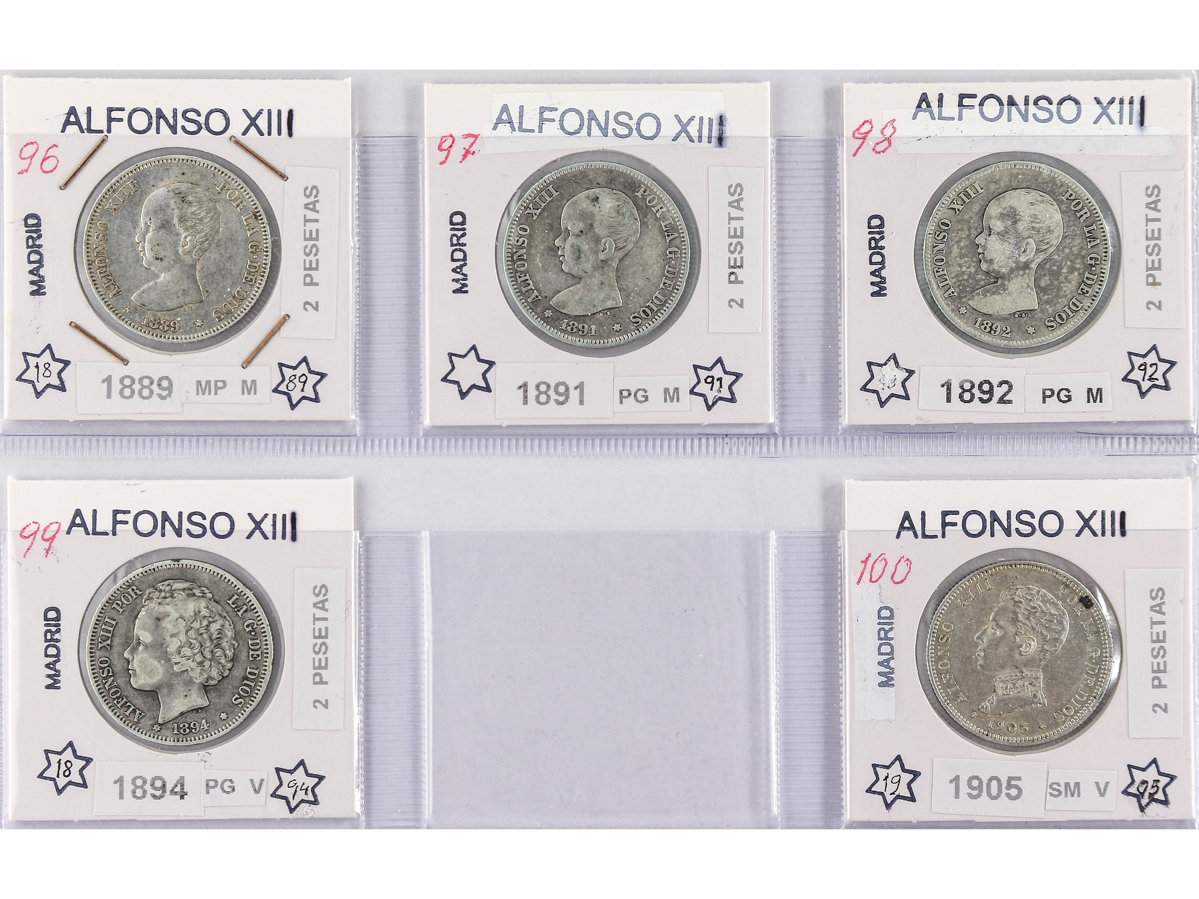 1895 imageLote 5 monedas 2 Pesetas. 1889 a 1905. Todas diferentes. A EXAMINAR. AC-82, 84/87. MBC- a EBC-. (Image1) (Image2)