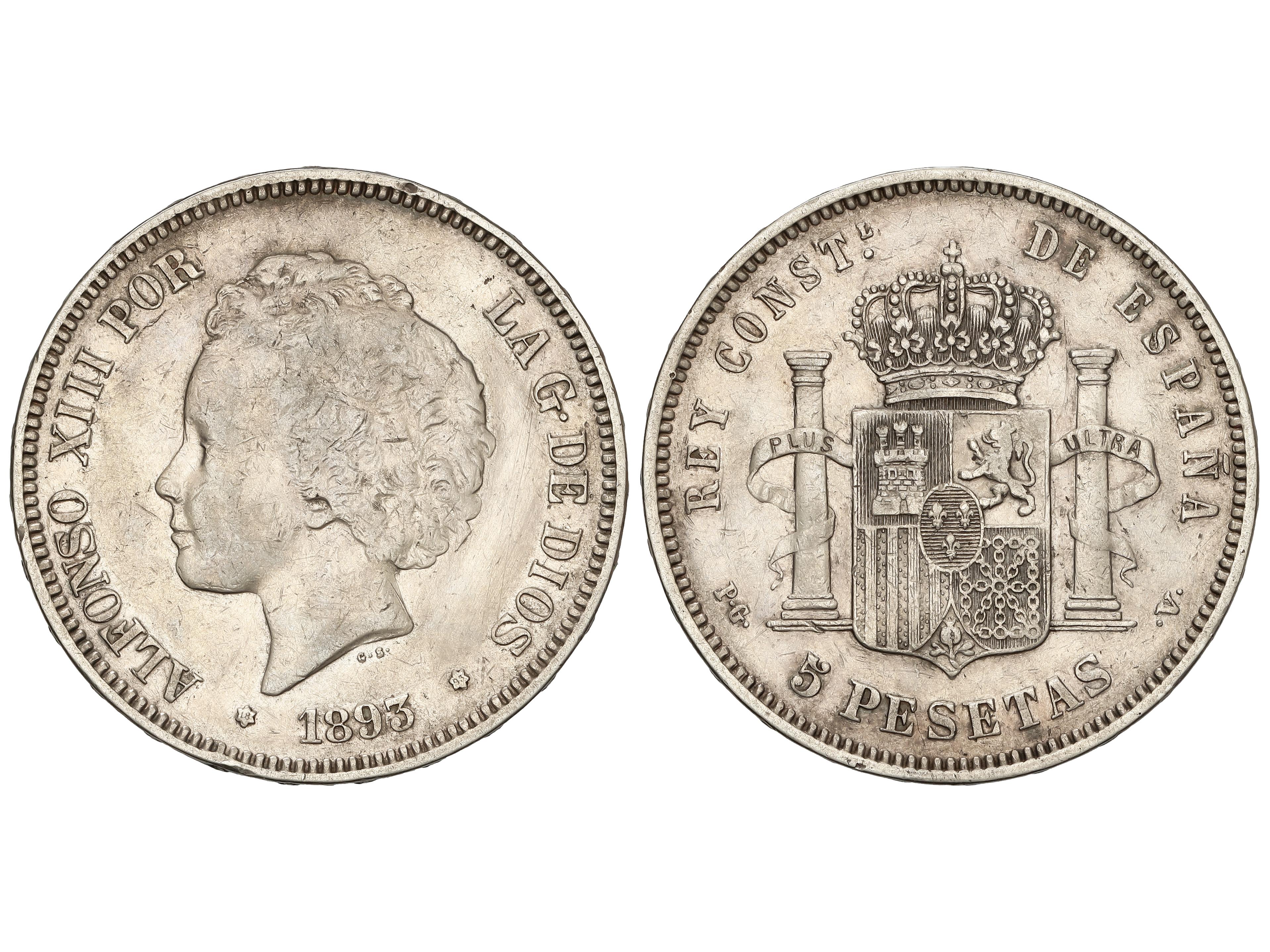 1896 image5 Pesetas. 1893 (*18-93). P.G.-V. Estrellas flojas. (Golpecitos). AC-103. MBC+. (Image1)