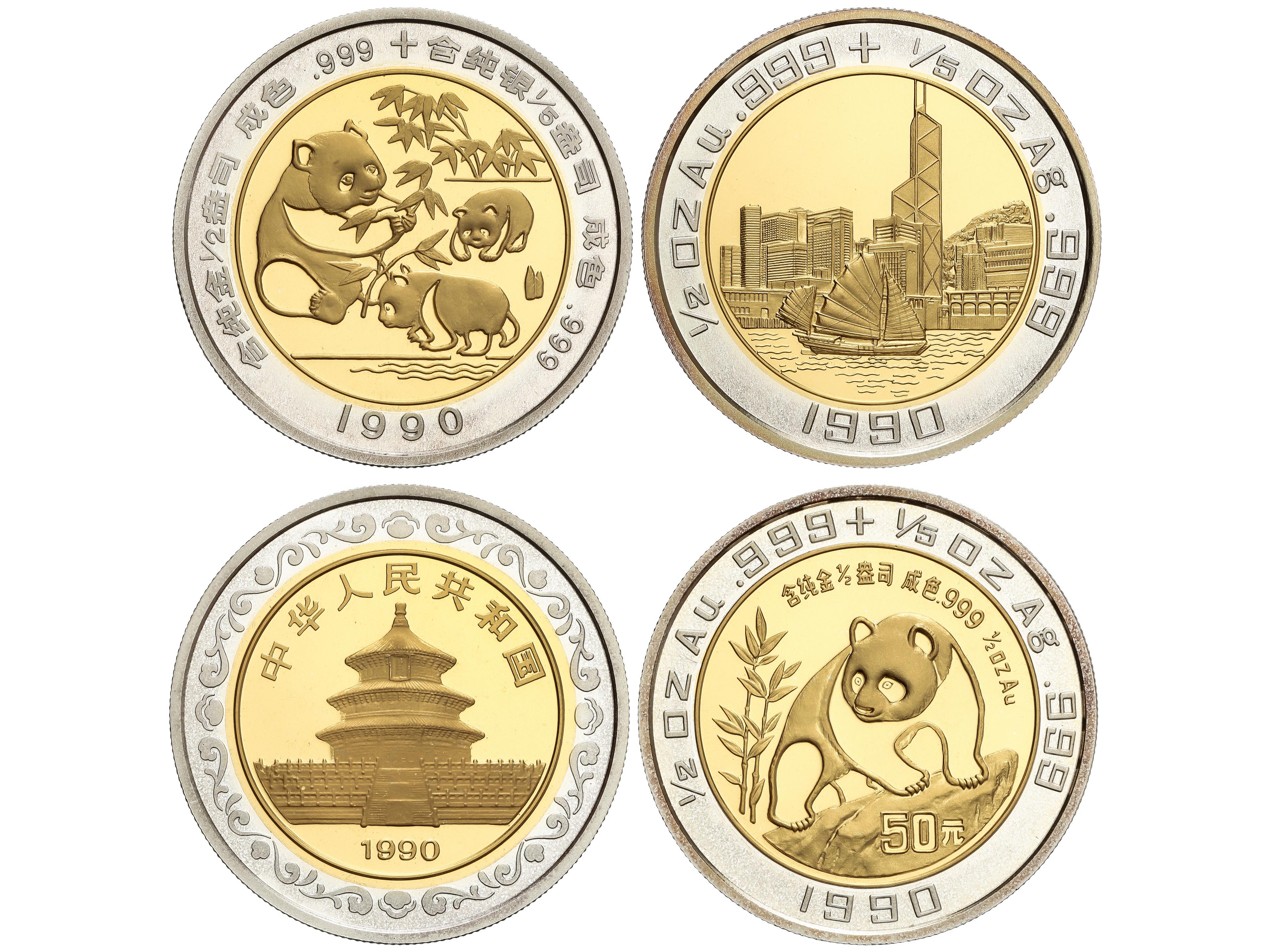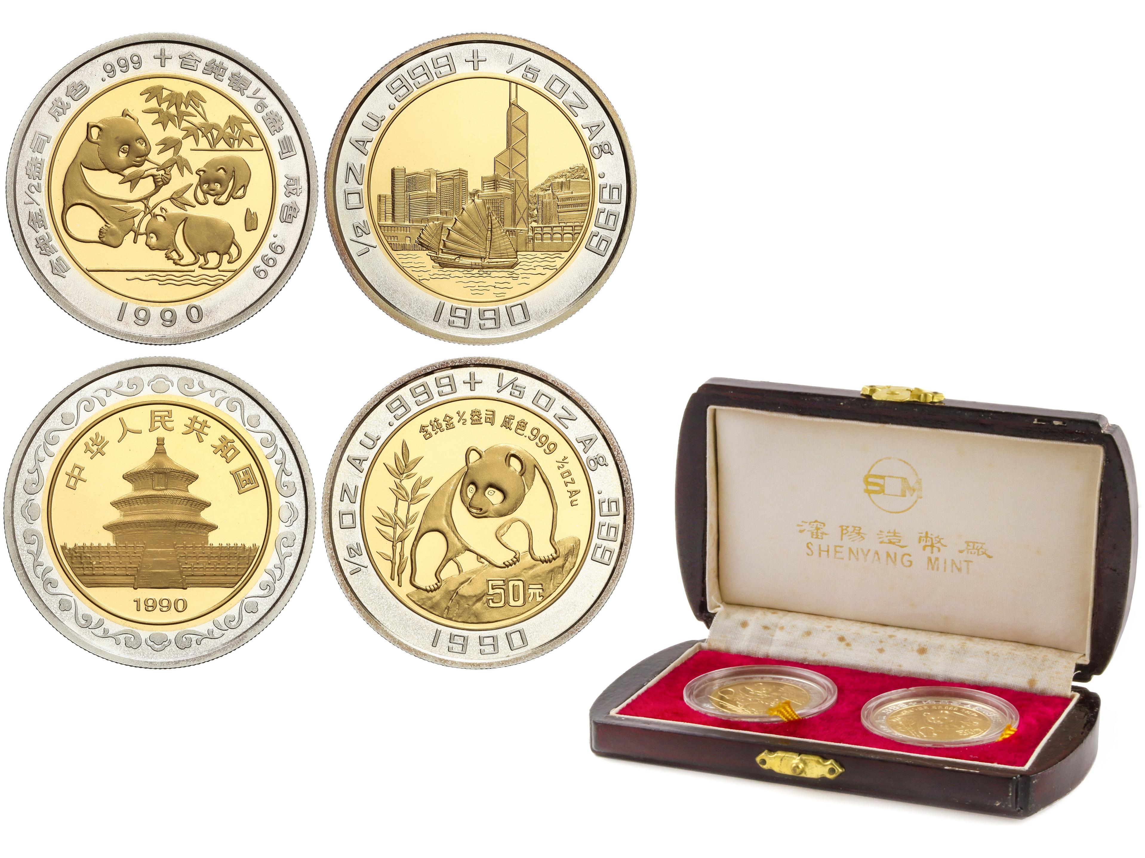 1954 imageLote 2 medallas. 1990. Anv.: Oso Panda. (1/2 Oz AU + 1/5 Oz AR) X 2 grs. AU+AR (999). INTERNATIONAL COIN CONVENTION. En estuche original. PROOF. (Image1) (Image2)