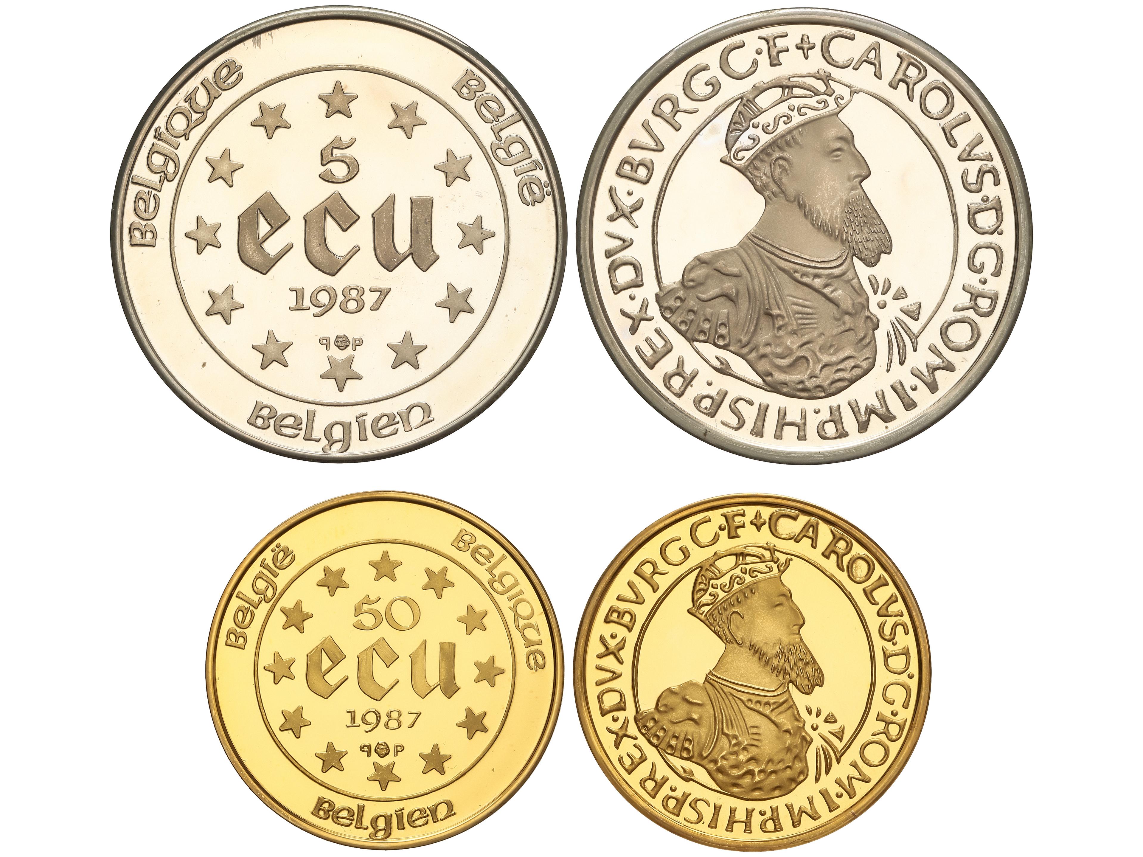1951 imageSet 2 monedas 5 y 50 Ecu. 1987. 17,20 (AU) grs. AU (900),AR. Carlos V. En estuche original con certificado. Fr-427; KM-166, 167. PROOF. (Image1)