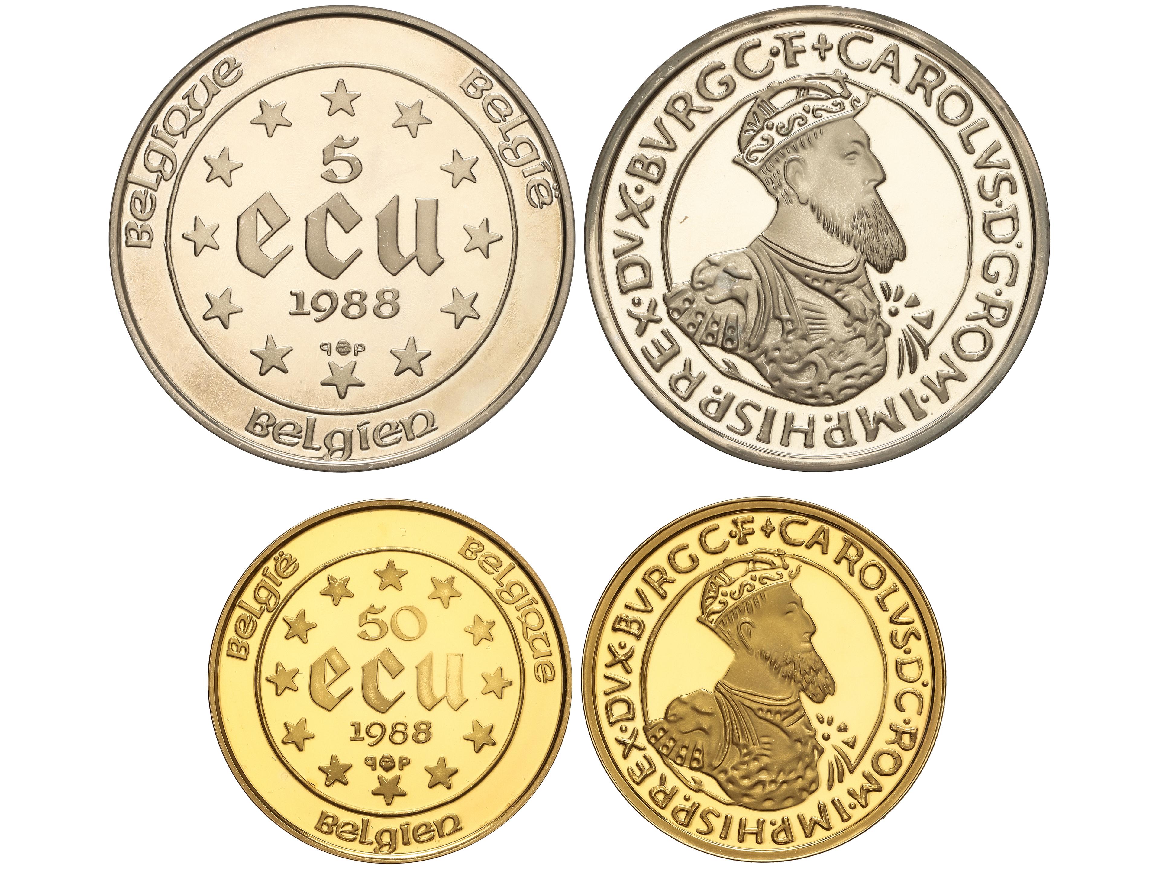 1952 imageSet 2 monedas 5 y 50 Ecu. 1988. 17,20 (AU) grs. AU (900),AR. Carlos V. En estuche original con certificado. Fr-427; KM-166, 167. PROOFLIKE. (Image1)