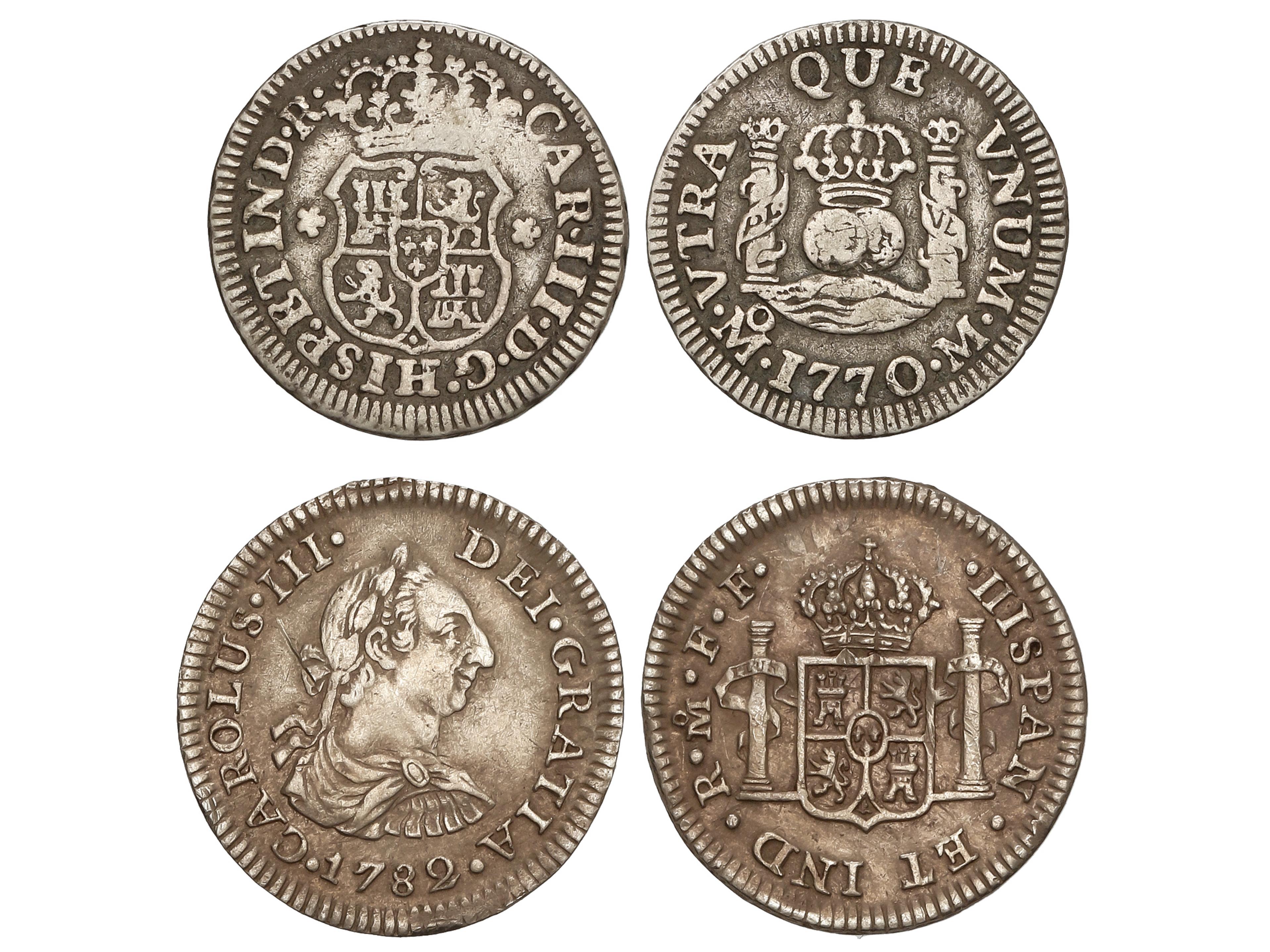 2050 imageLote 2 monedas 1/2 Real. 1770 y 1782. MÉXICO. M y F. F. 1,57 y 1,63 grs. (La de 1782 rayita en anverso). AC-188, 209. MBC y MBC+. (Image1)