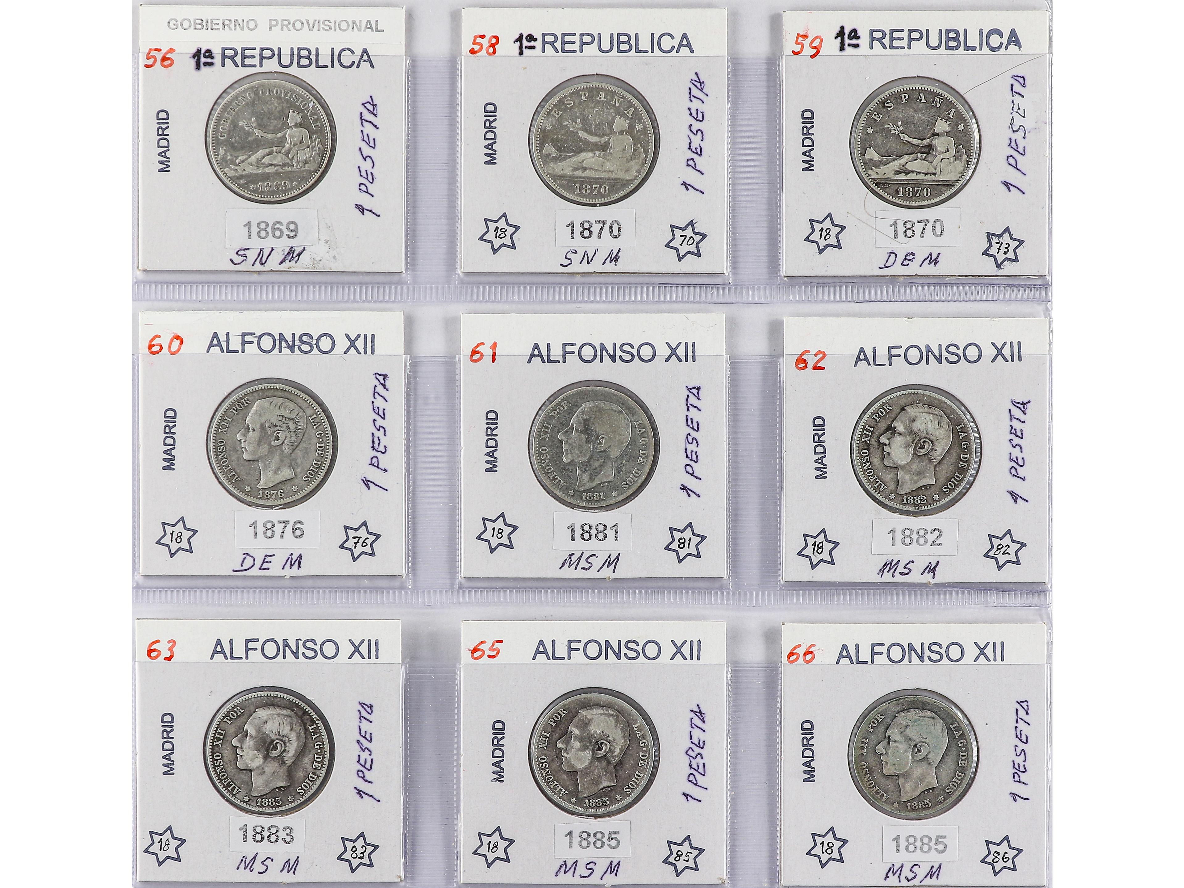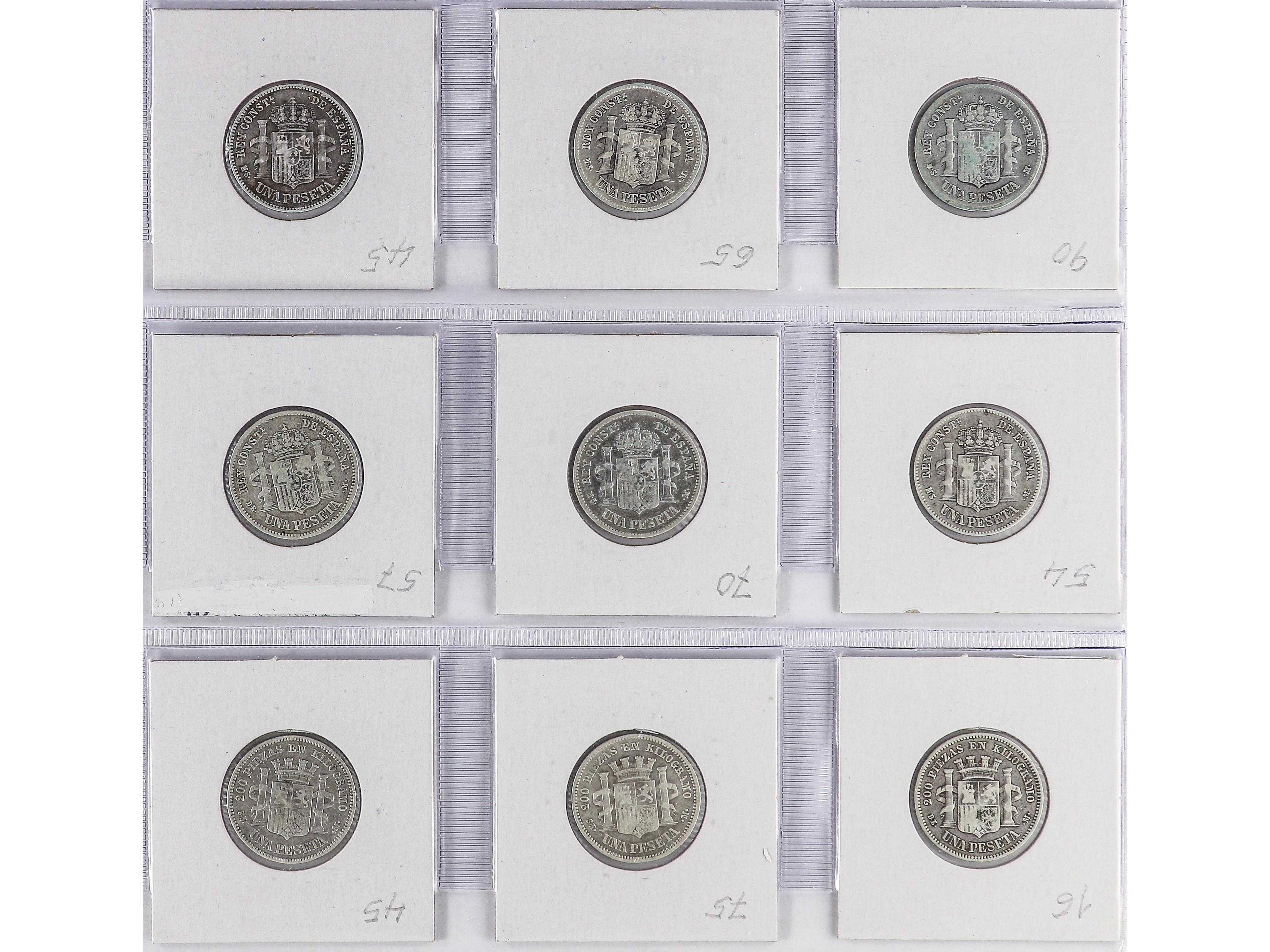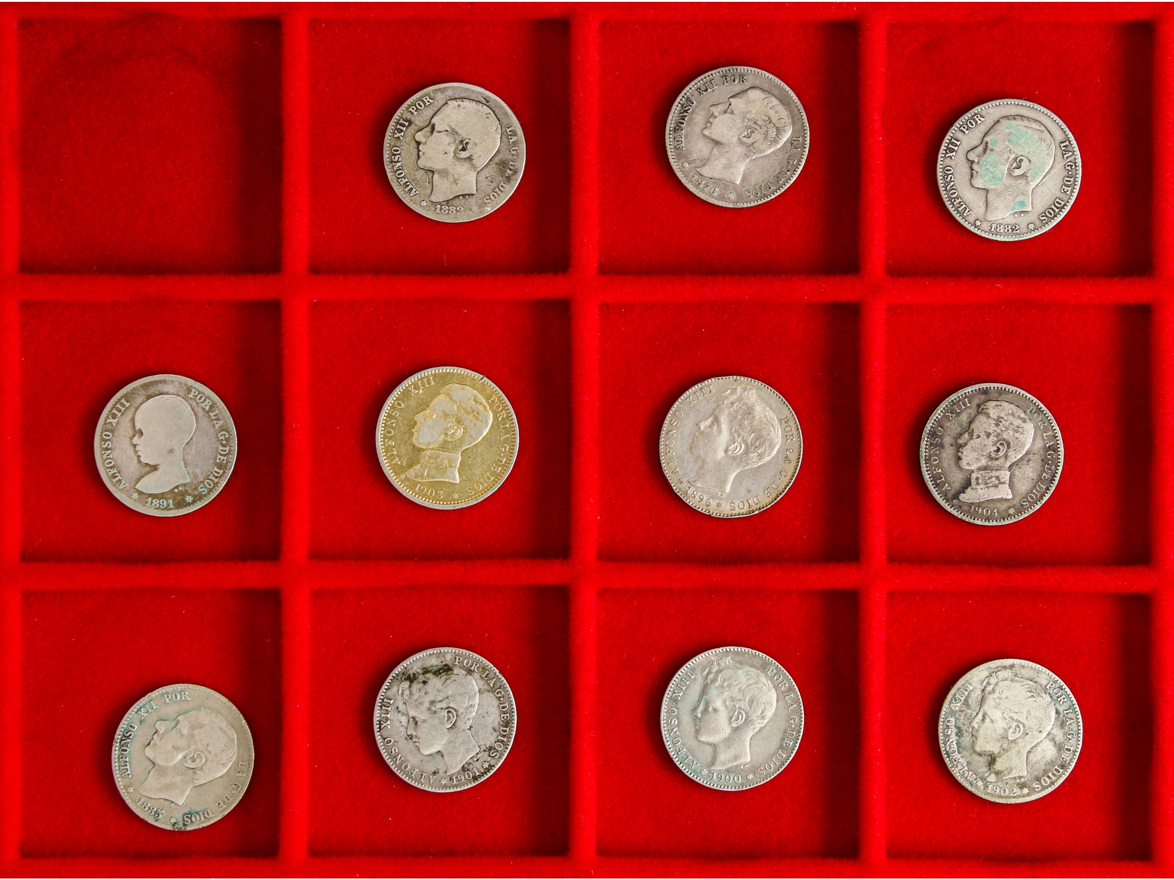 2059 imageLote 11 monedas 1 Peseta. 1876, 82 (2), 85, 91, 96, 1900, 01, 02, 03, 04. ALFONSO XII y XIII. A EXAMINAR. BC+ a MBC+. (Image1)