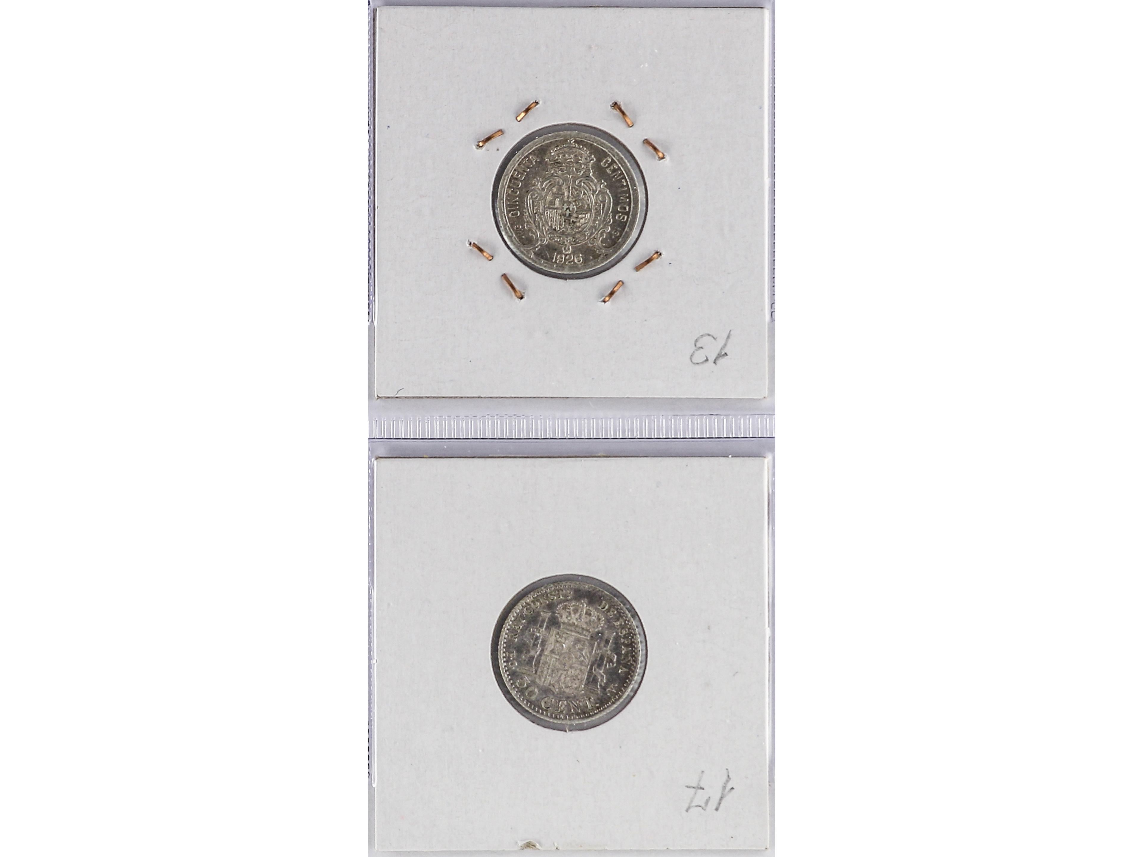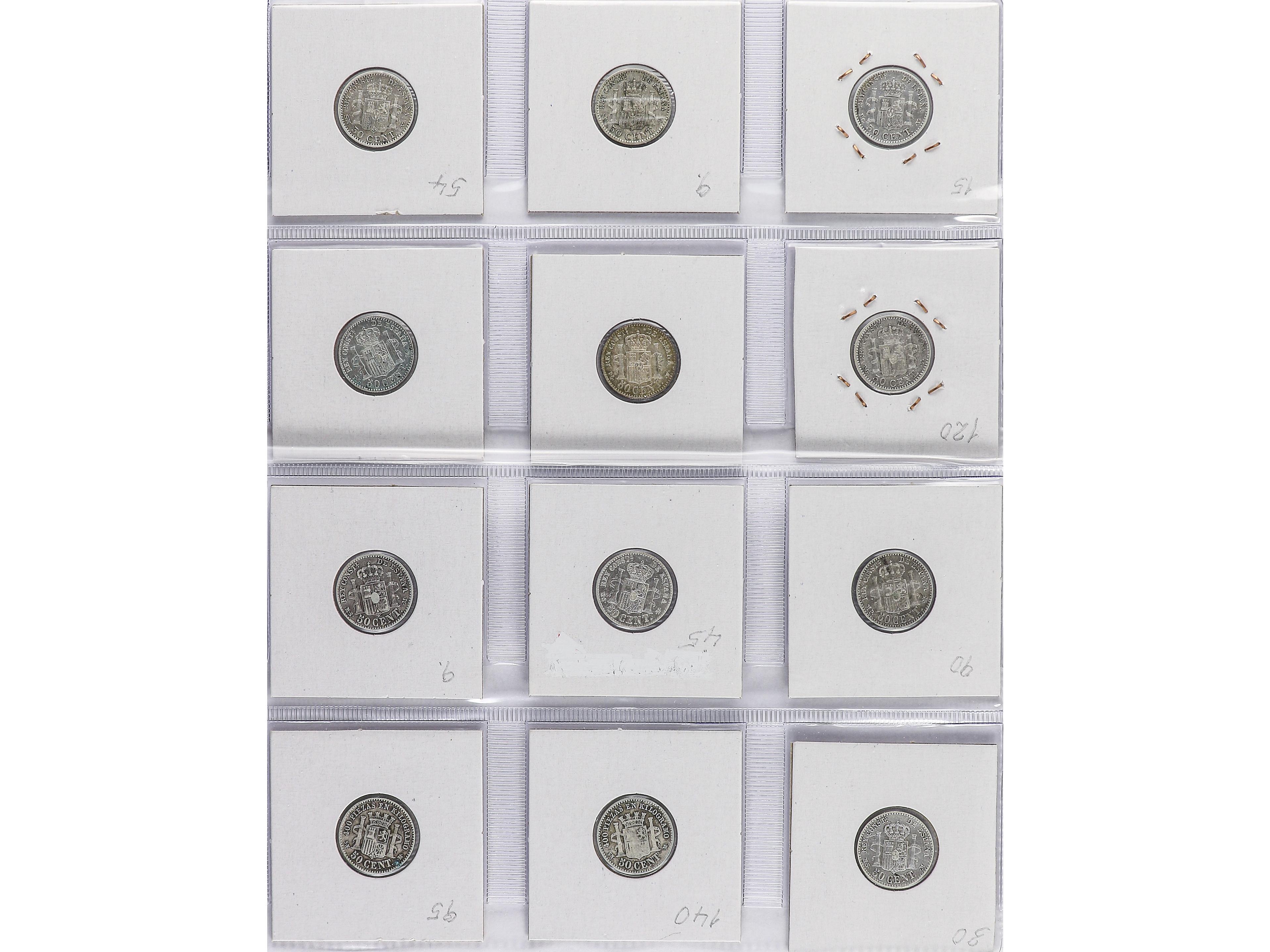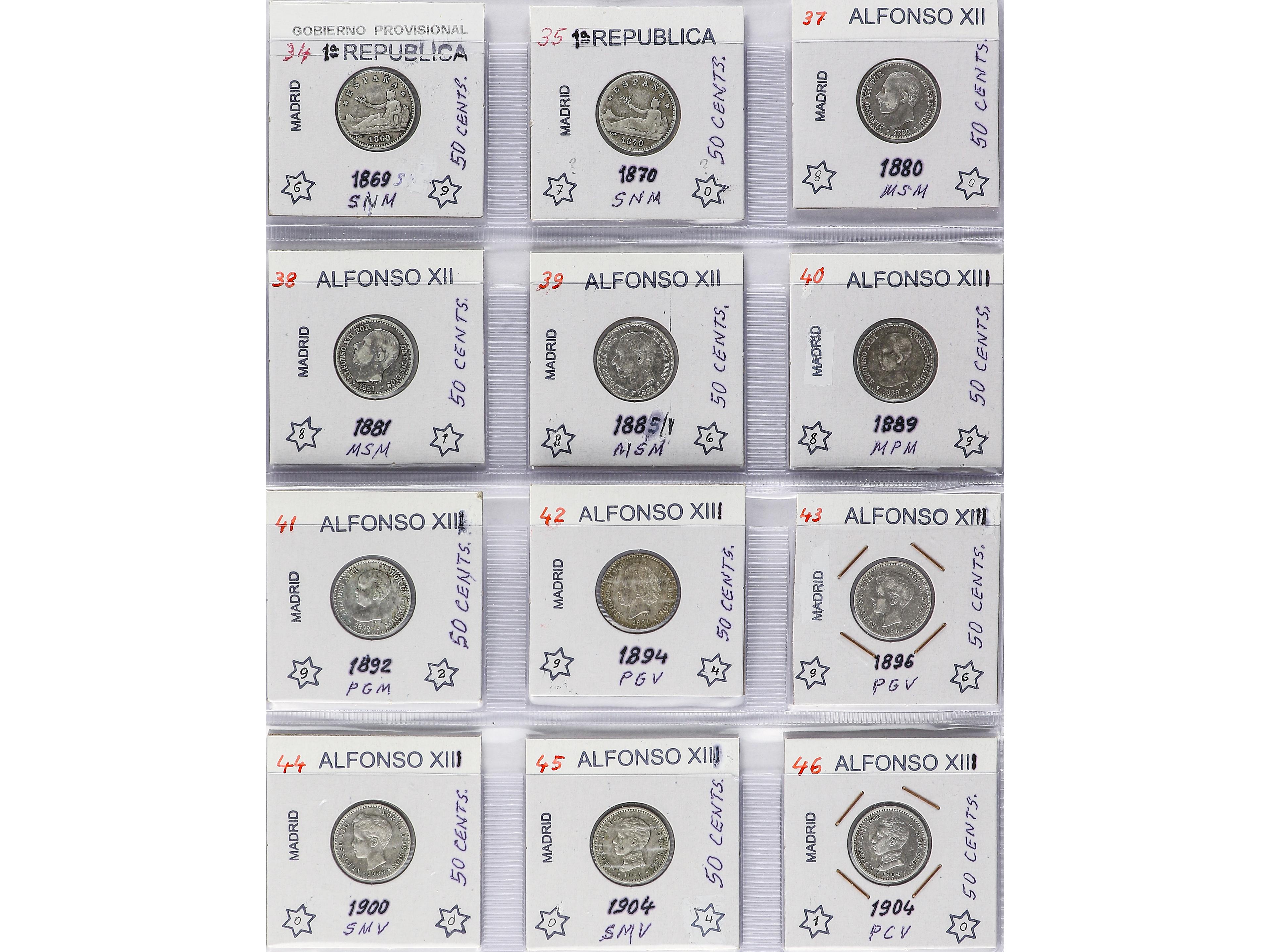 2057 imageLote 14 monedas 50 Céntimos. 1869 a 1926. I REPÚBLICA a ALFONSO XII. Todas diferentes, colección completa. A EXAMINAR. MBC- a EBC. (Image1) (Image2) (Image3) (Image4)