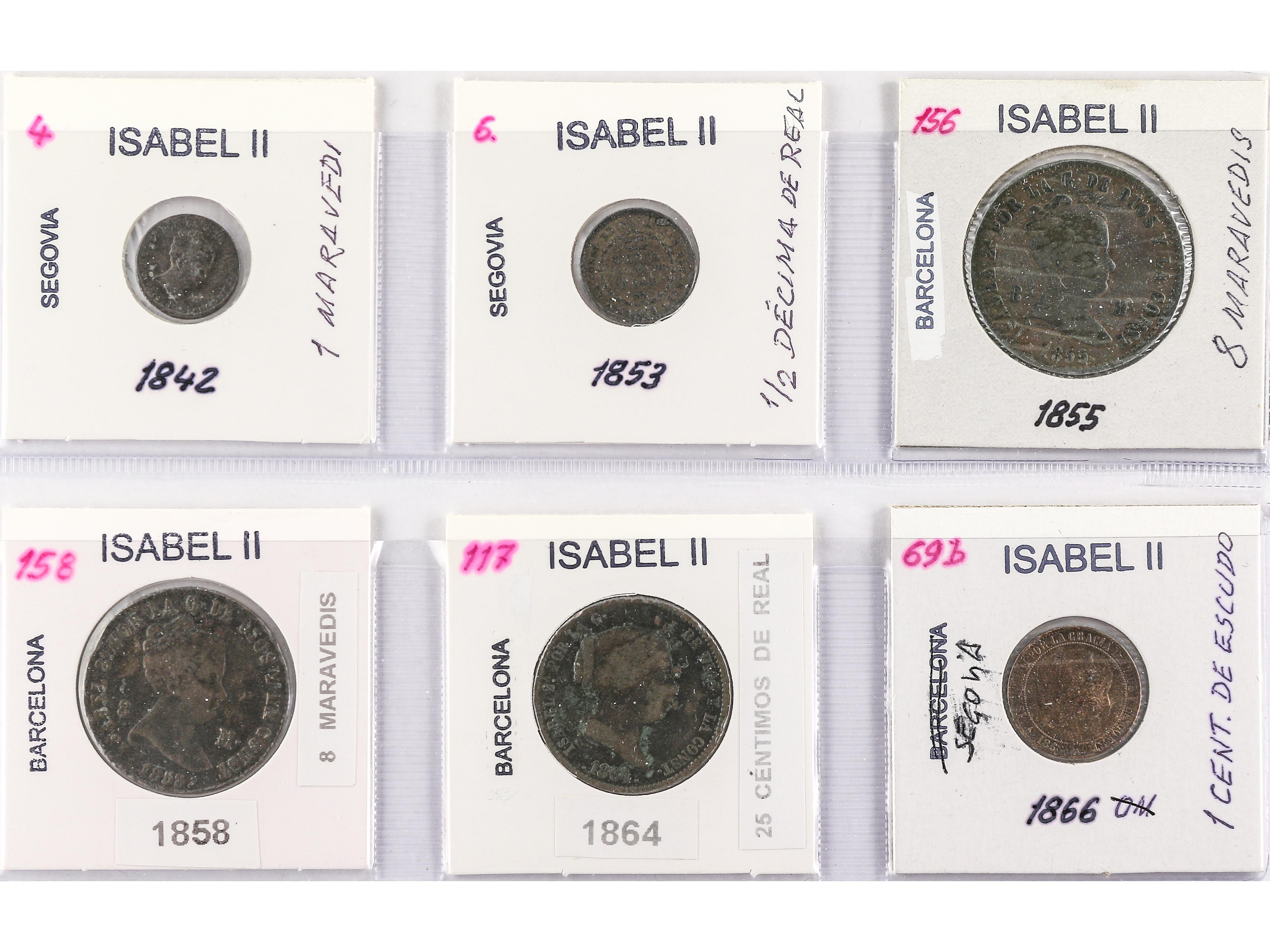 2053 imageLote 6 monedas 1 Maravedí a 1 Céntimo de Escudo. 1842 a 1866. BARCELONA (3) y SEGOVIA (3). Todas diferentes. A EXAMINAR. AC-35, 140, 98, 100, 182 y 208. BC+ a MBC-. (Image1) (Image2)