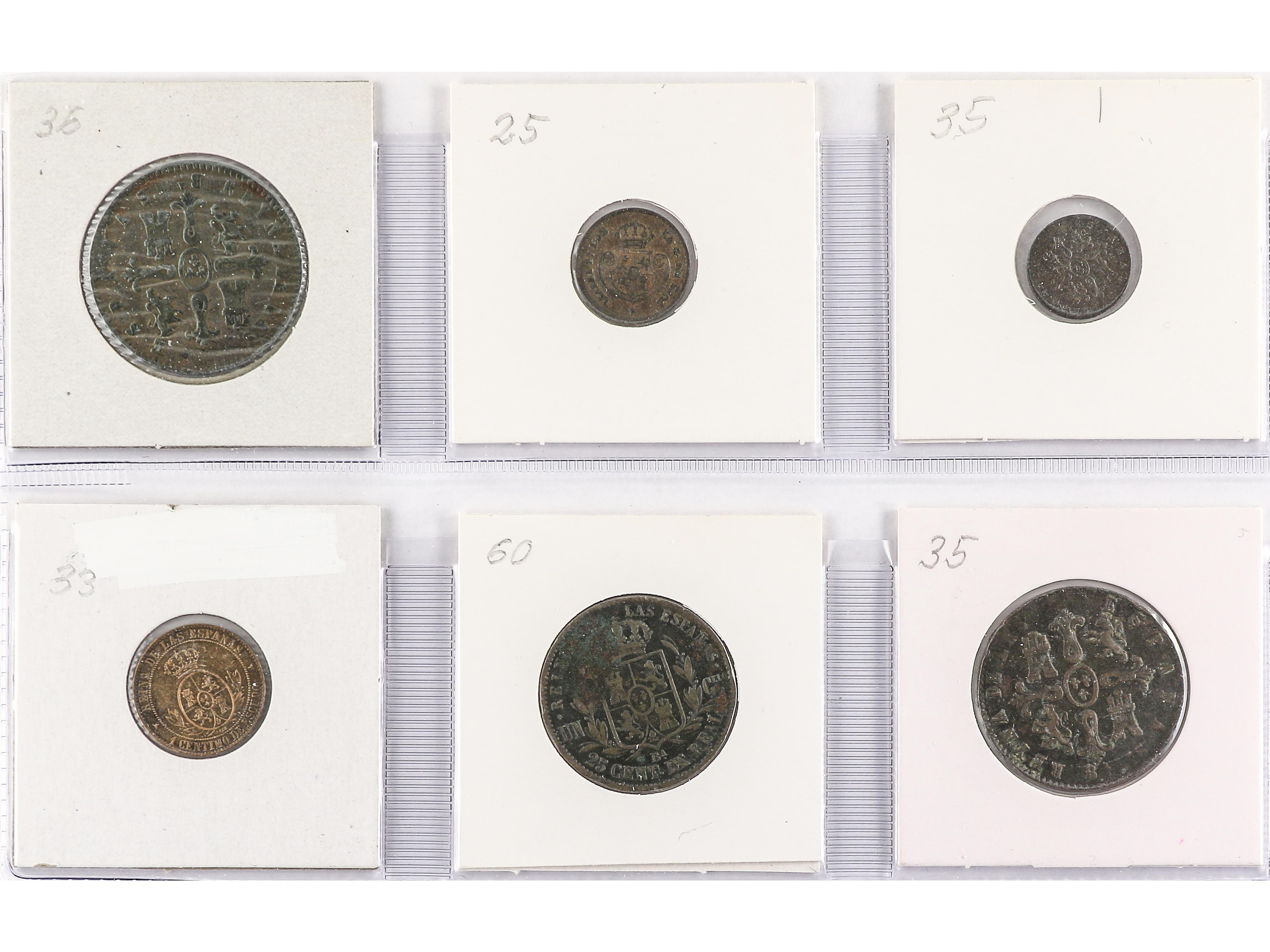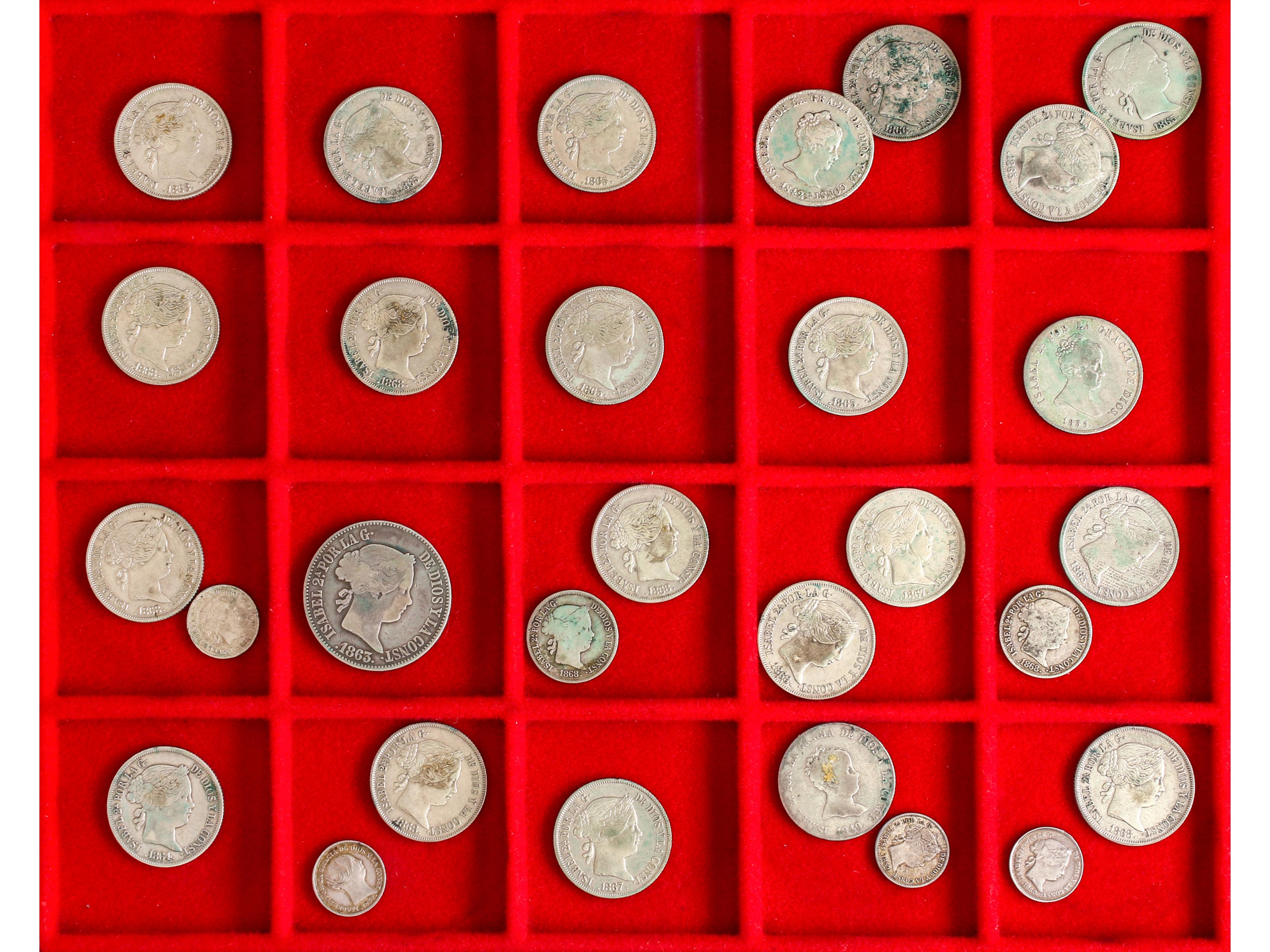 2054 imageLote 29 monedas 10 y 20 Céntimos de Escudo, 10 Centavos de Peso, 40 Centavos de Peso (18), 1 Real (3), 4 Reales (4), 10 Reales. 1835 a 1869. AR. A EXAMINAR. MBC- a EBC-. (Image1)