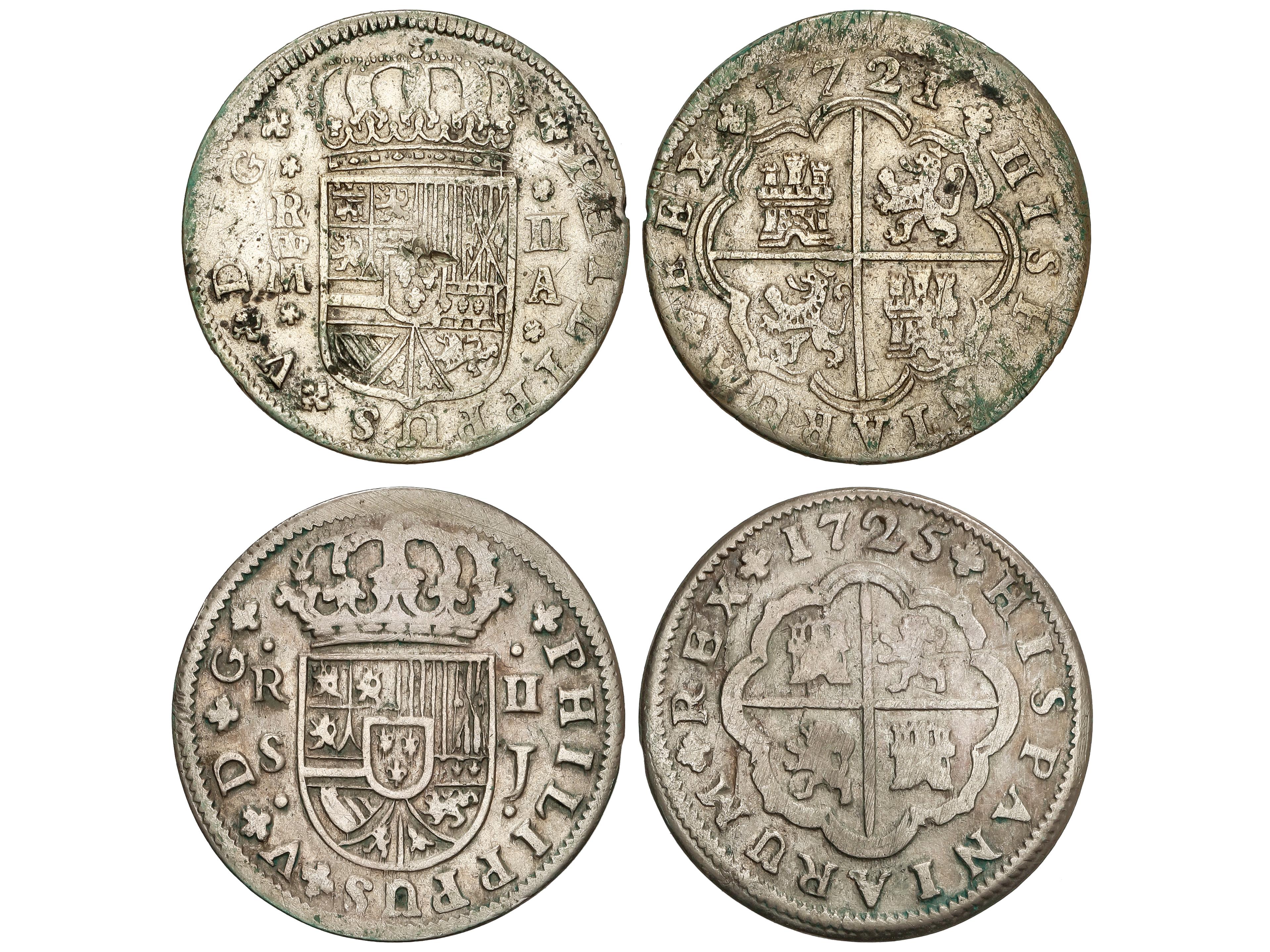 2049 imageLote 2 monedas 2 Reales. 1721 y 1725. MADRID y SEVILLA. 4,44 y 4,83 grs. AC-774 y 983. MBC-. (Image1)