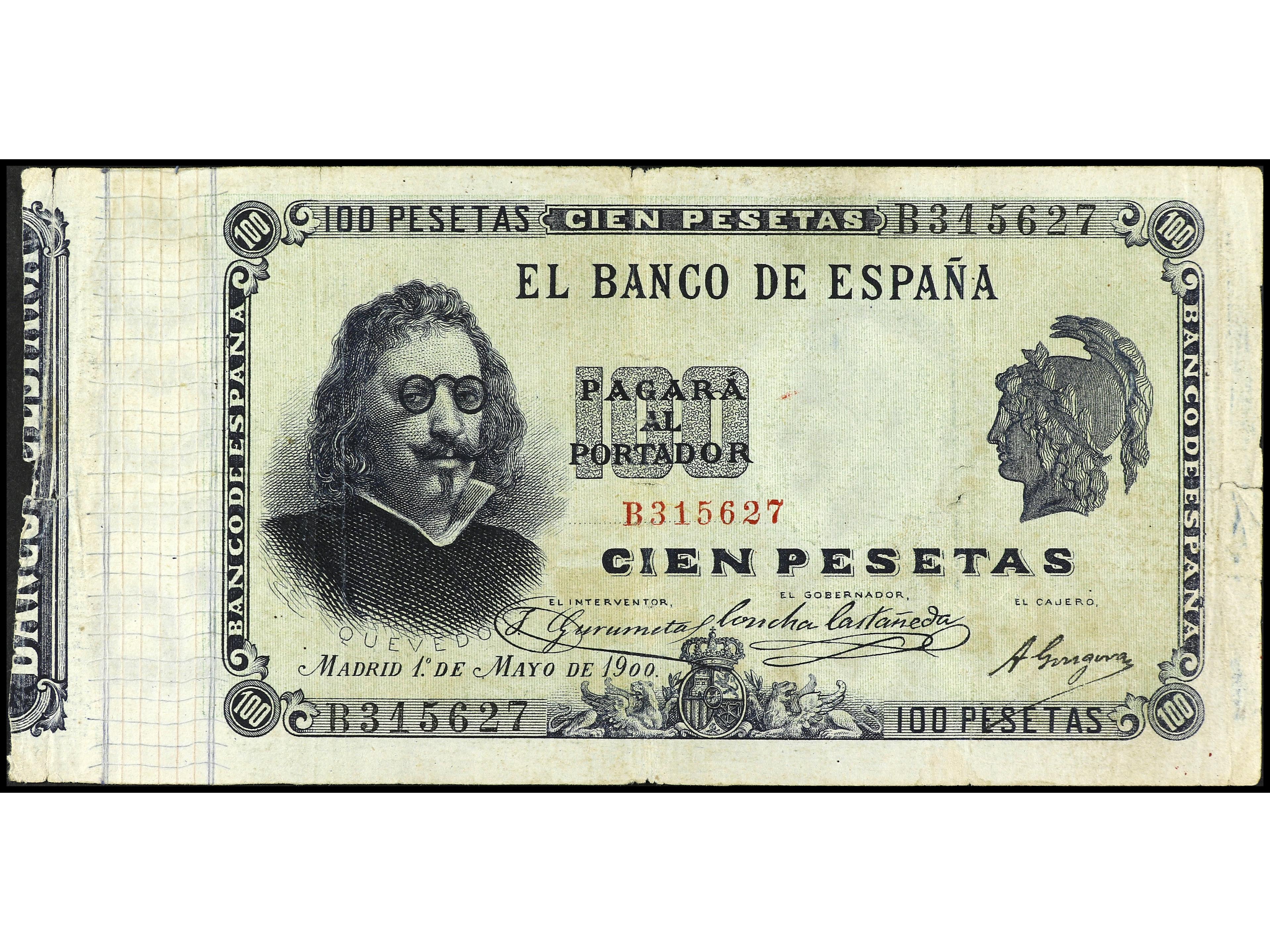 100 Pesetas. 1 Mayo 1900. Quevedo. Serie B. (Roturas). RARO. Ed-308. MBC. (Image1) (Image2)