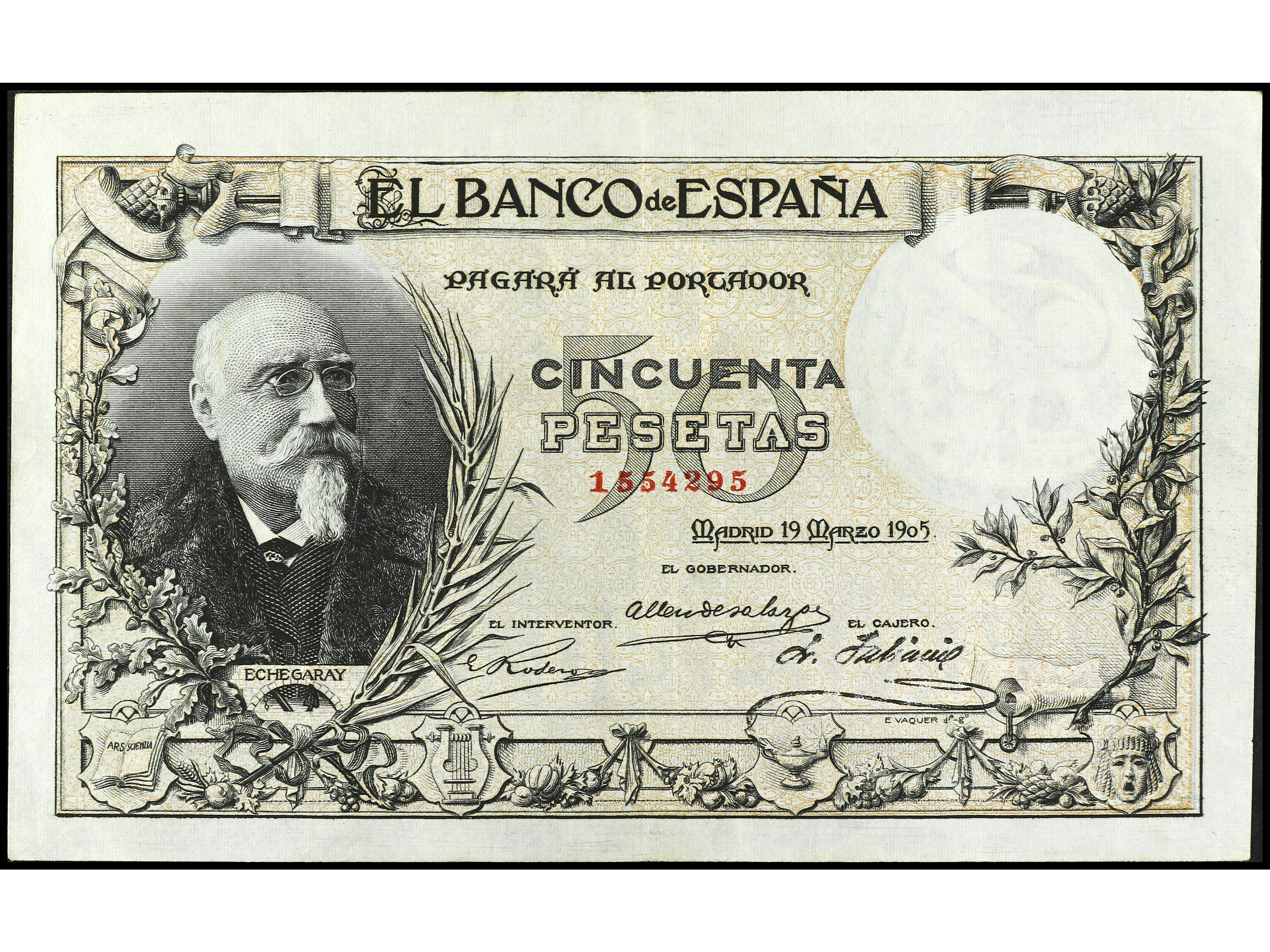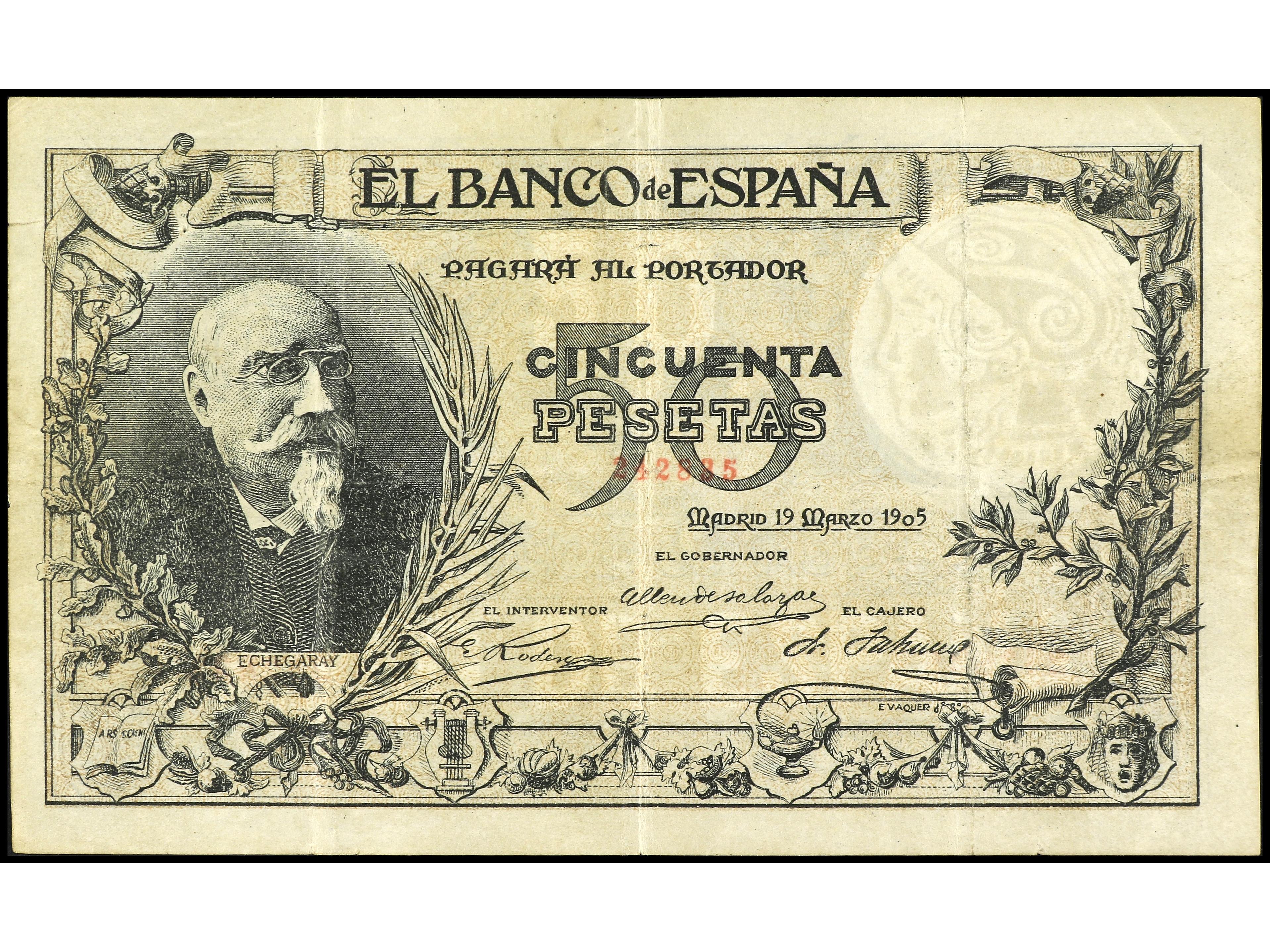50 Pesetas. 19 Marzo 1905. Echegaray. (Leves manchitas en reverso). MUY ESCASO. Ed-312. MBC+. (Image1) (Image2)