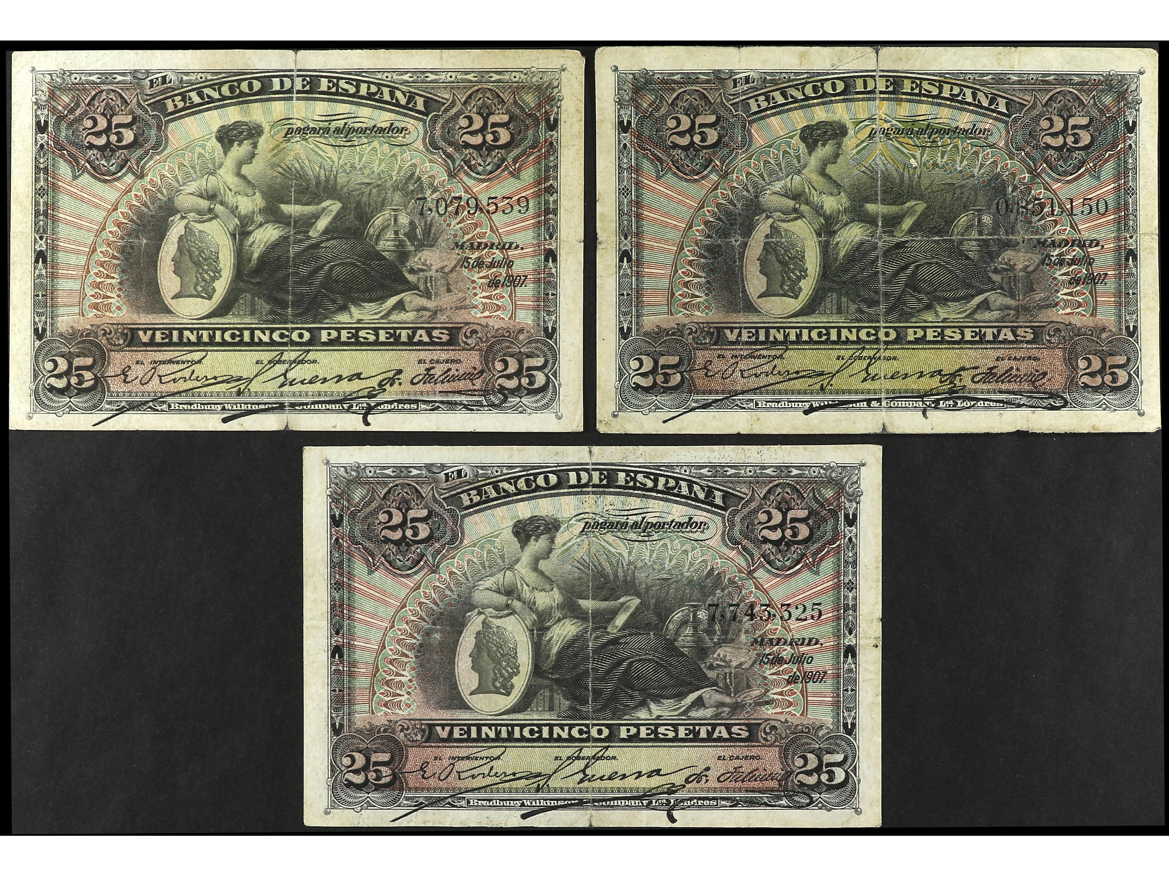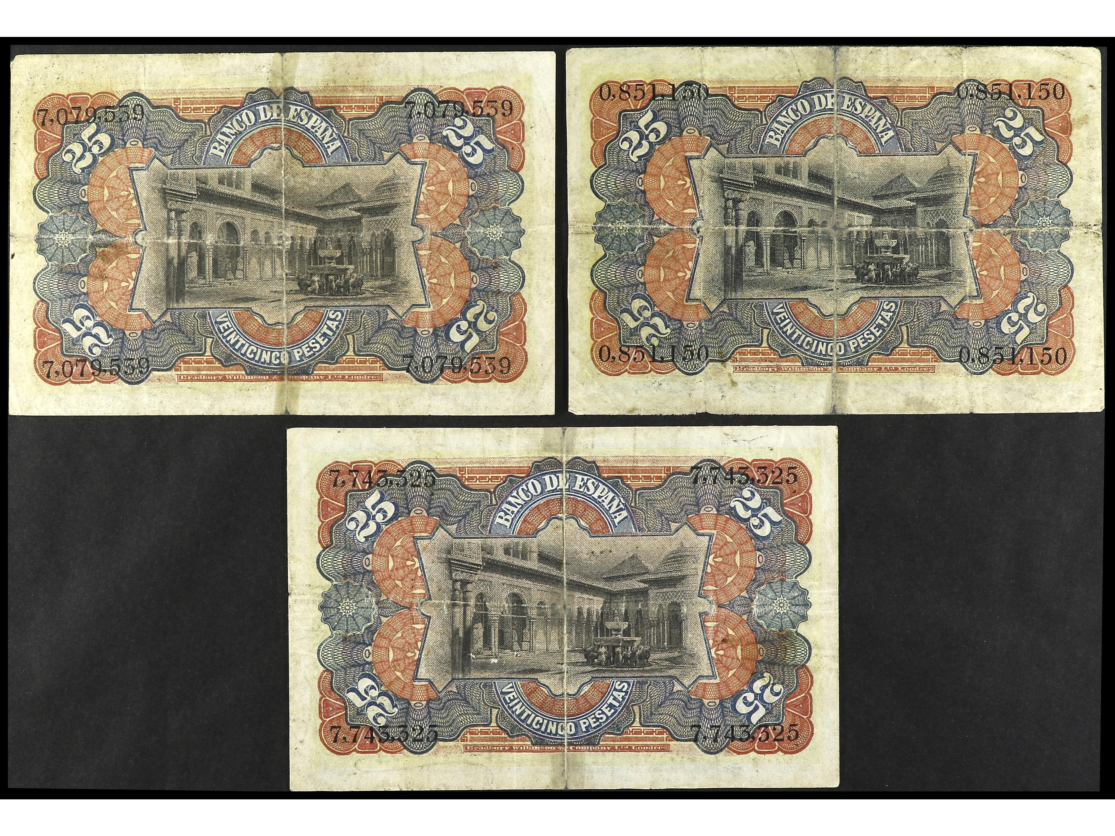 Lote 3 billetes 25 Pesetas. 15 Julio 1907. Patio de los Leones. Ed-318. MBC- a MBC. (Image1) (Image2)