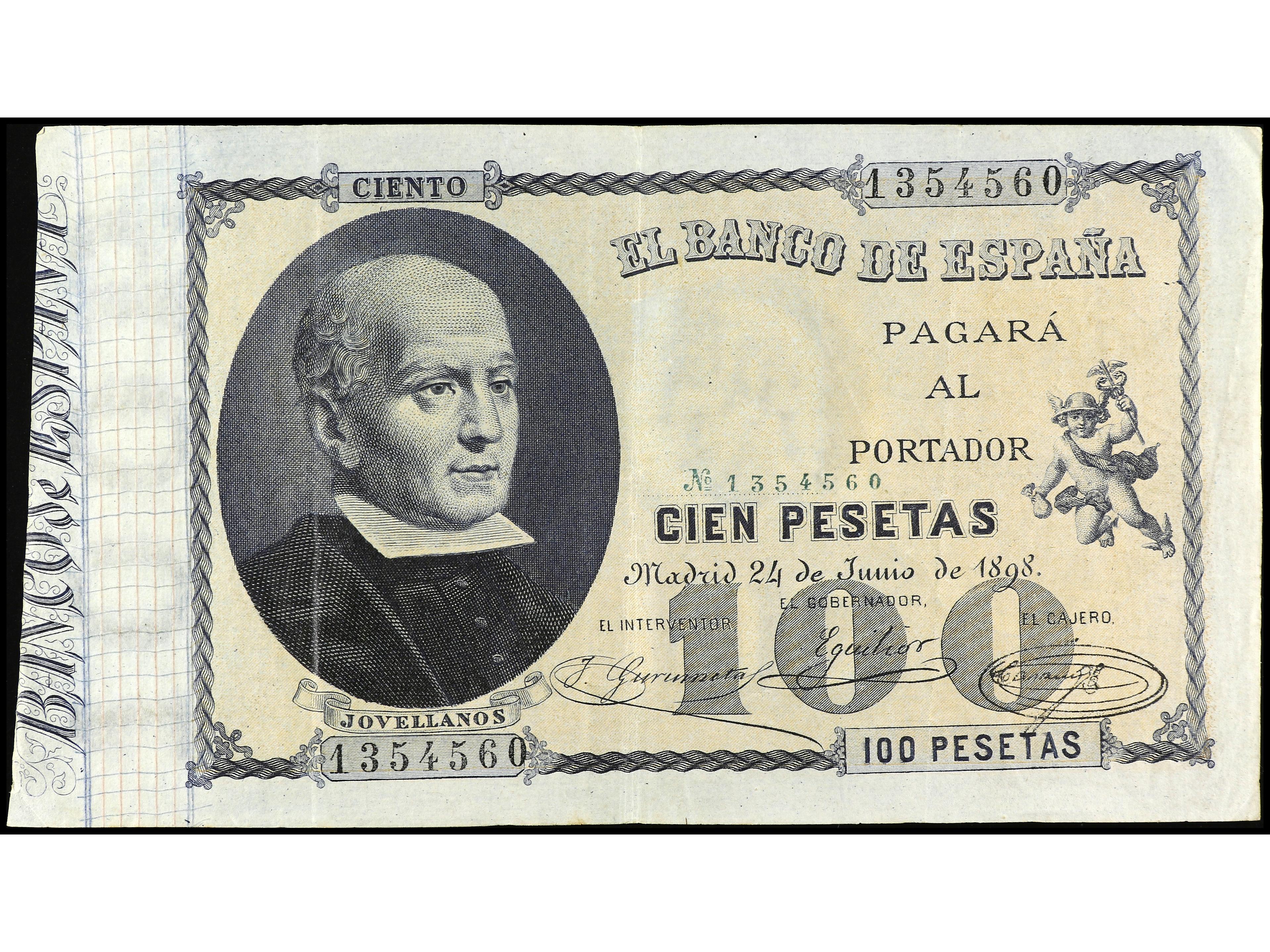 100 Pesetas. 24 Junio 1898. Jovellanos. (Alguna leve reparación). MUY ESCASO. Ed-305. MBC+. (Image1) (Image2)