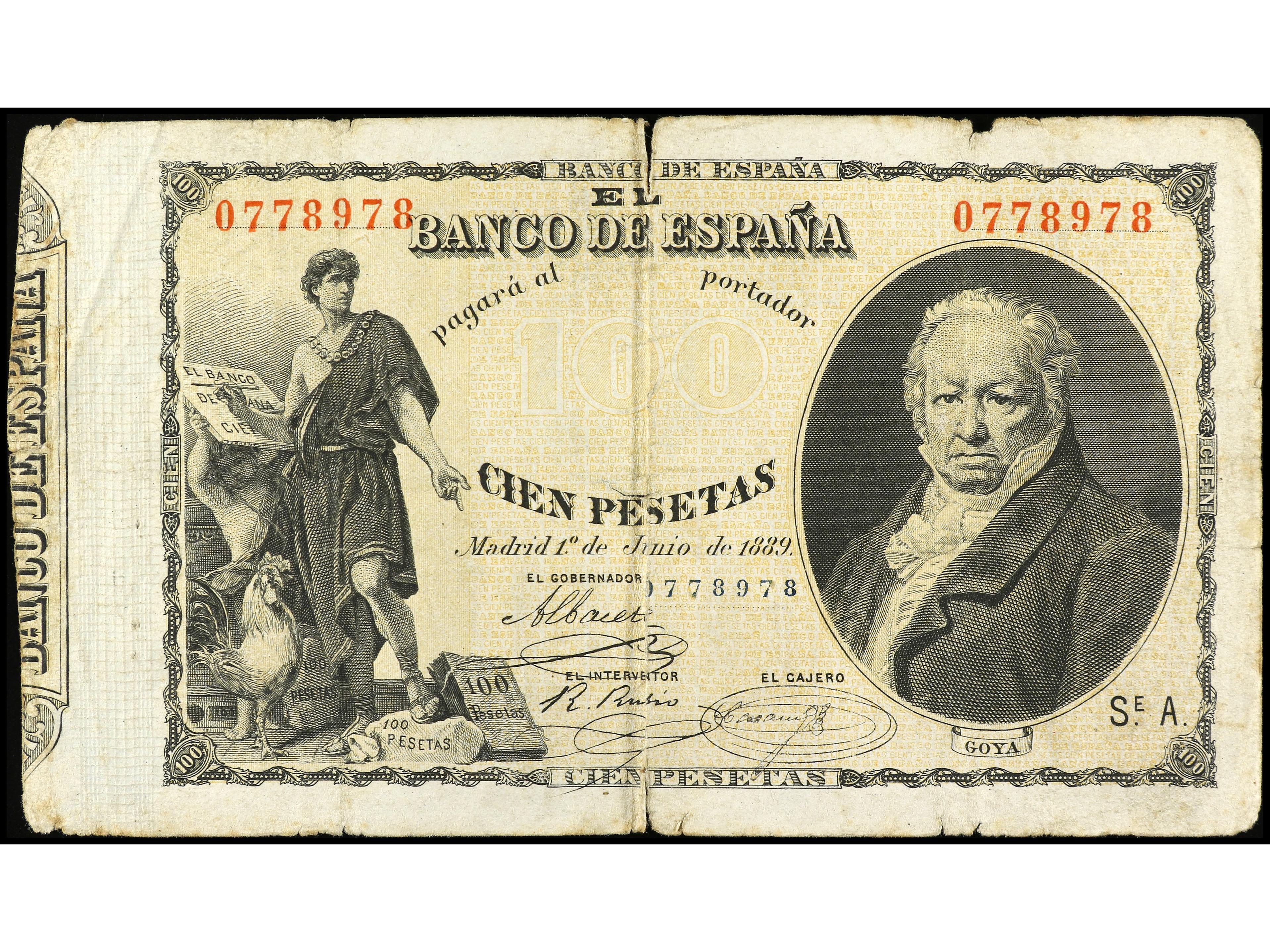 100 Pesetas. 1 Junio 1889. Goya. (Roturas). RARO. Ed-299. BC. (Image1) (Image2)